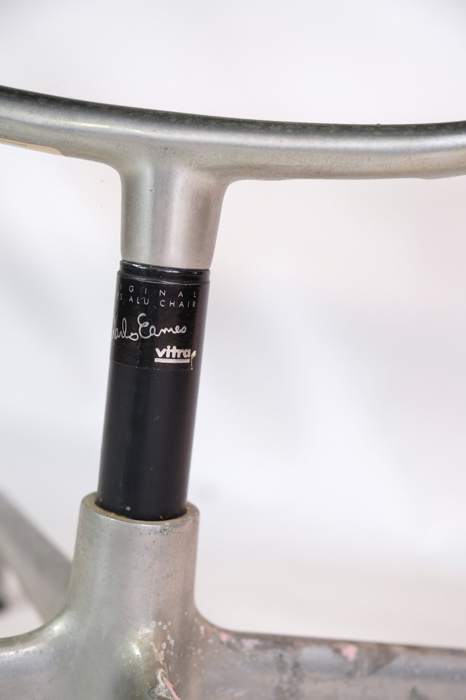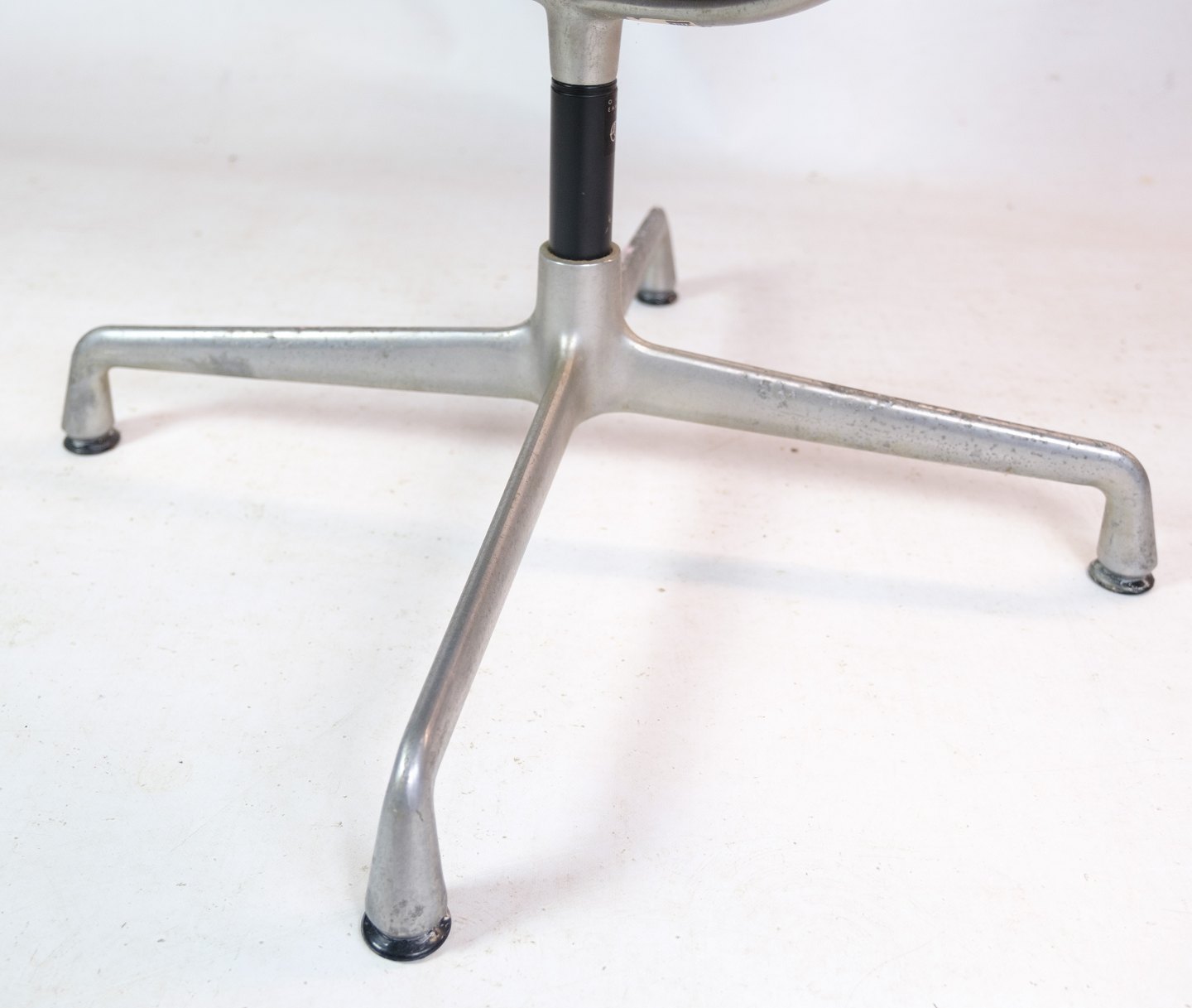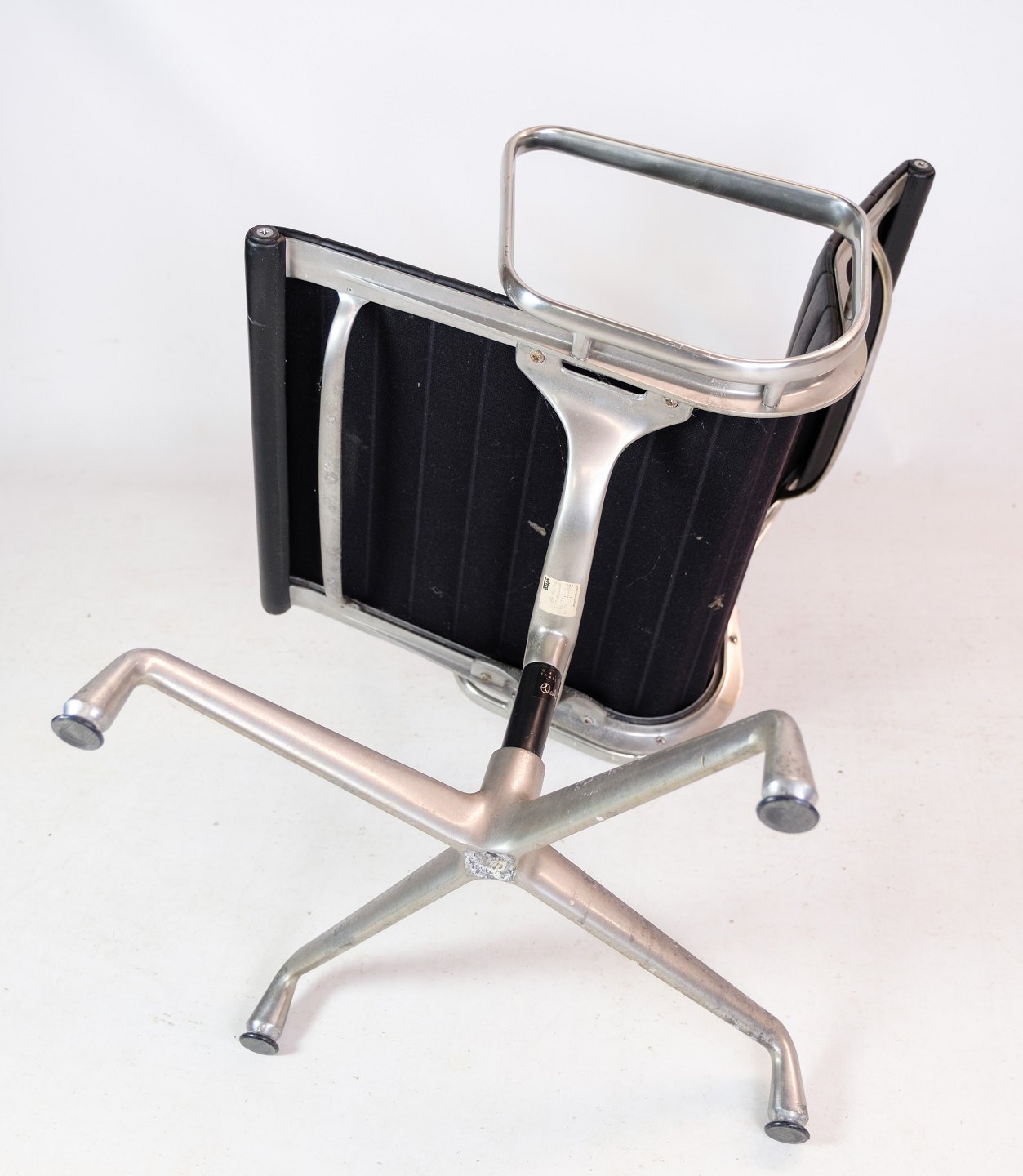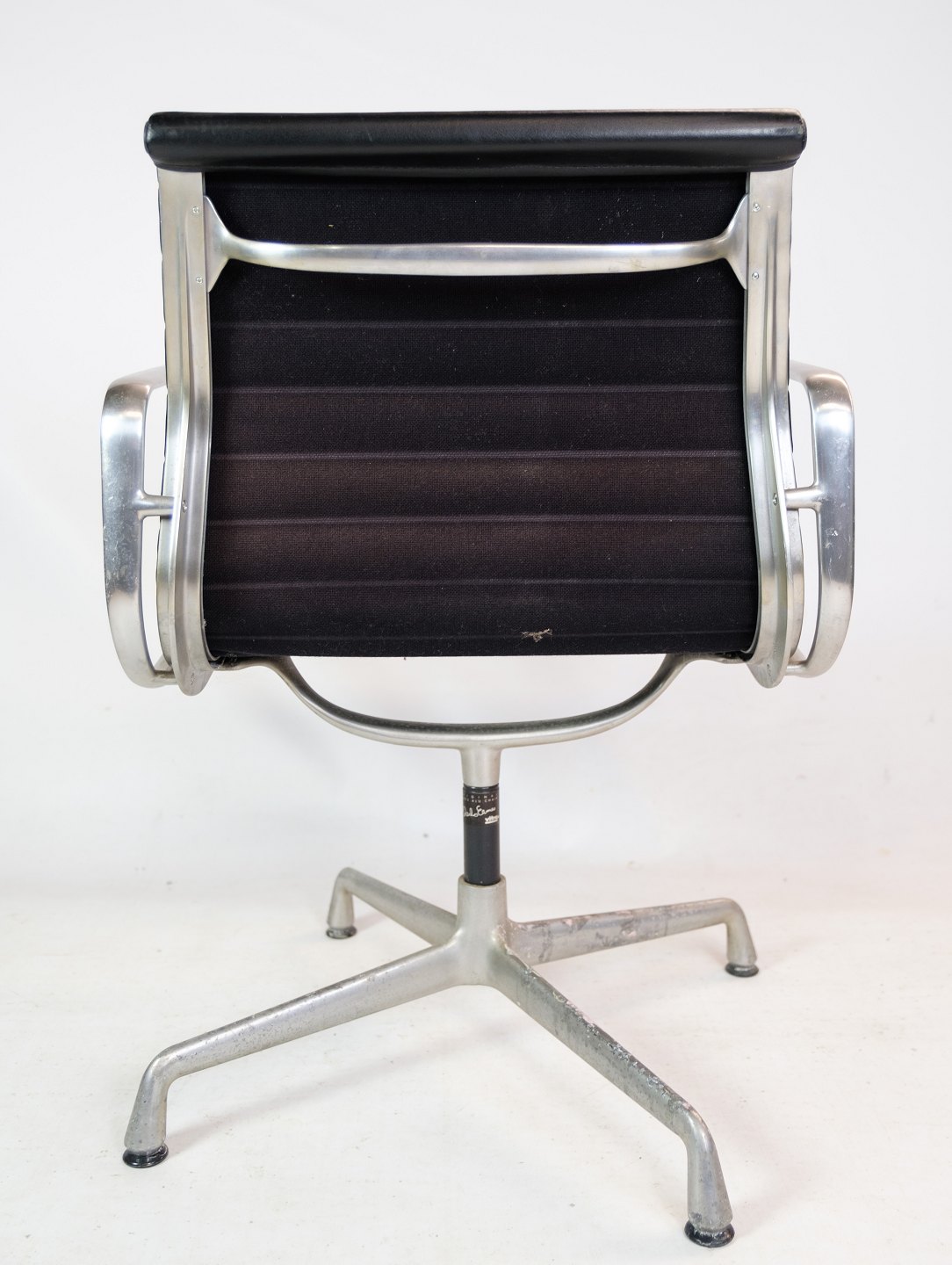 SolgtKontorstol / armstol, model Ea-108, designet af Charles Eames produceret af Vitra. Stolen har originalt sort læder og har patina, da det er en brugt stol. Stolen har en drejefunktion og originalt label. 4 på lager