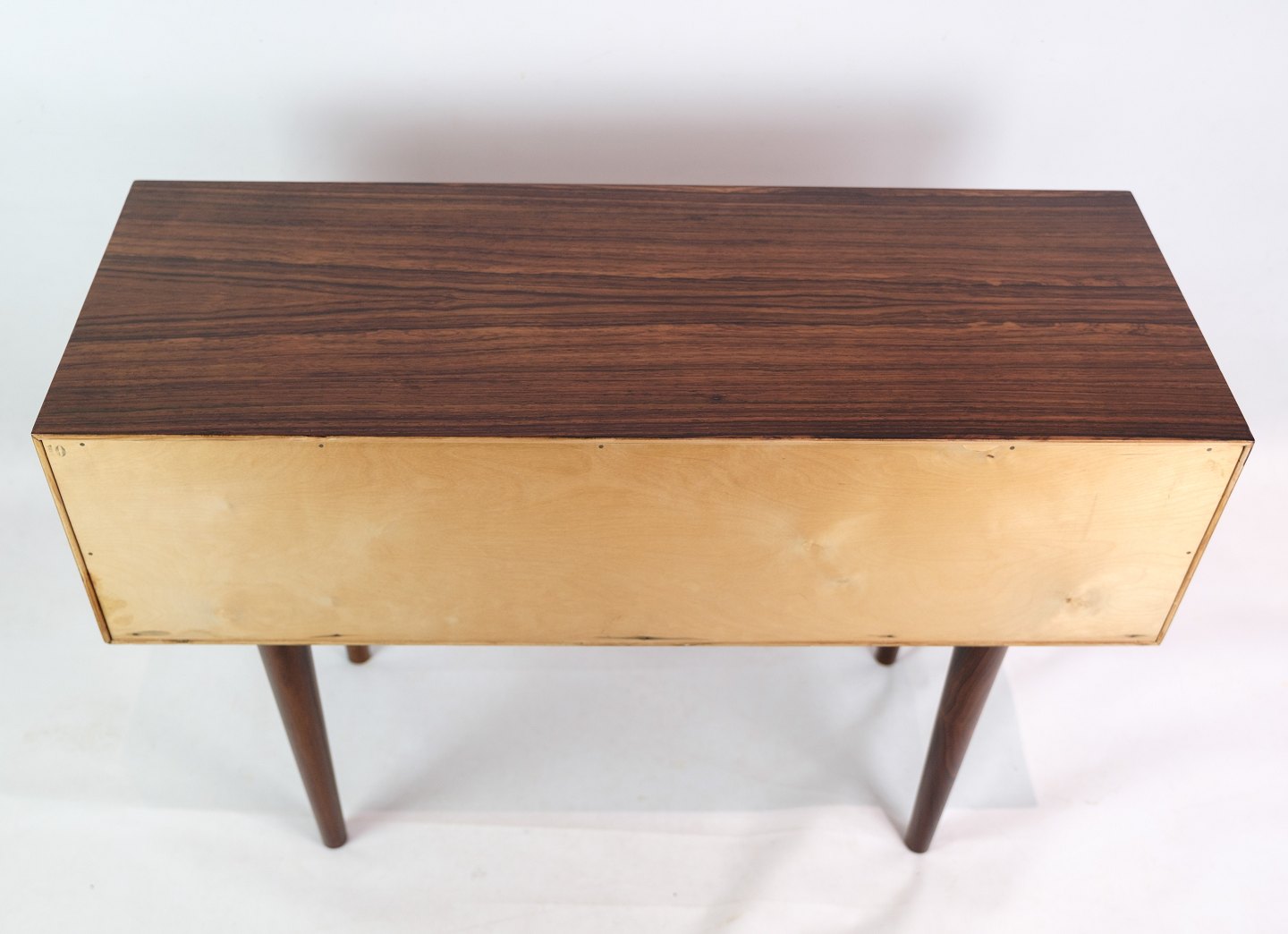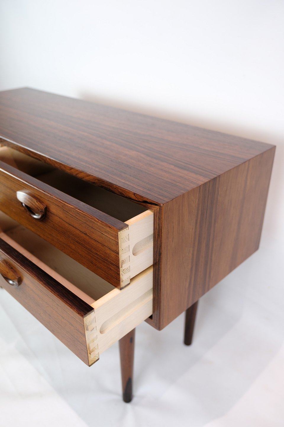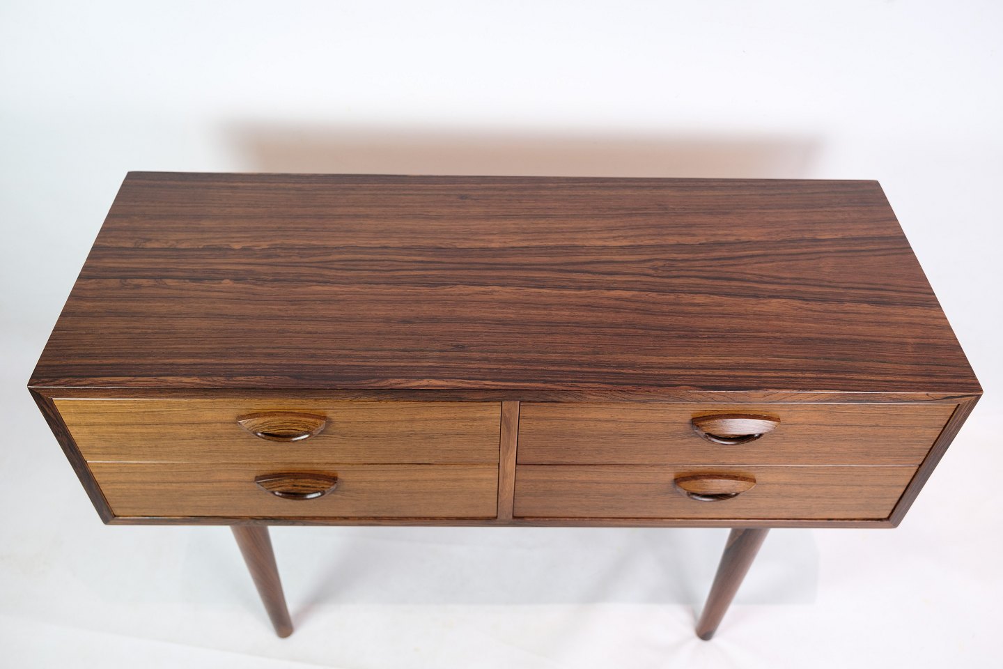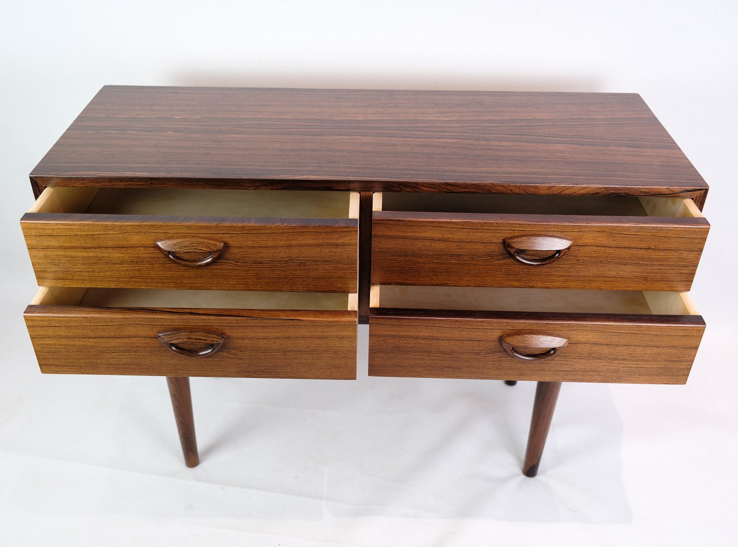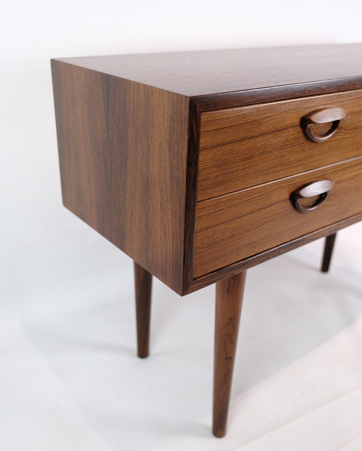 SolgtLav kommode, designet af Kai Kristensen i palisander med fire front skuffer fra omkring 1960'erne. Kan bruges som f.eks. Tv-møbel.