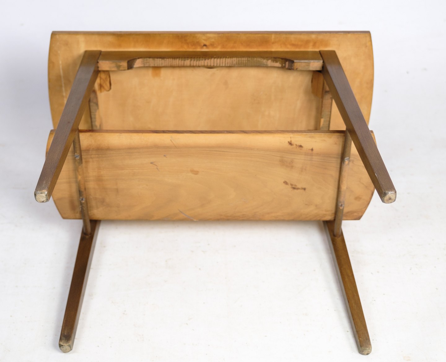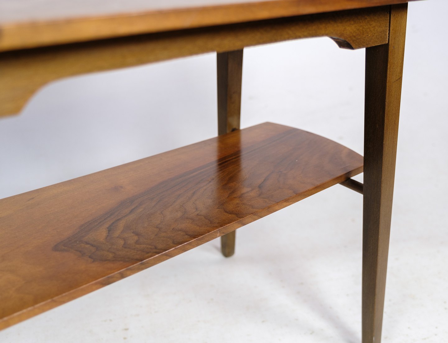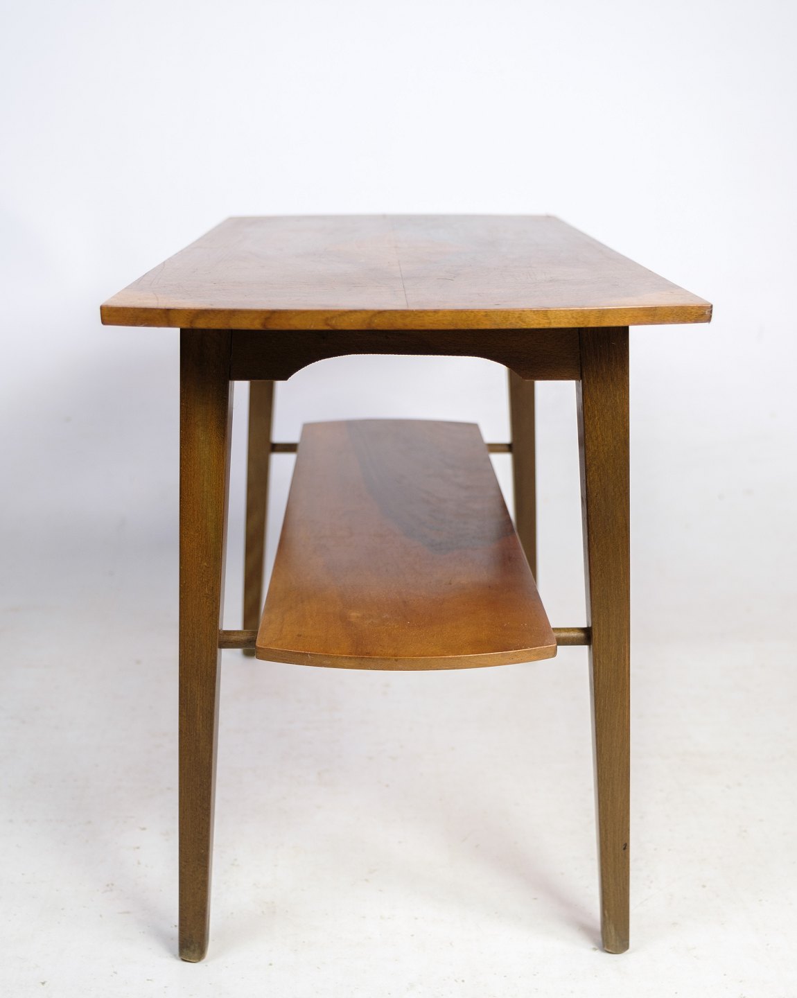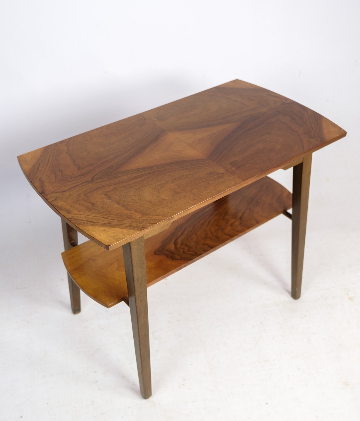 Side table in walnut wood with a nice structure on the top, as well as a shelf from around the 1960s.