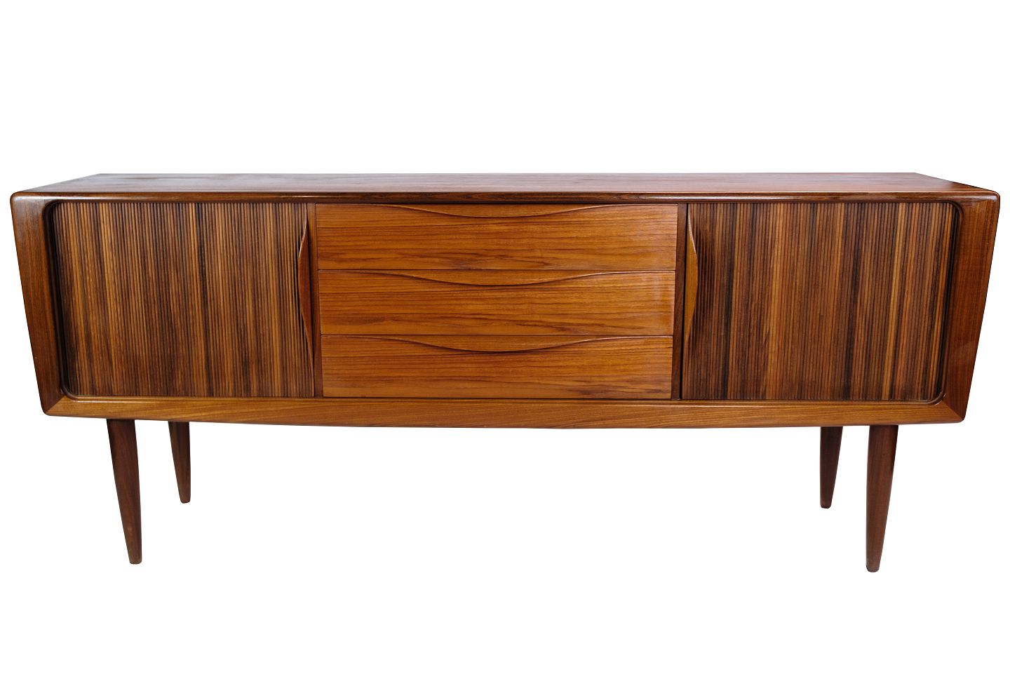 SoldSideboard, designed by Johannes Andersen in teak wood from around the 1960s. The sideboard has 3 drawers in the middle with attractive handles. On each side there are jalousie doors with a shelf on each side. A sideboard of very high quality.