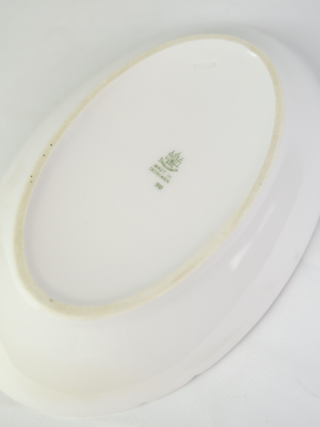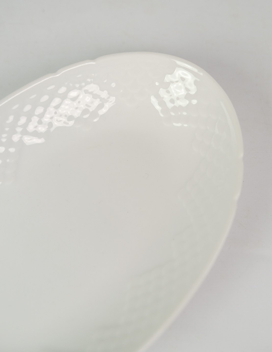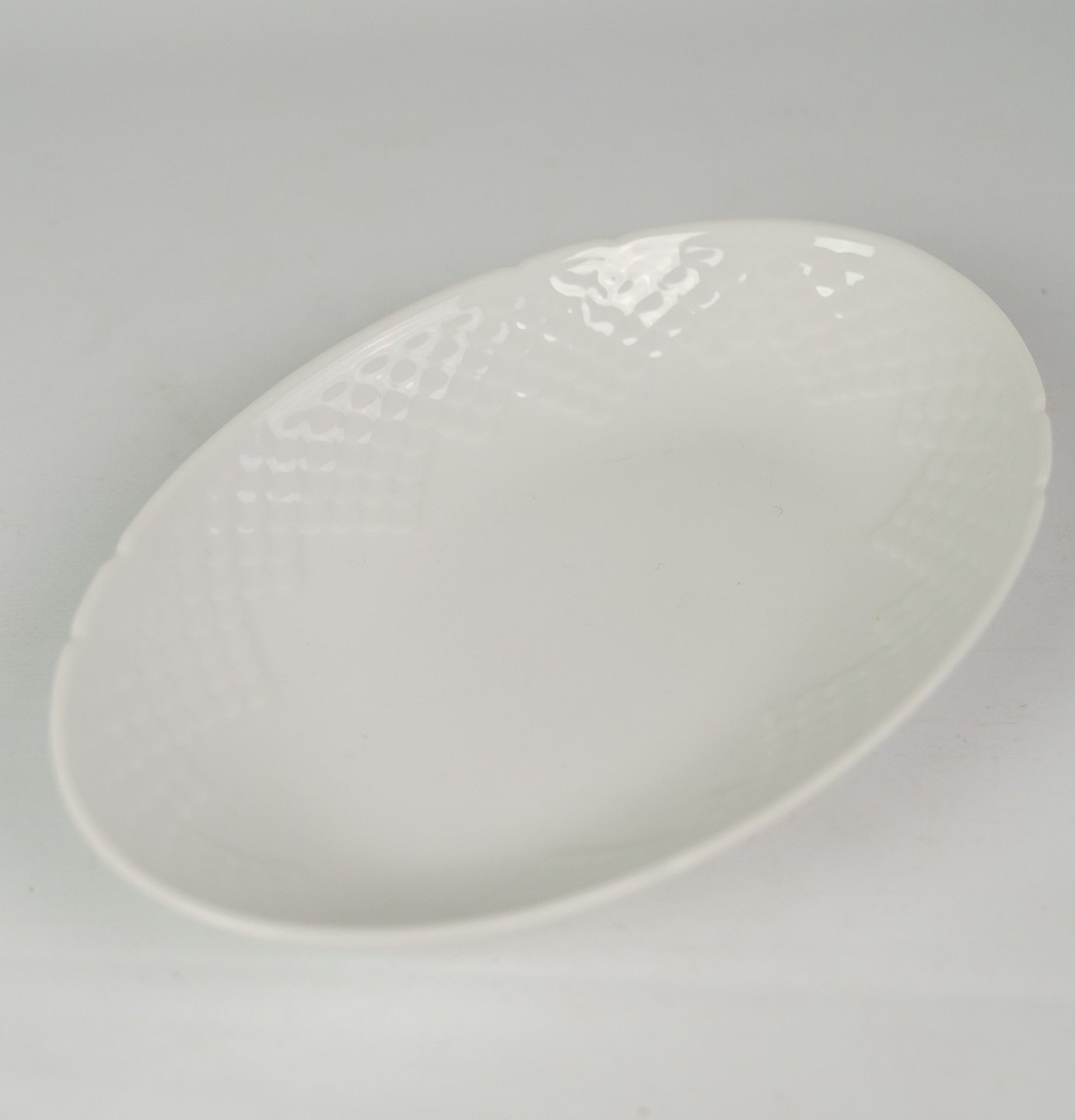 Hvid riflet ovalt fad fra Bing & Grøndahl fra omkring år 1950'erne.