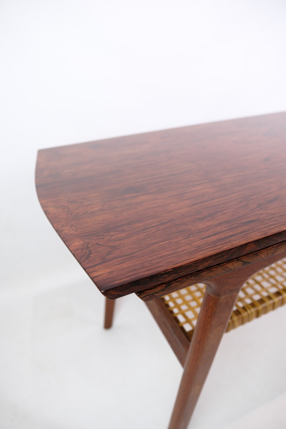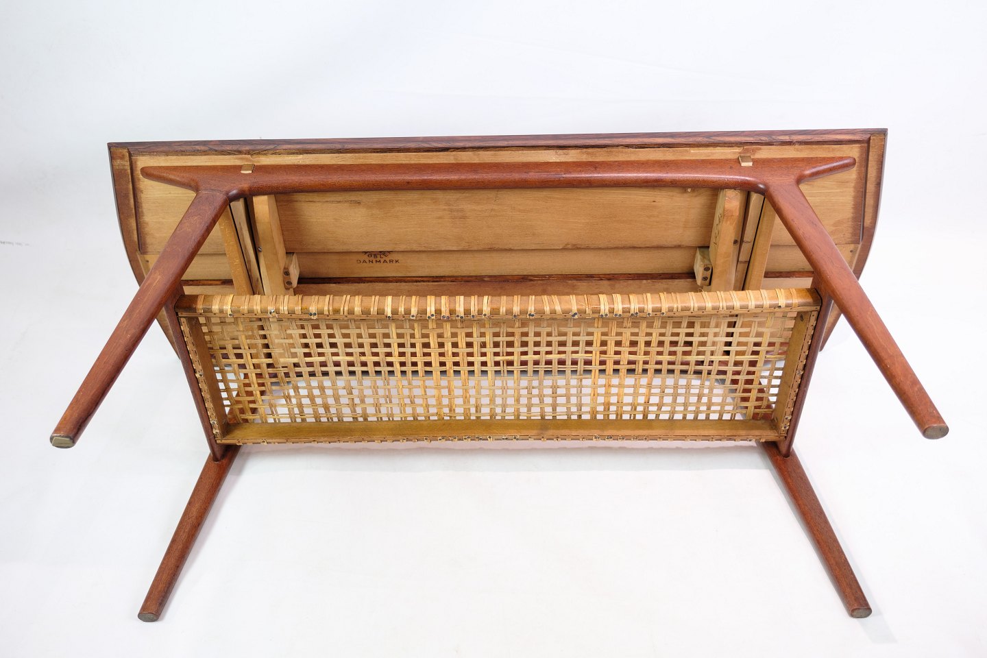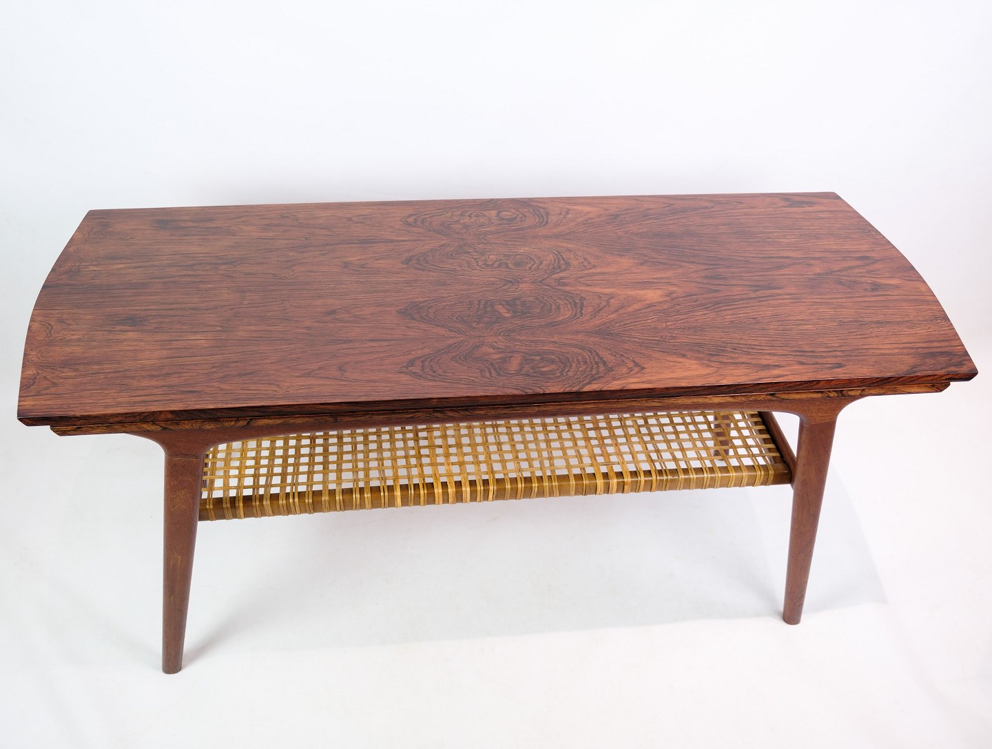 SoldCoffee table in rosewood by Heltborg Møbler Denmark with underlying wicker hearth from around the 1960s. The coffee table also has pull-out plates on each side, which make it 47 cm and 87 cm wide respectively.