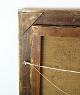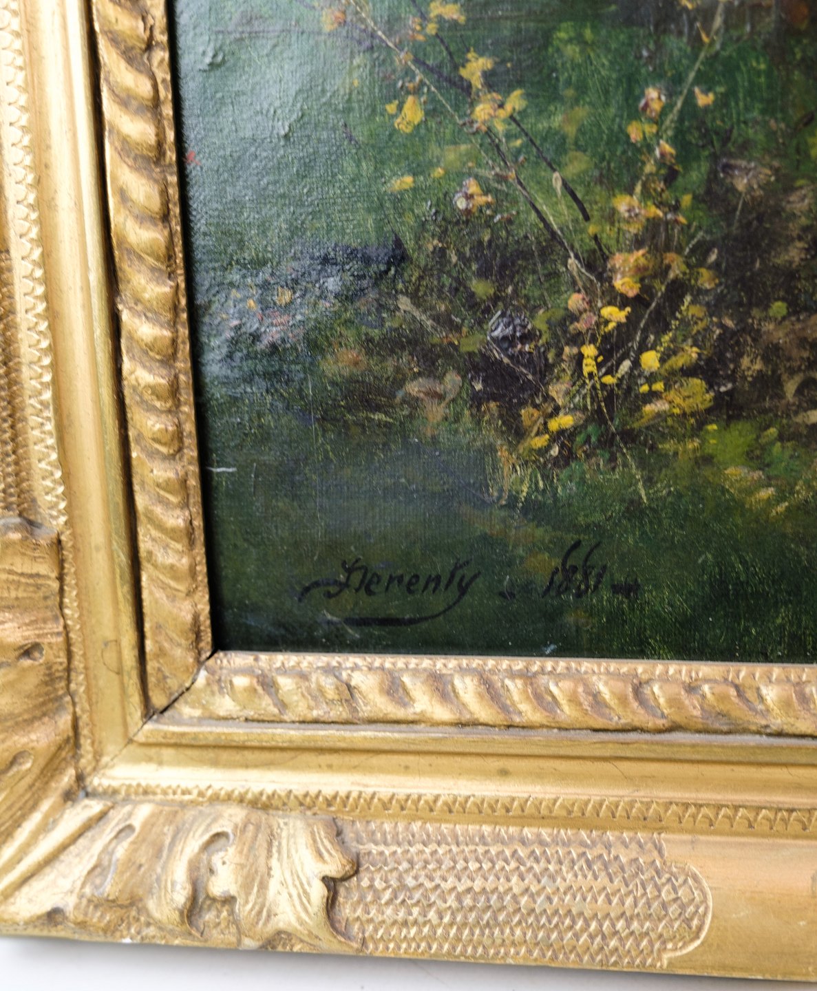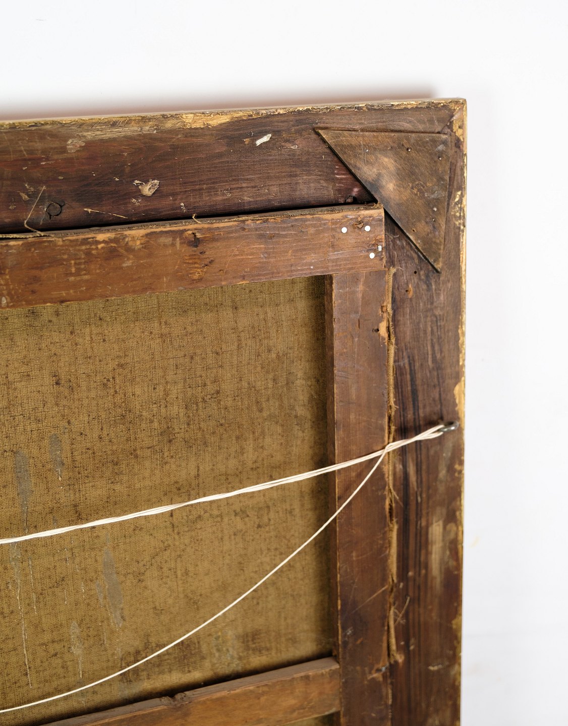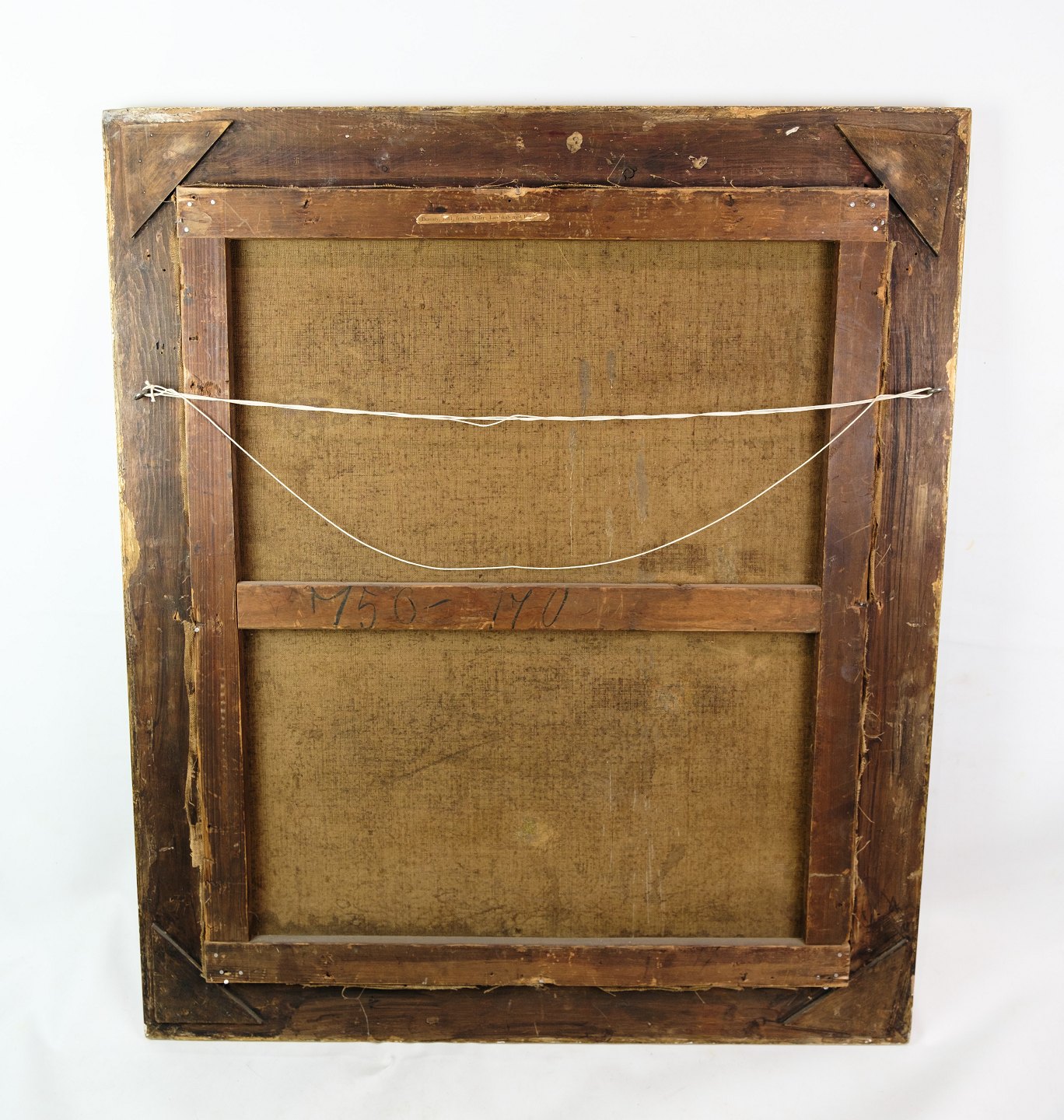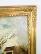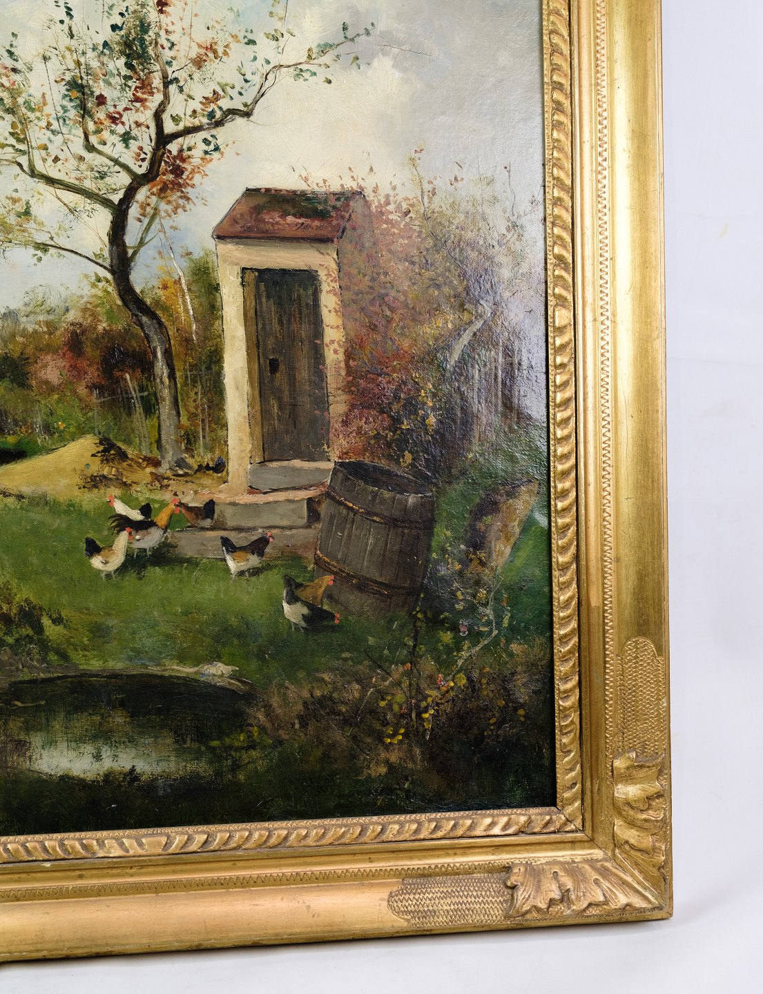 Fine art in the form of landscape oil painting on canvas with motif of church, chickens and toilet in backyard from 1881. Signed