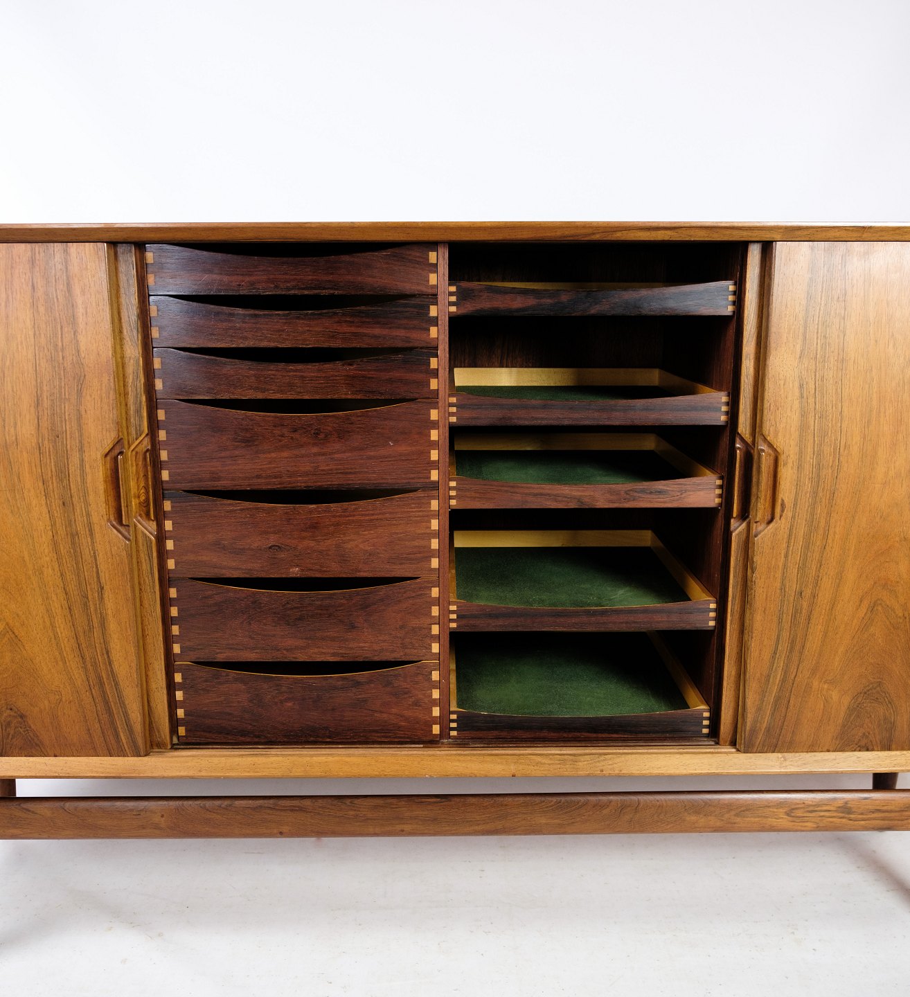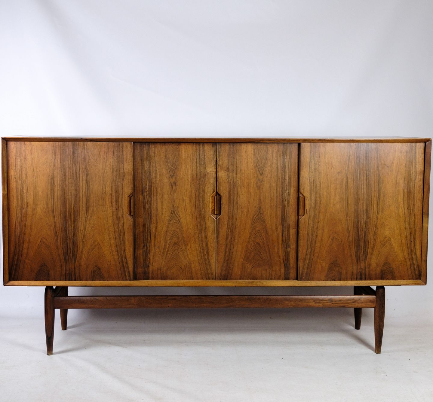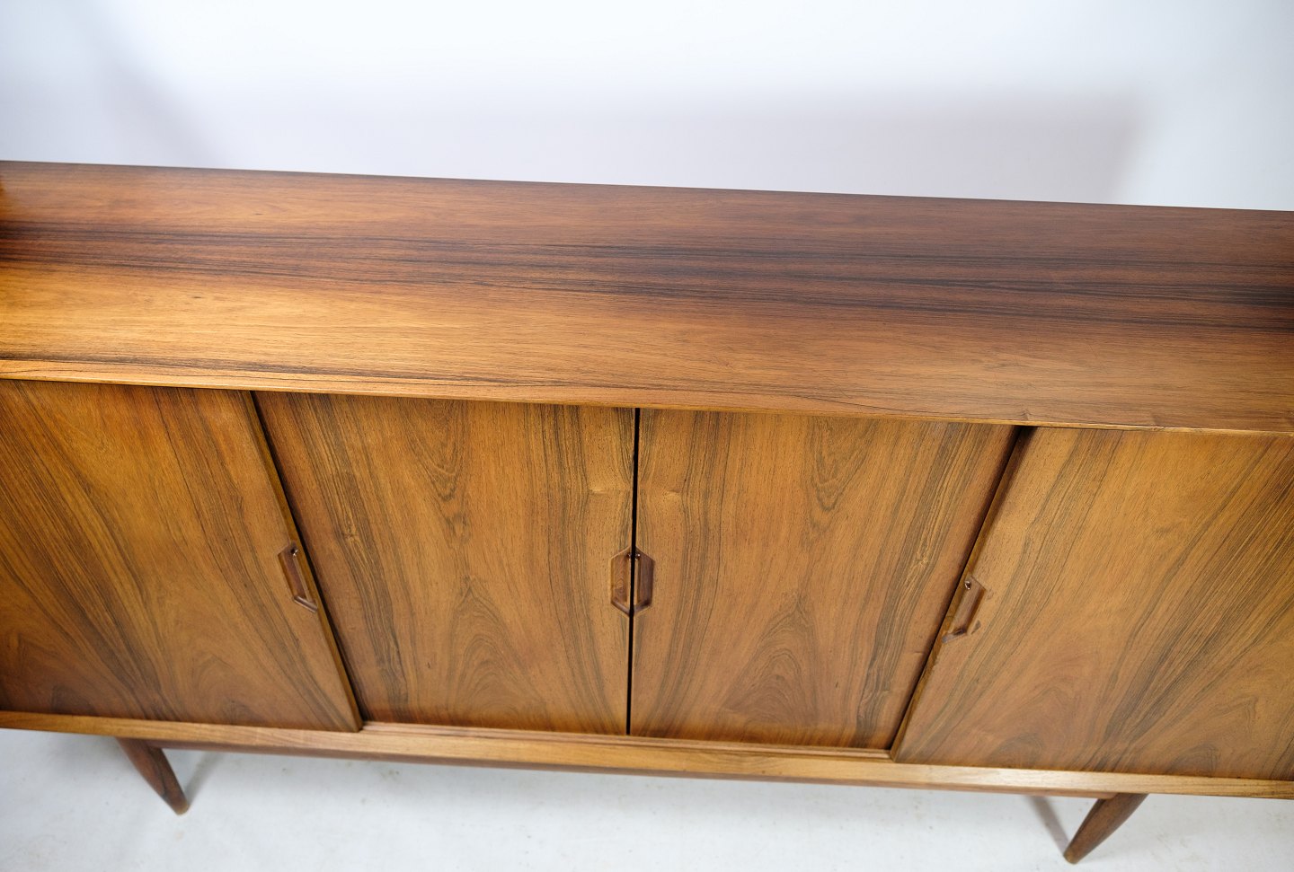 SoldThis tall sideboard in rosewood is a magnificent example of Danish furniture design from the 1960s. The beautiful rosewood, which is known for its rich color and unique seasonal patterns, gives the sideboard a warm and inviting radiance. Every detail is carefully executed, which reflects the high quality and fine craftsmanship that characterizes Danish design at this time.
