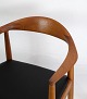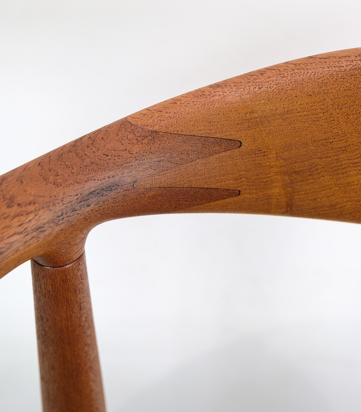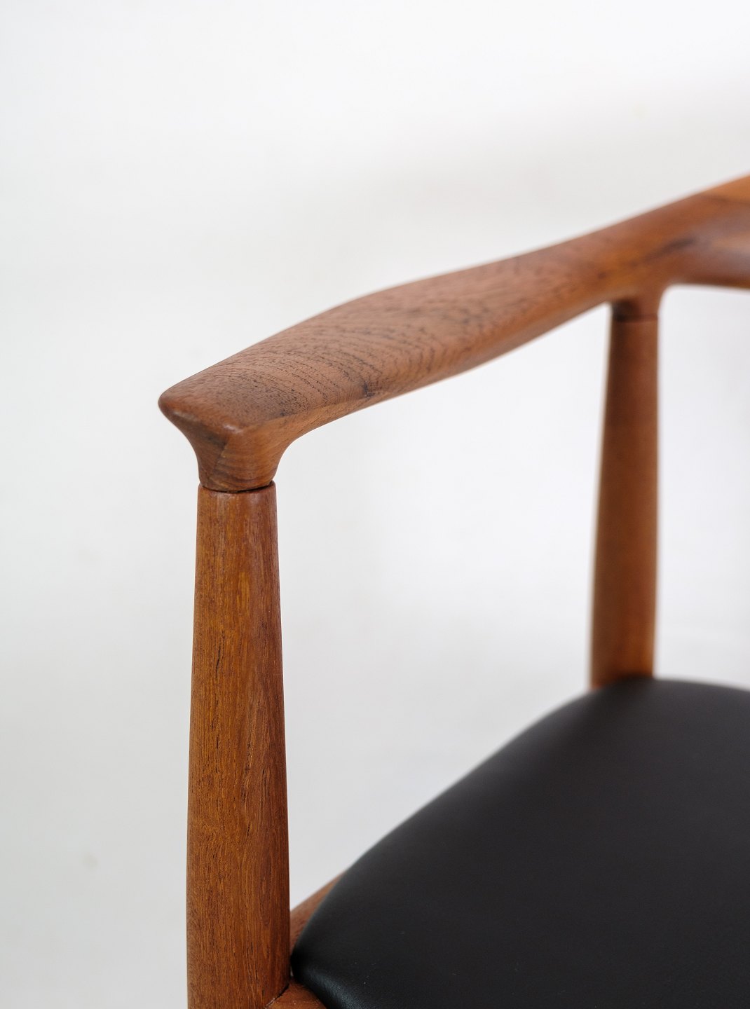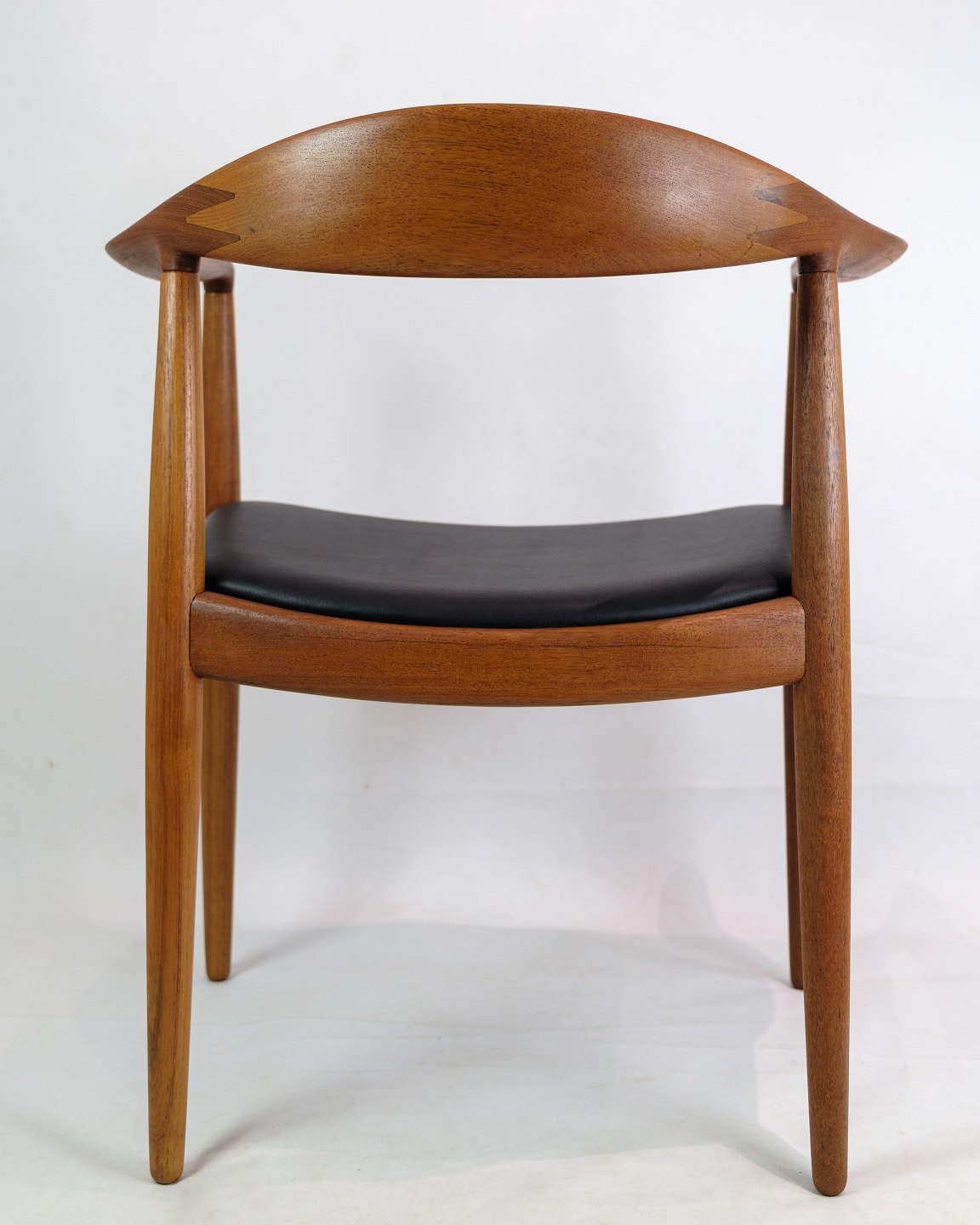 This is a teak and leather chair designed by Hans J. Wegner for Johannes Hansen in the 1950s. The model JH 503 is known as "The Chair" or "The Round Chair" and is a collector's item due to its quality and exceptional design. The chair has a superb processed teak structure, nice joinery for armrests and back and a large leather seat. We are able to get additional pieces of this item in stock so if you want a set of four that is an option to consider.