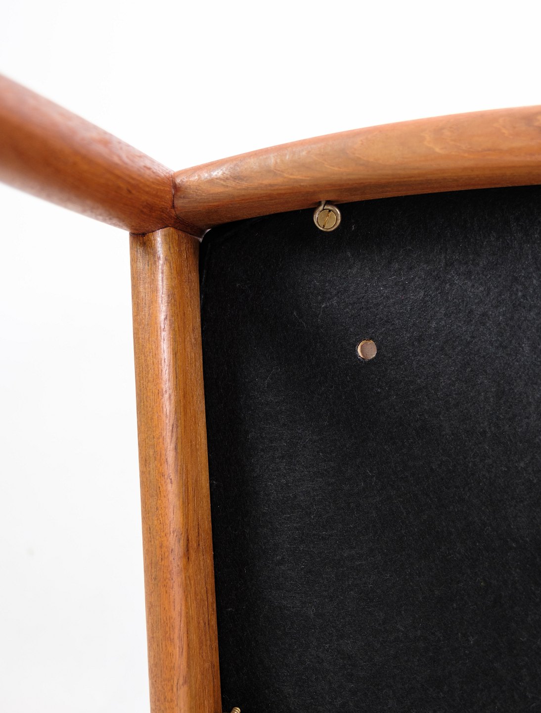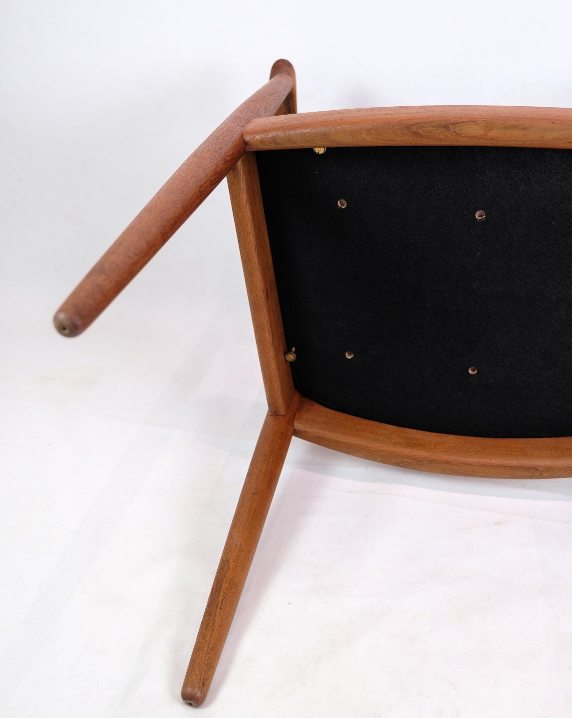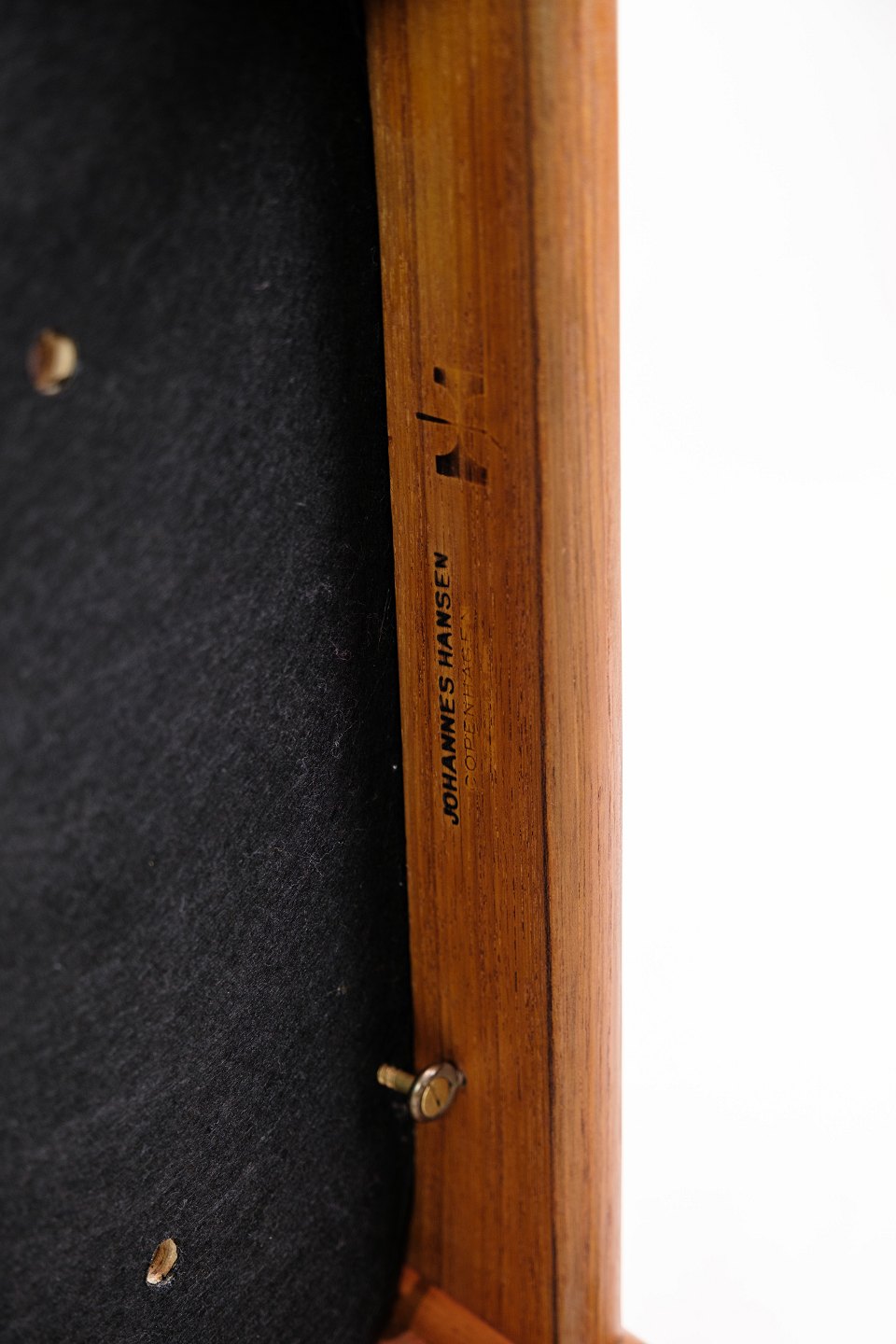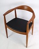 This is a teak and leather chair designed by Hans J. Wegner for Johannes Hansen in the 1950s. The model JH 503 is known as "The Chair" or "The Round Chair" and is a collector's item due to its quality and exceptional design. The chair has a superb processed teak structure, nice joinery for armrests and back and a large leather seat. We are able to get additional pieces of this item in stock so if you want a set of four that is an option to consider.