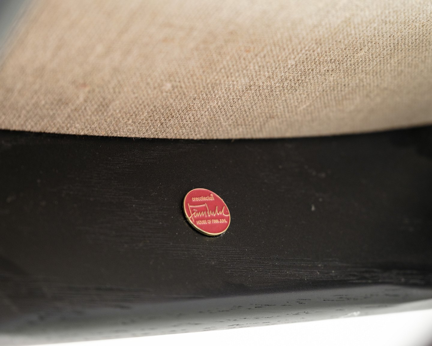 Finn Juhl's unique design philosophy, which focuses on separating the load-bearing from the carried and creating space and gaps, is fully realized here. This beautiful chair appears both padded and comfortable, while maintaining a light and airy appearance.