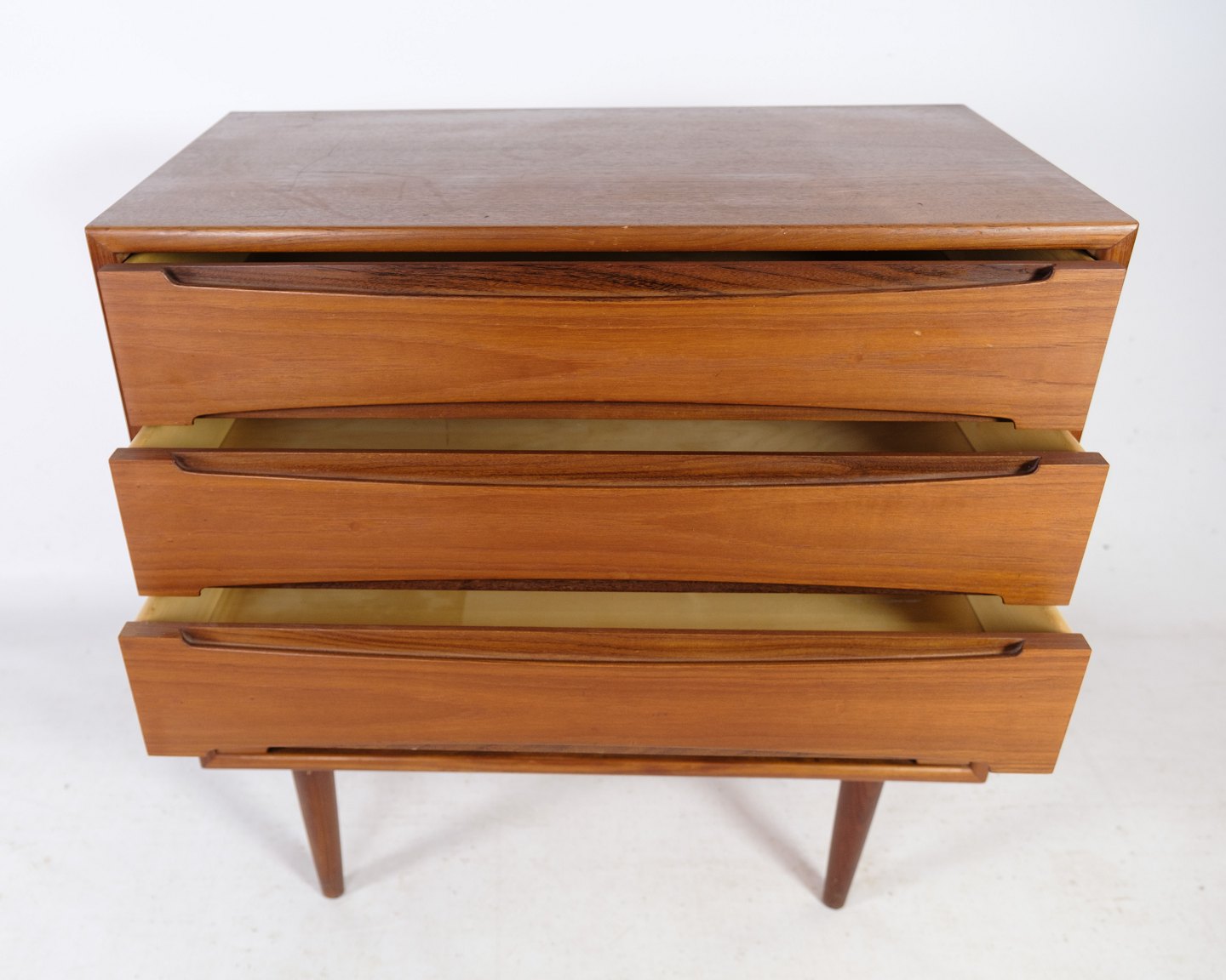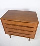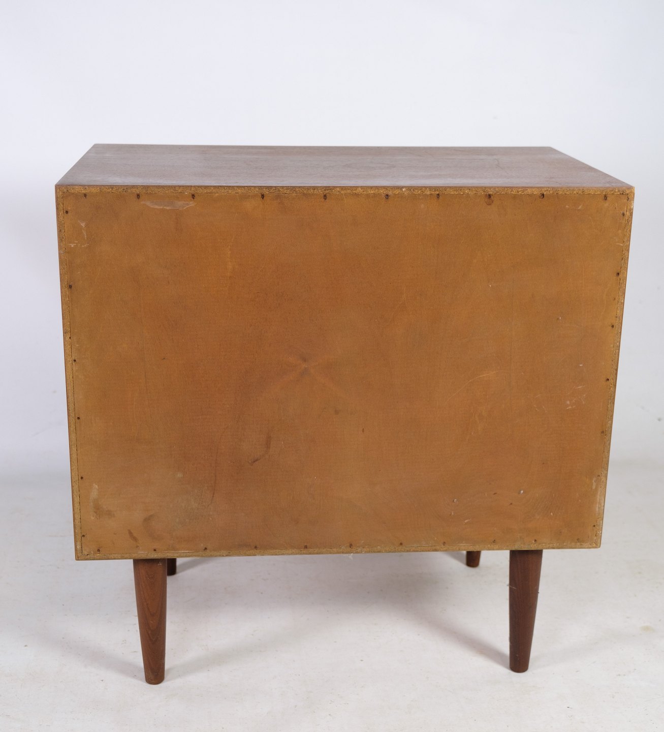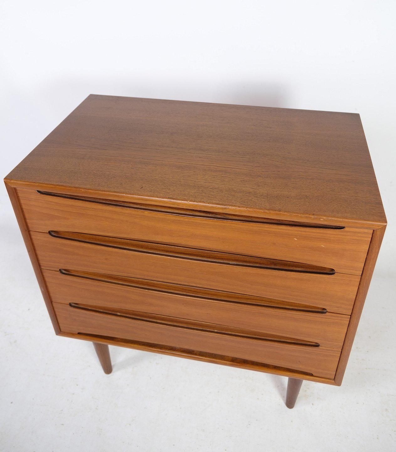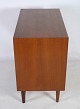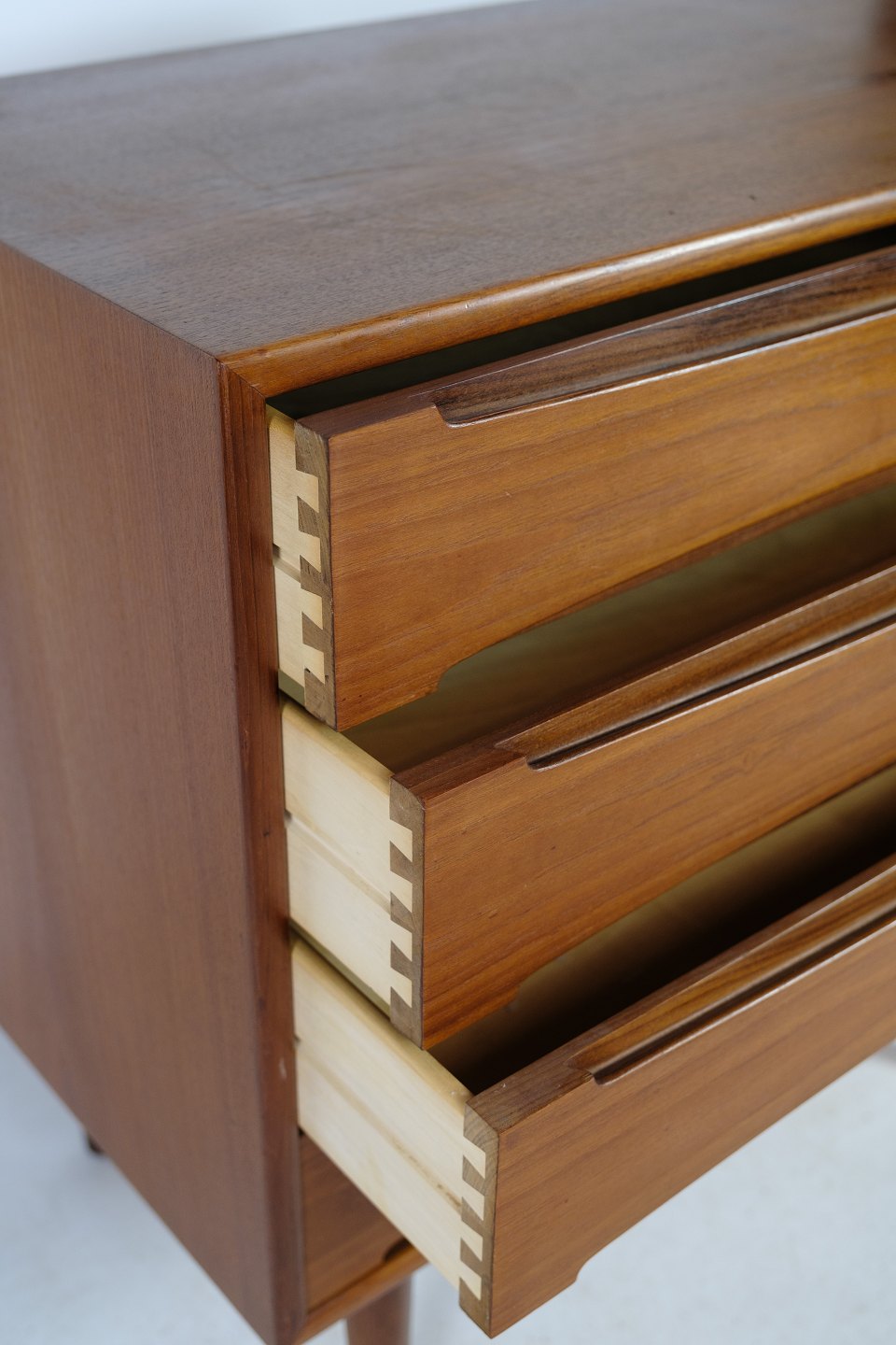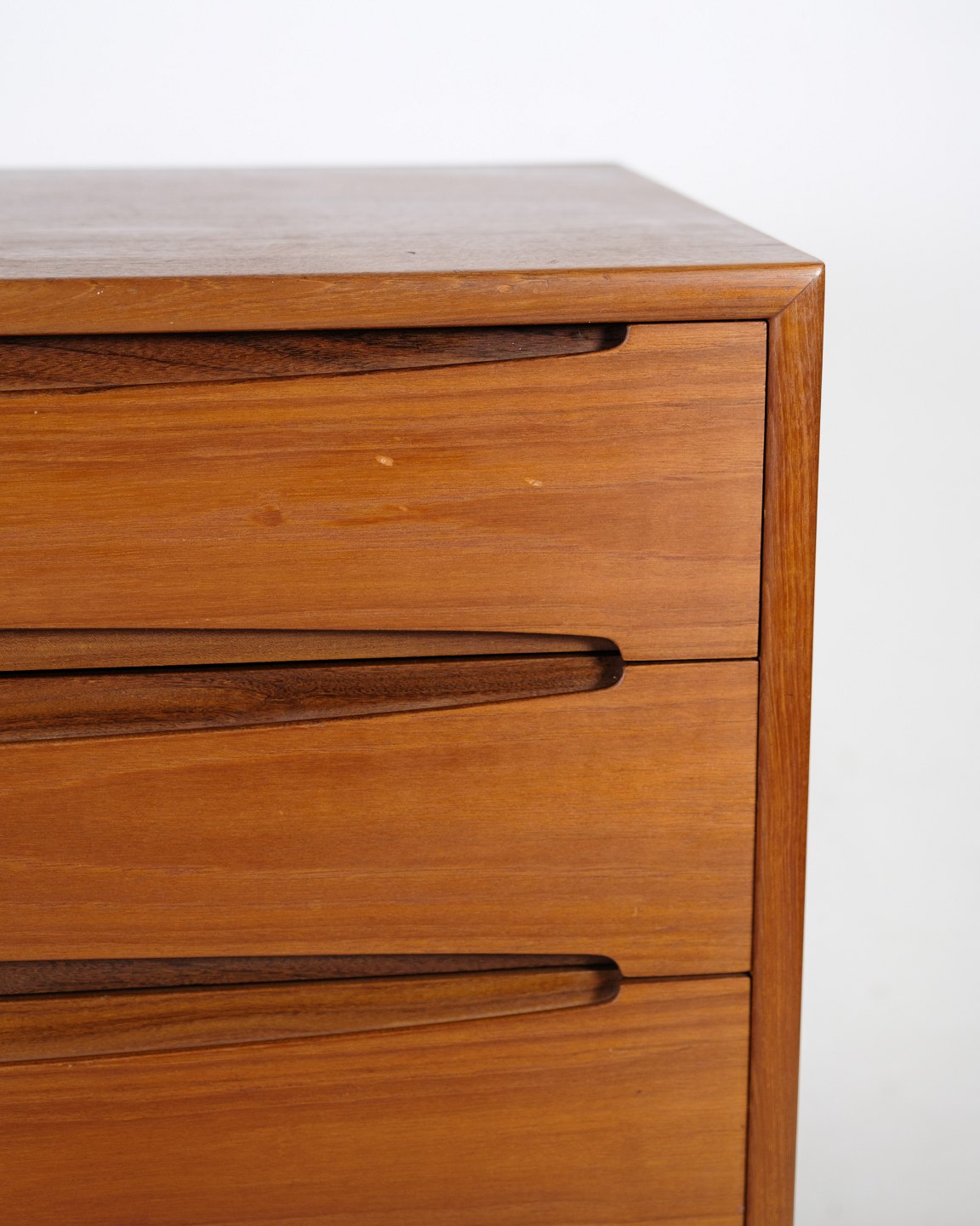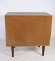 Denne fantastiske kommode af design fra 1960'erne. Den har en markant butterfly foran, som tilføjer et unikt touch til stykket. Kisten er lavet med materialer af høj kvalitet og fremragende håndværk. Det anvendte træ er et smukt, varmt tonet træ, og skufferne er glatte at åbne og lukke. Dette stykke ville være en vidunderlig tilføjelse til ethvert moderne inspireret interiør fra midten af århundredet.