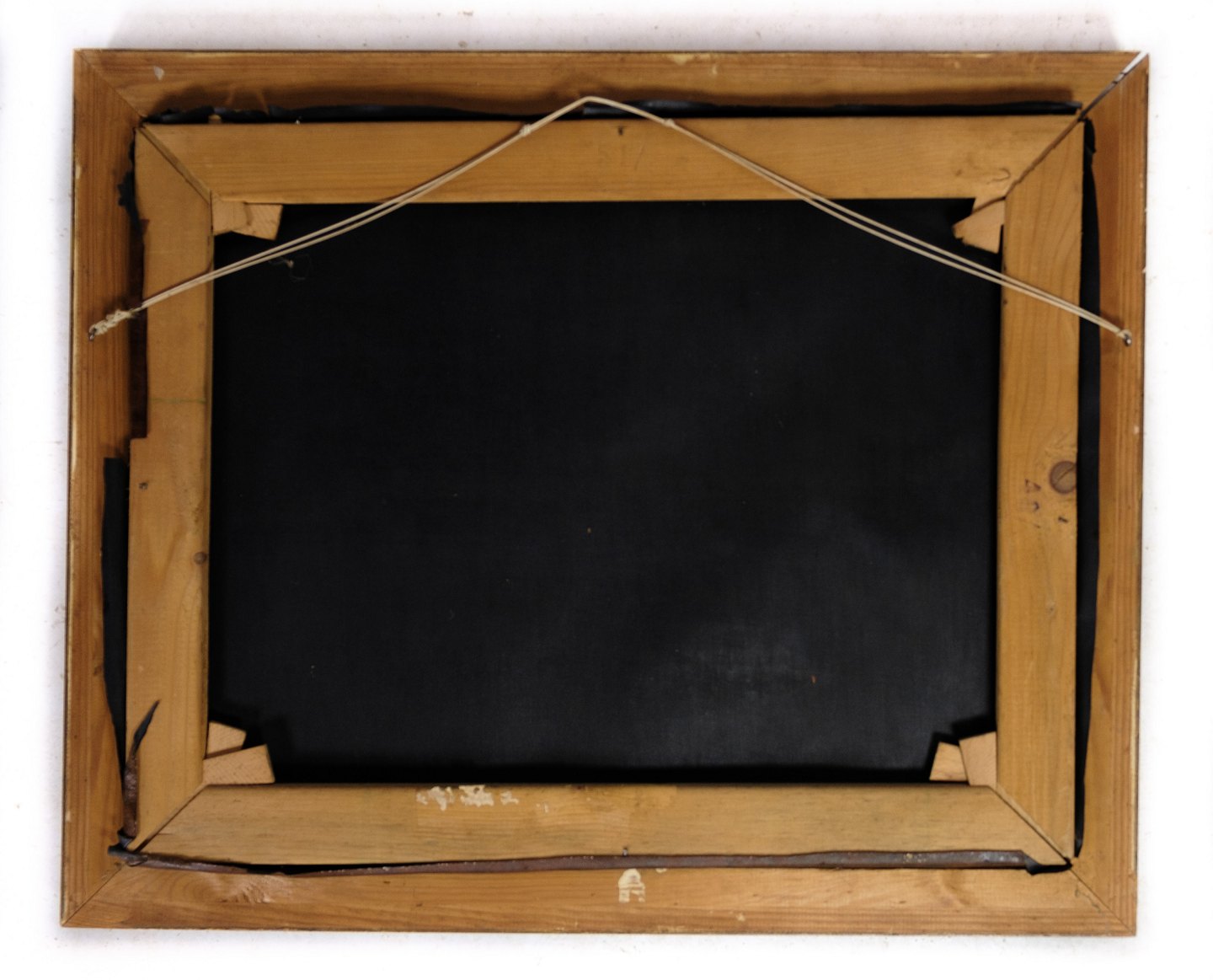Painting on canvas in gold frame of town house and water in blue colors from around the 1930s.