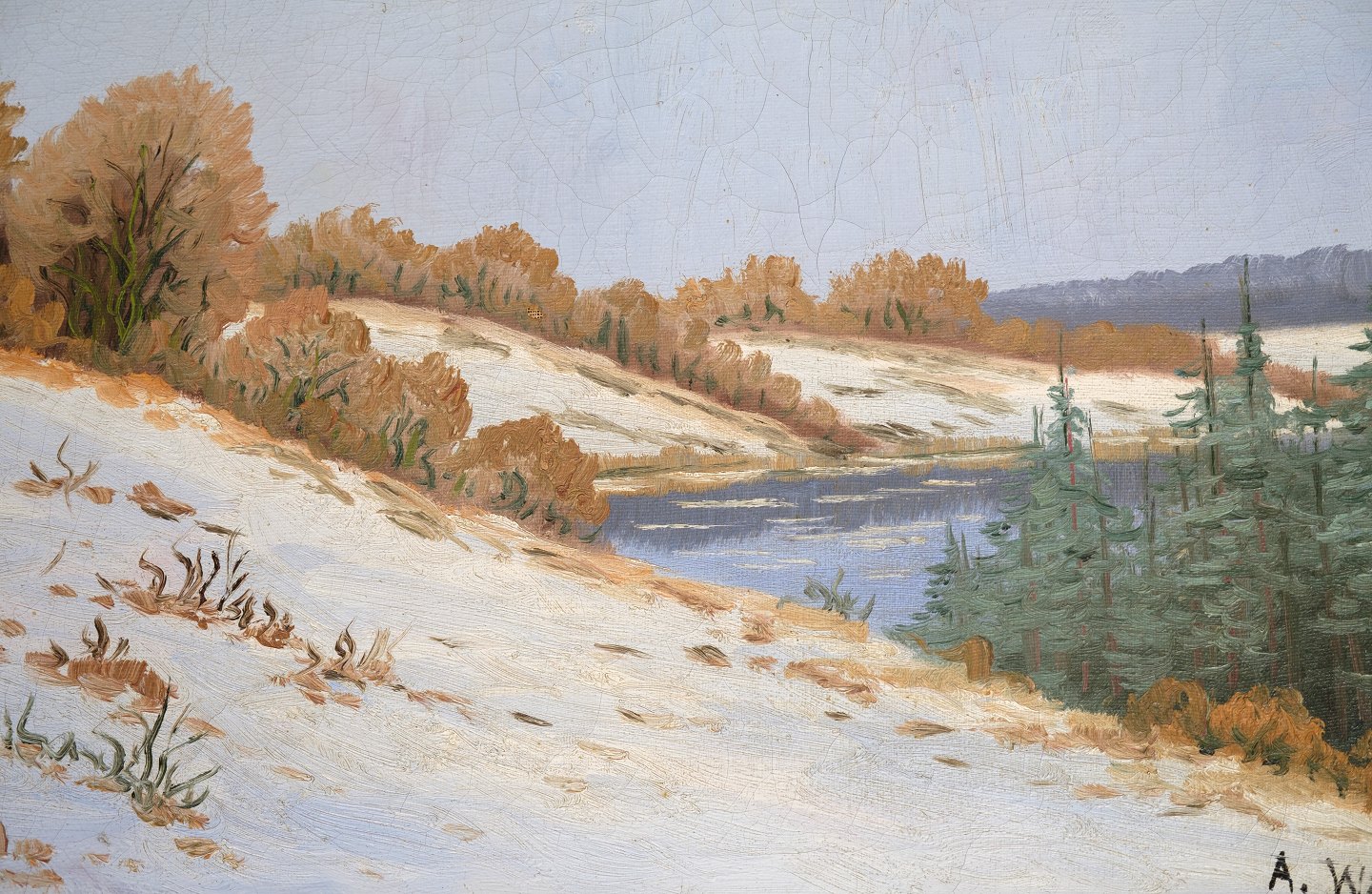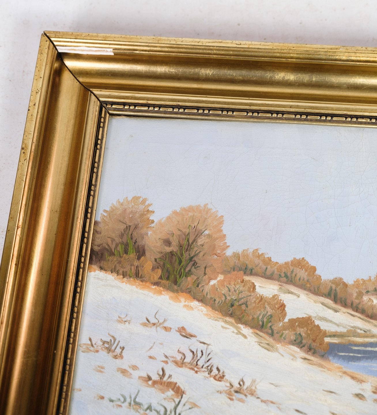 Maleri på lærredet i guldramme af landskab med sne og hvide farver fra omkring 1930'erne.