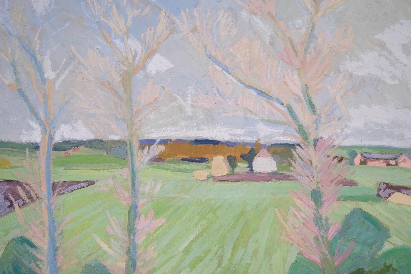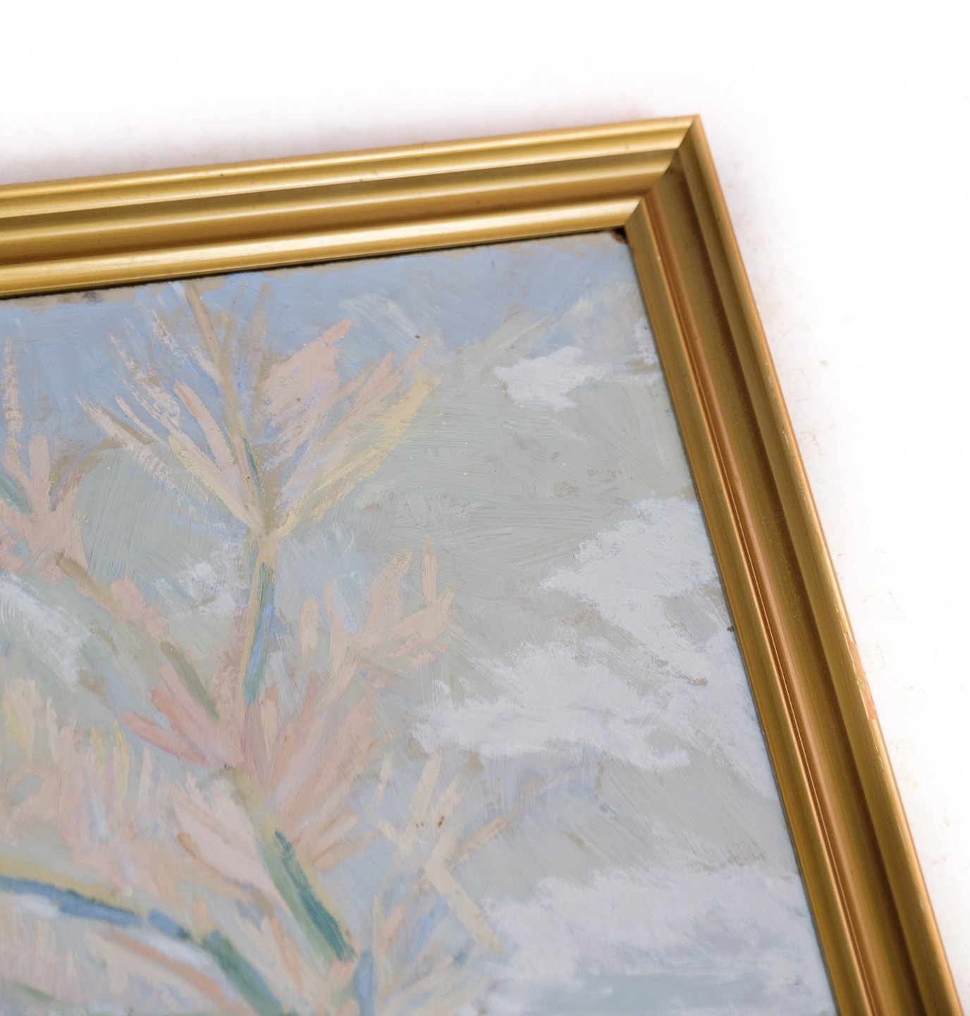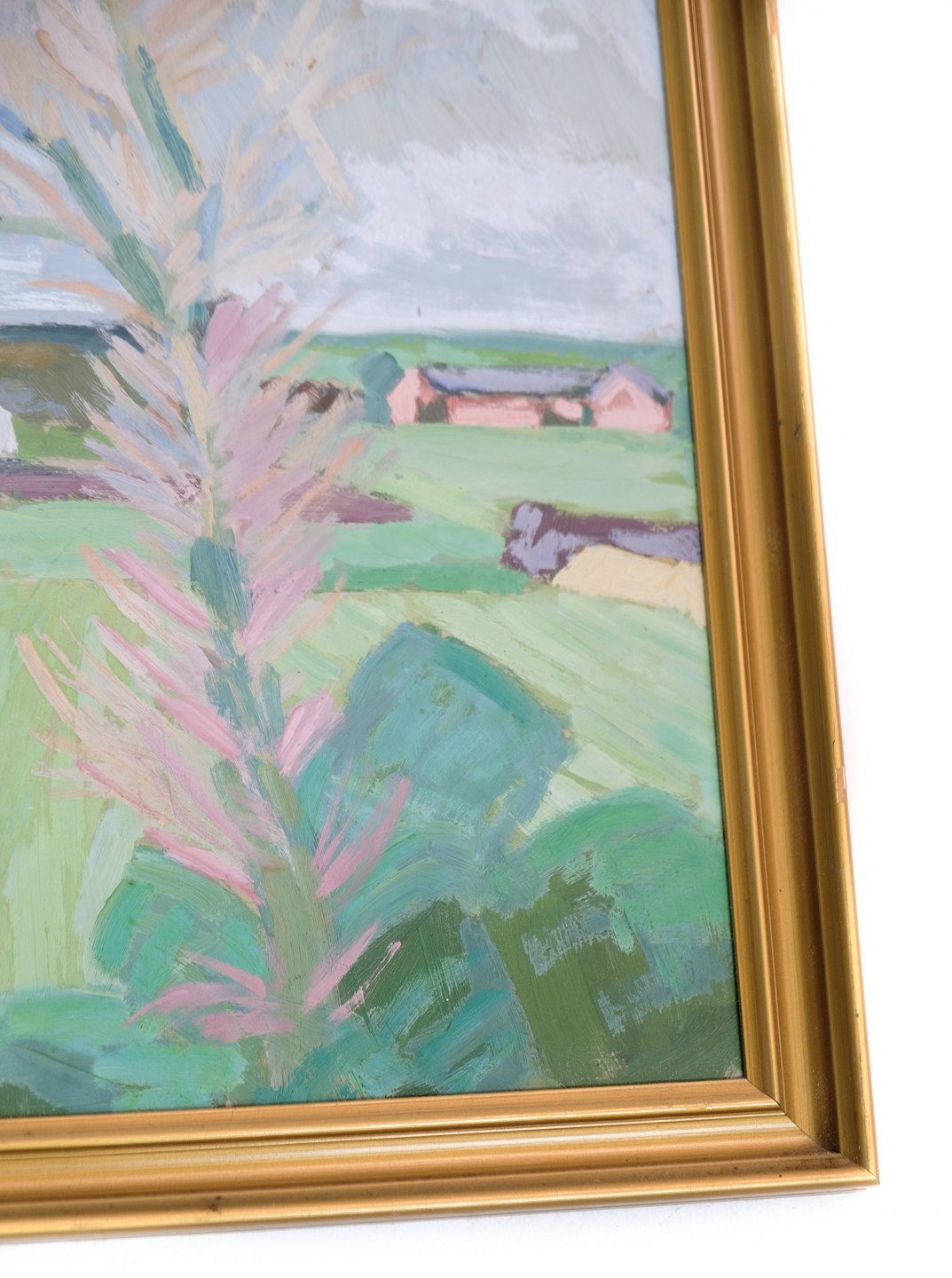 Painting on wooden board in gold frame of agriculture in green colors from around the 1930s.