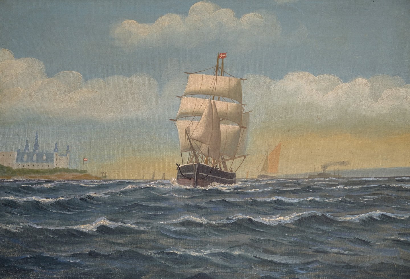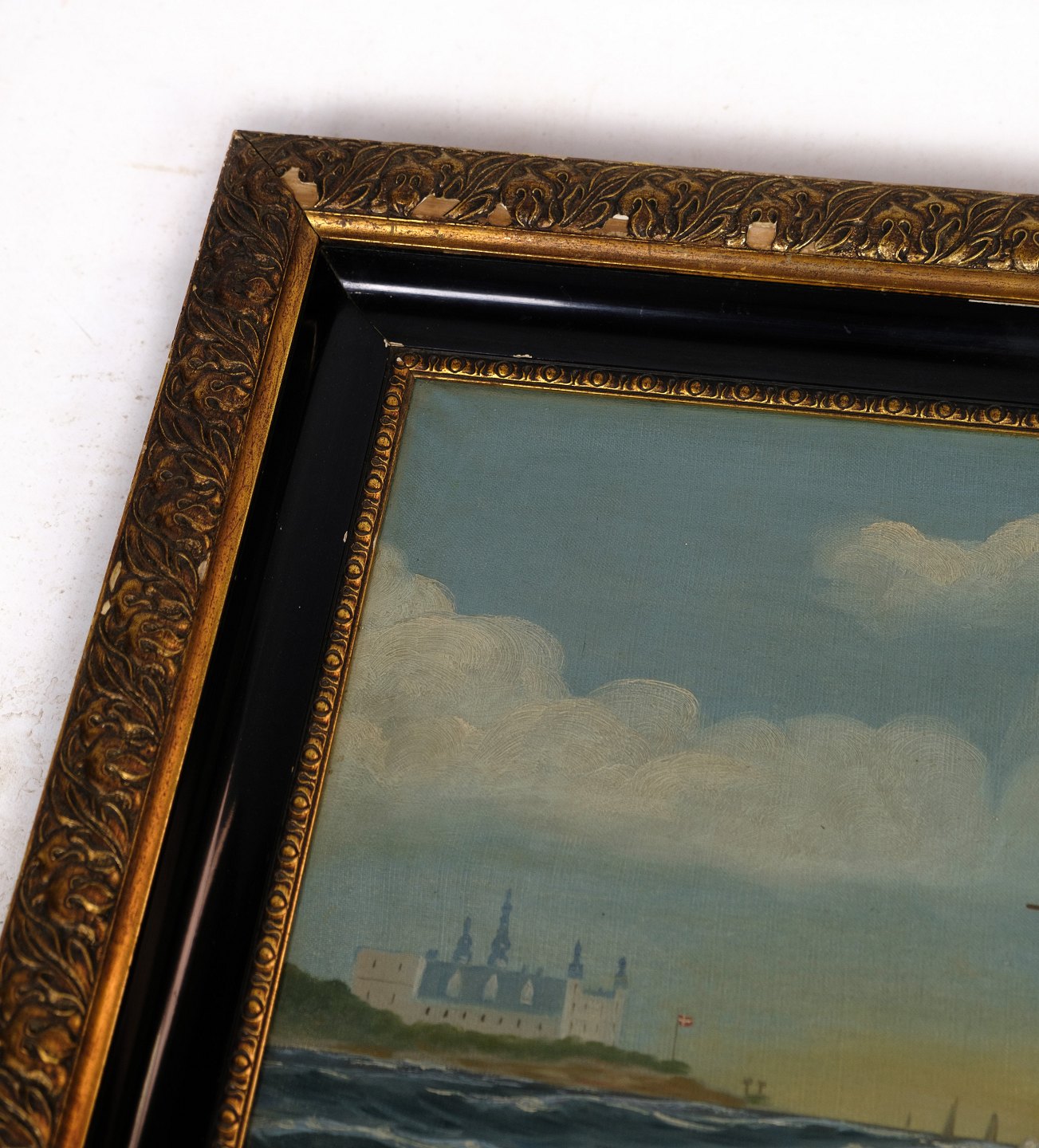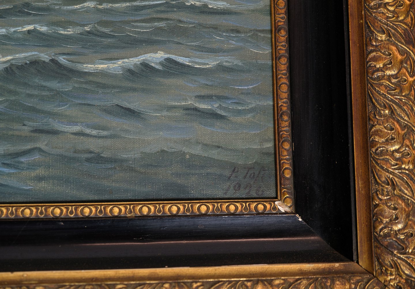 SoldPainting on the canvas in an antique frame of ships and water from around the 1926s. Signed P. Toft