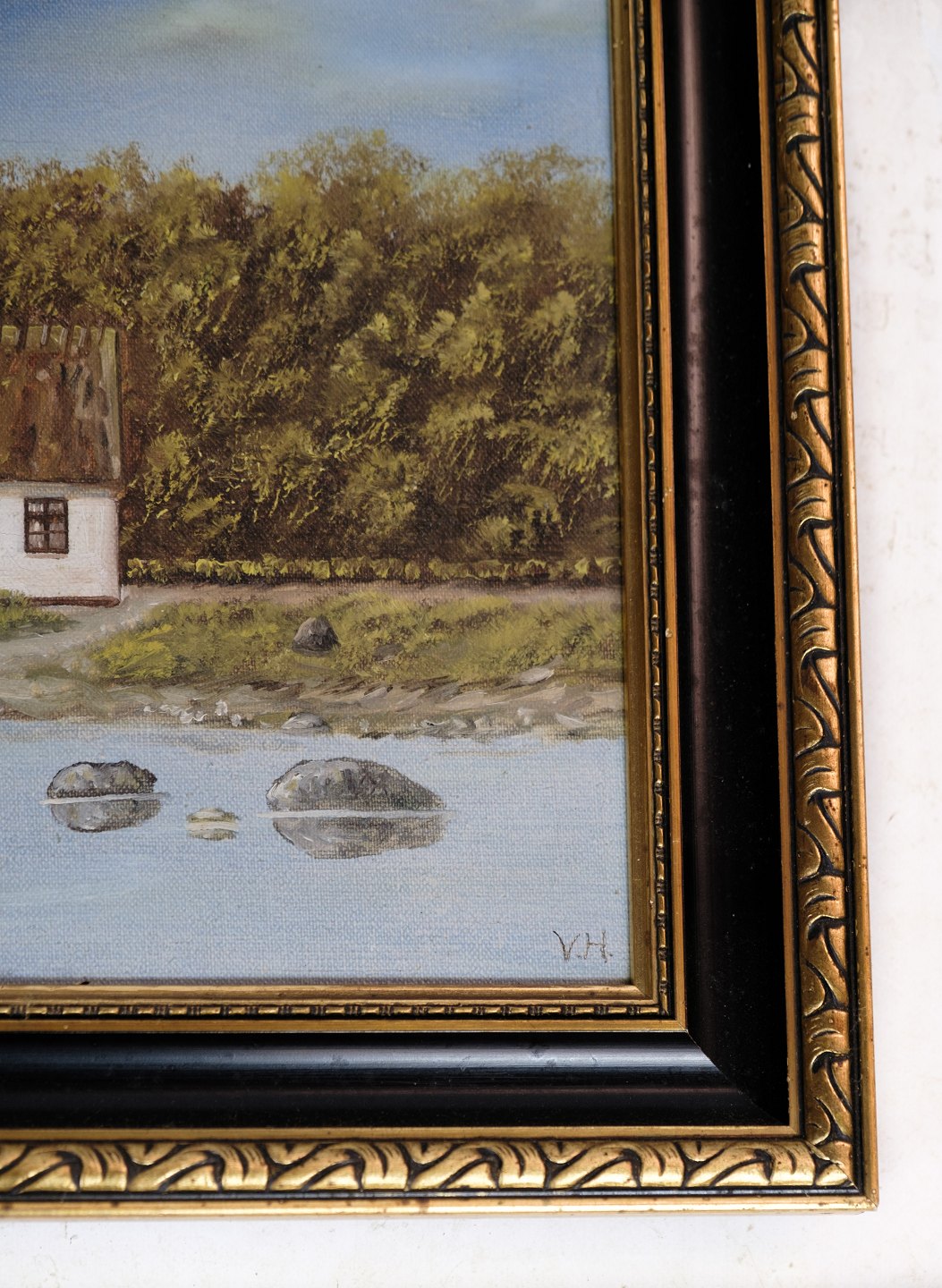 Painting on the canvas in an antique frame of a farmhouse and water from around the 1930s