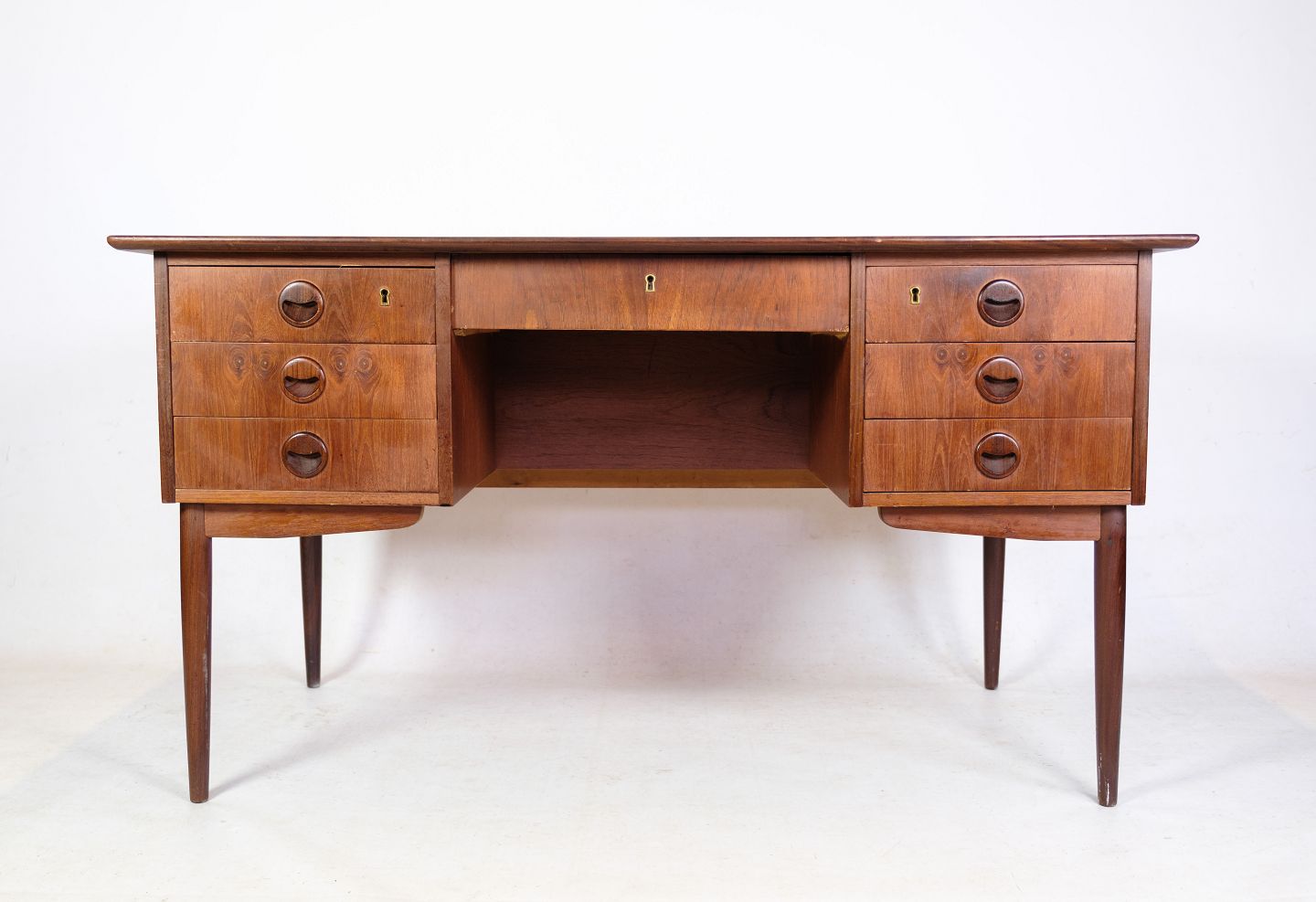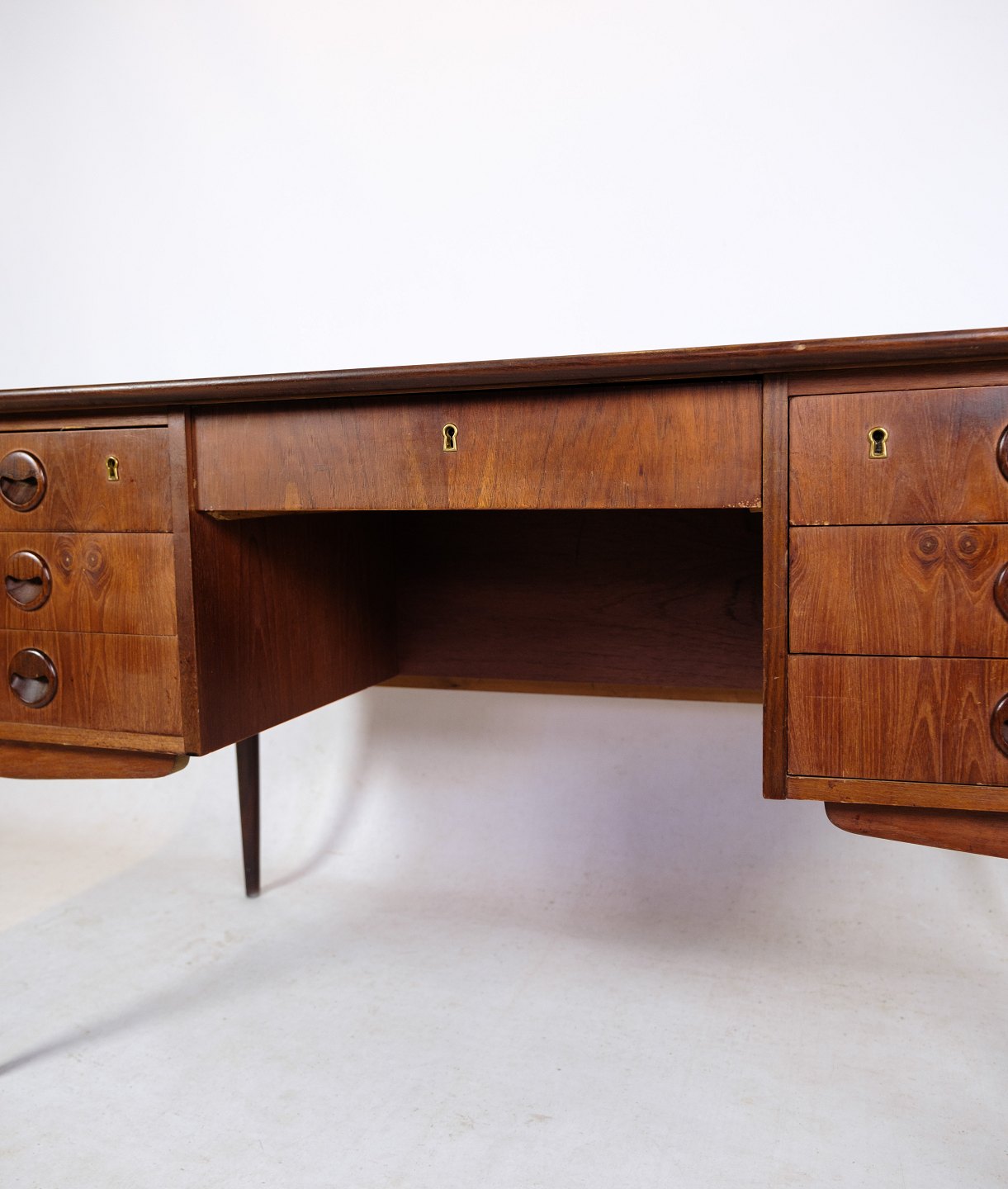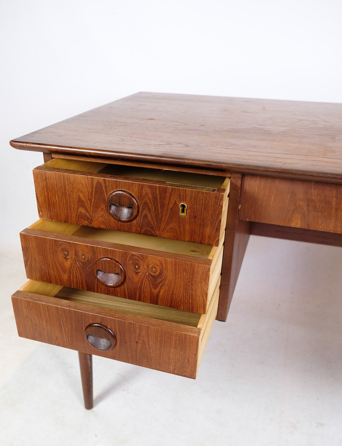 Skrivebordet har tre rummelige skuffer på hver side og en ekstra skuffe i midten, hvilket giver rigelig opbevaringsplads til dine kontorartikler og dokumenter. Den varme tone af teaktræet tilføjer en naturlig skønhed til rummet, mens det danske design bringer en tidløs elegance.