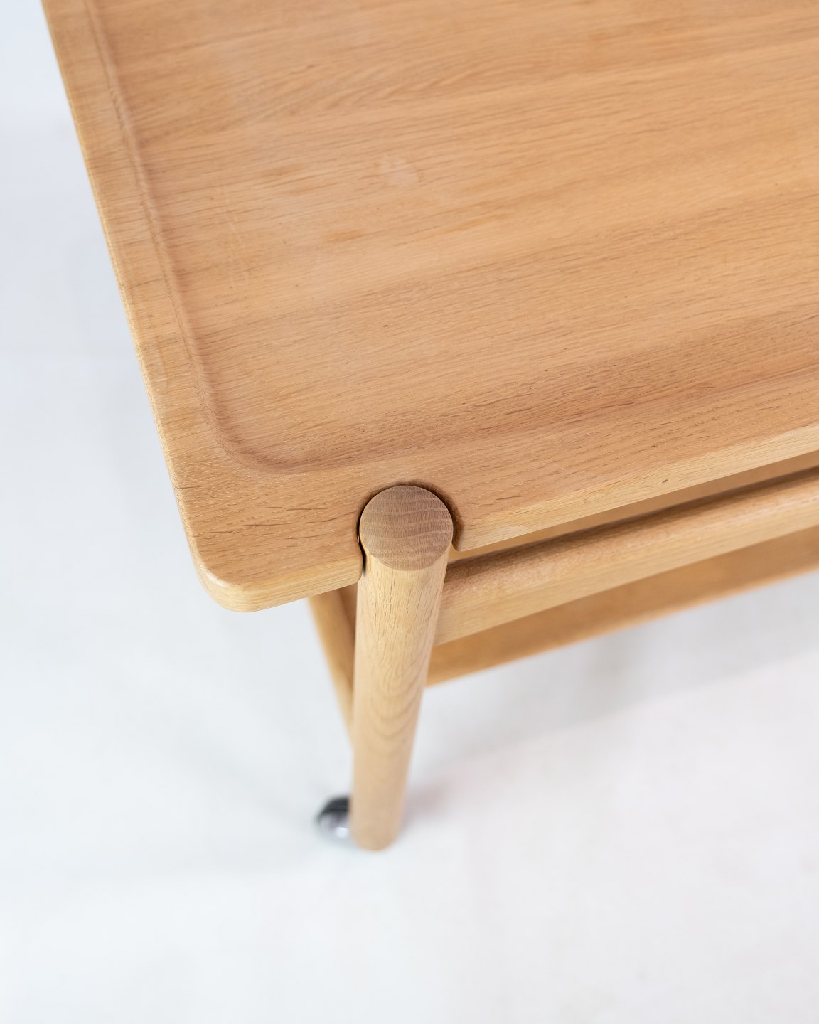 "AT 48" is the name of a serving trolley designed by Hans J. Wegner. The serving trolley is made of solid oak and has a reversible top, which makes it extra practical and functional. The underlying shelf also adds extra storage space, making the serving trolley ideal for serving and transporting various items.