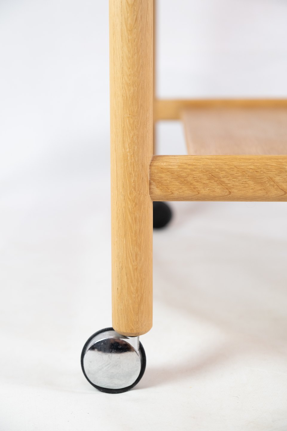 Hans J. Wegner's design brings a timeless elegance and functionality to the serving trolley, making it a sought-after and valued piece of furniture. With its solid oak construction, the "AT 48" serving trolley is a beautiful example of Danish design heritage that will add an elegant touch to any home or interior.