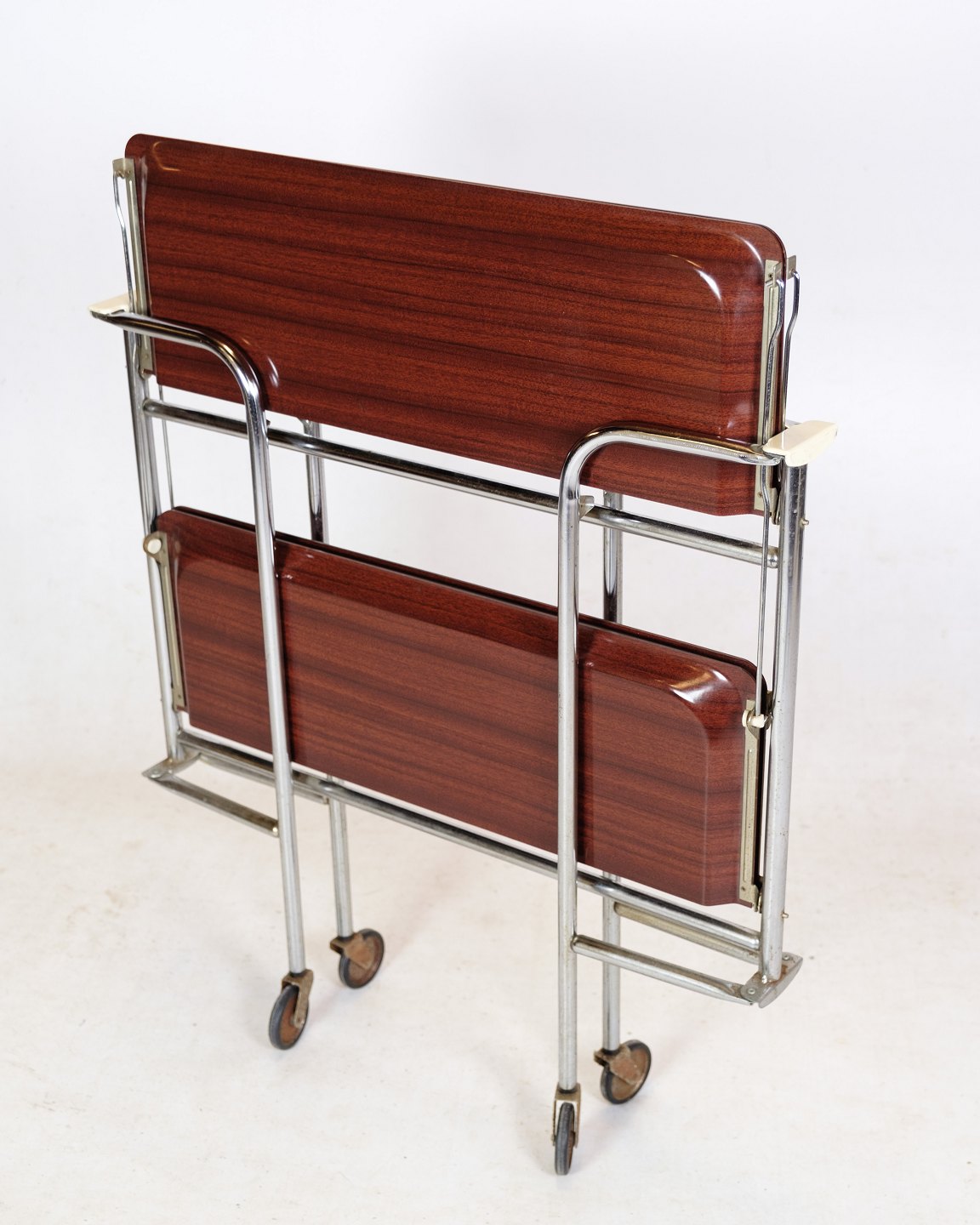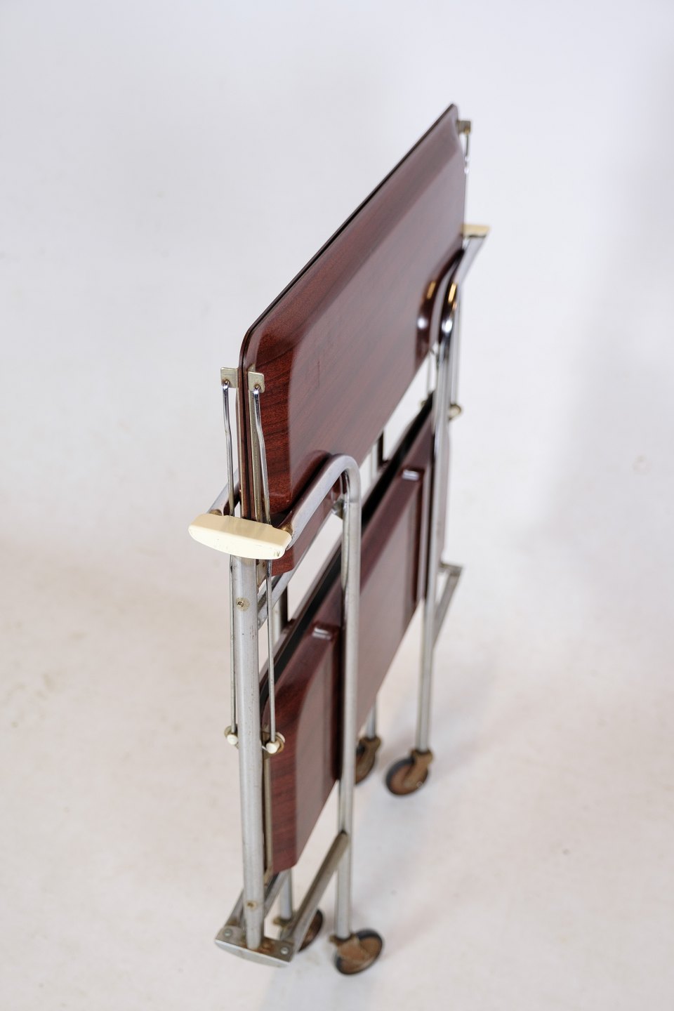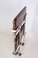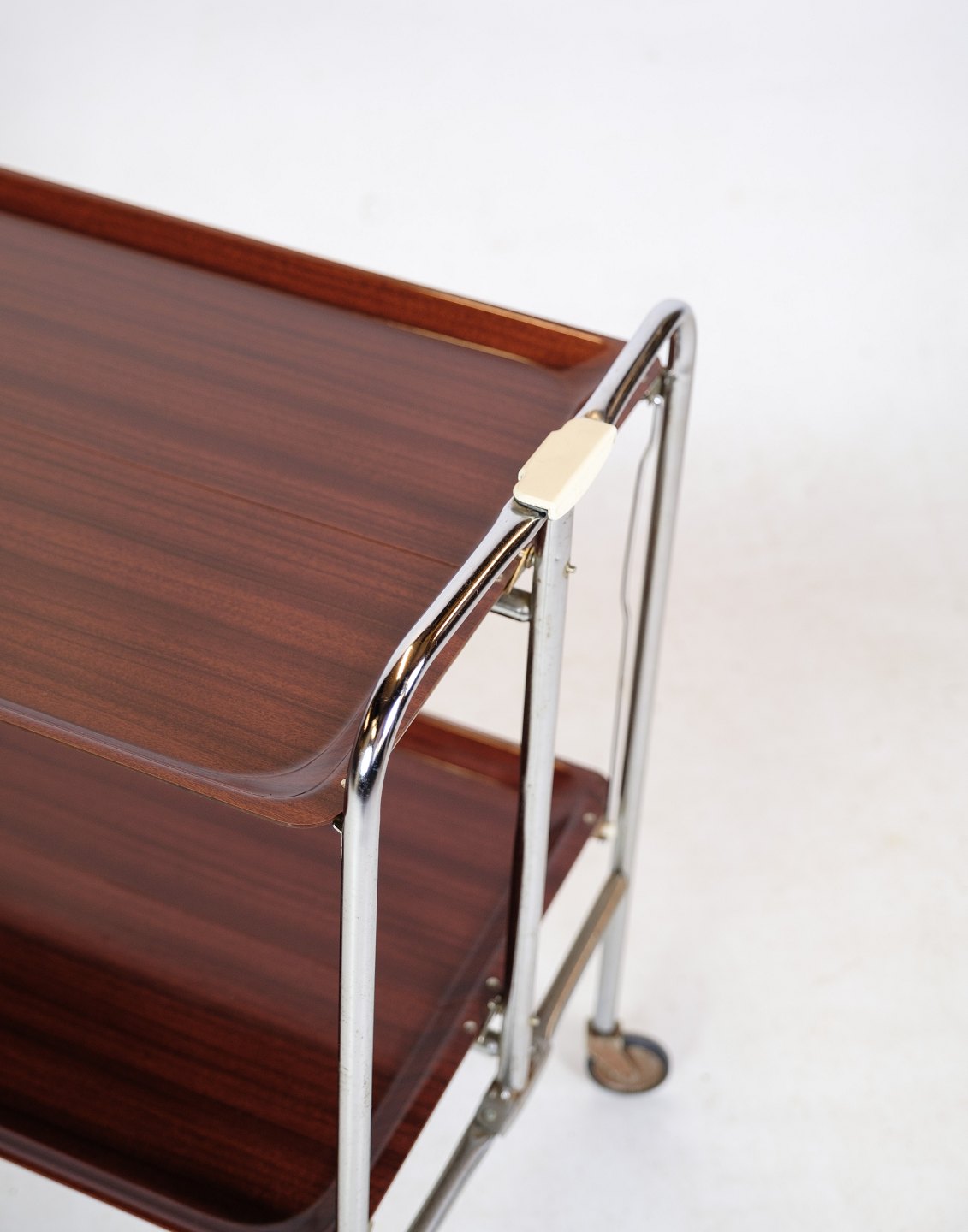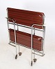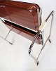 SolgtRullebord med overflade af imiteret mahogni med stel af forkromet metal og originale hjul.