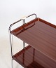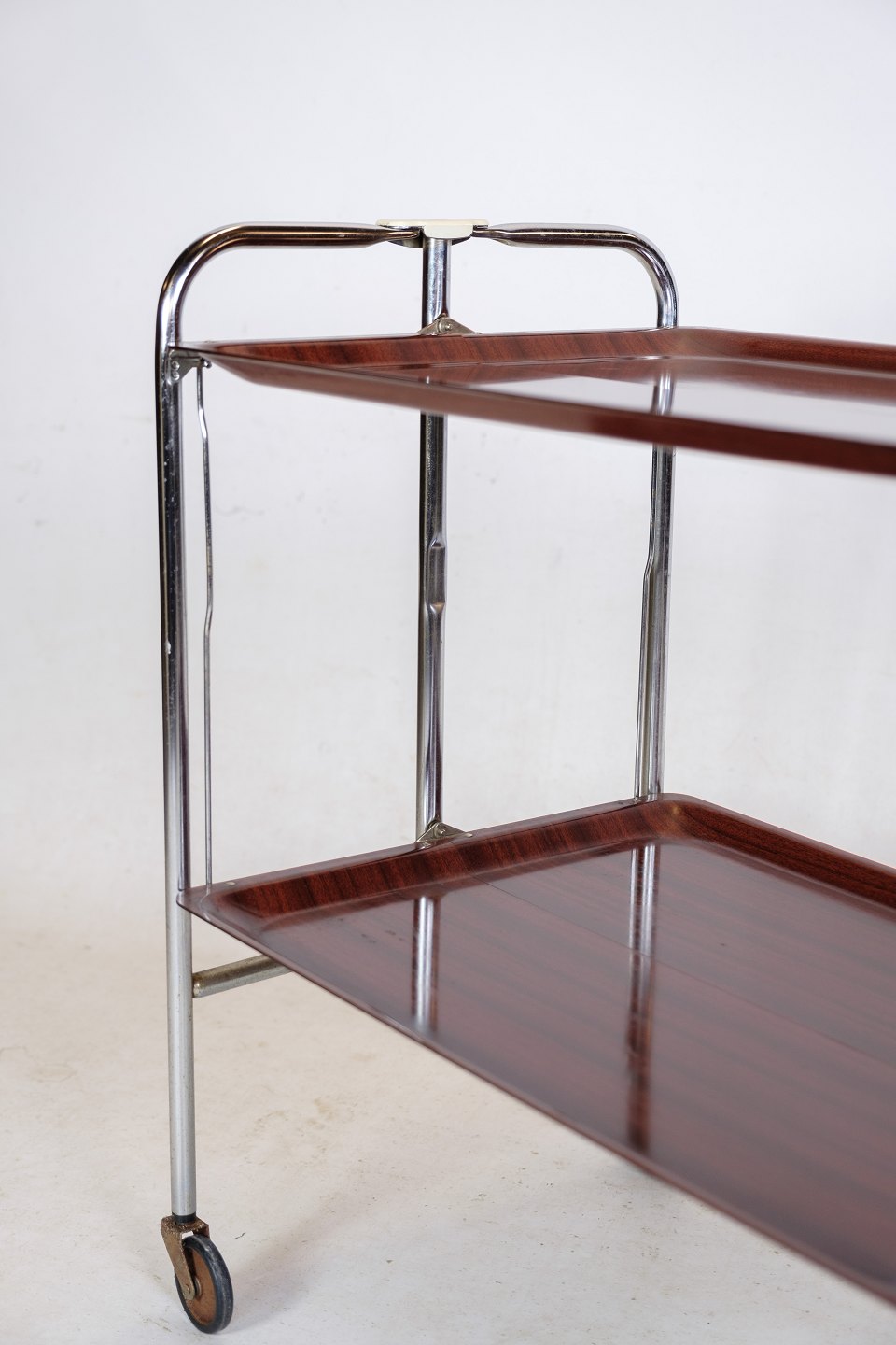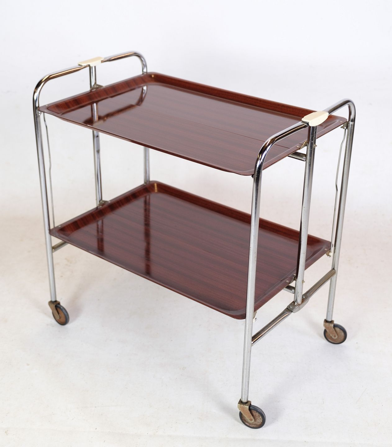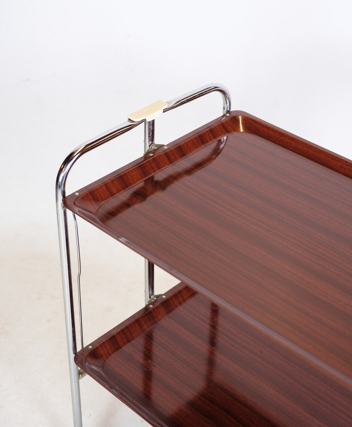 SolgtRullebord med overflade af imiteret mahogni med stel af forkromet metal og originale hjul.