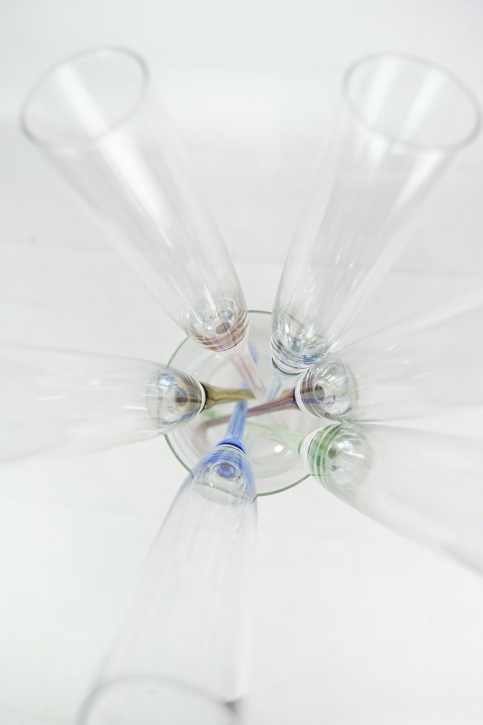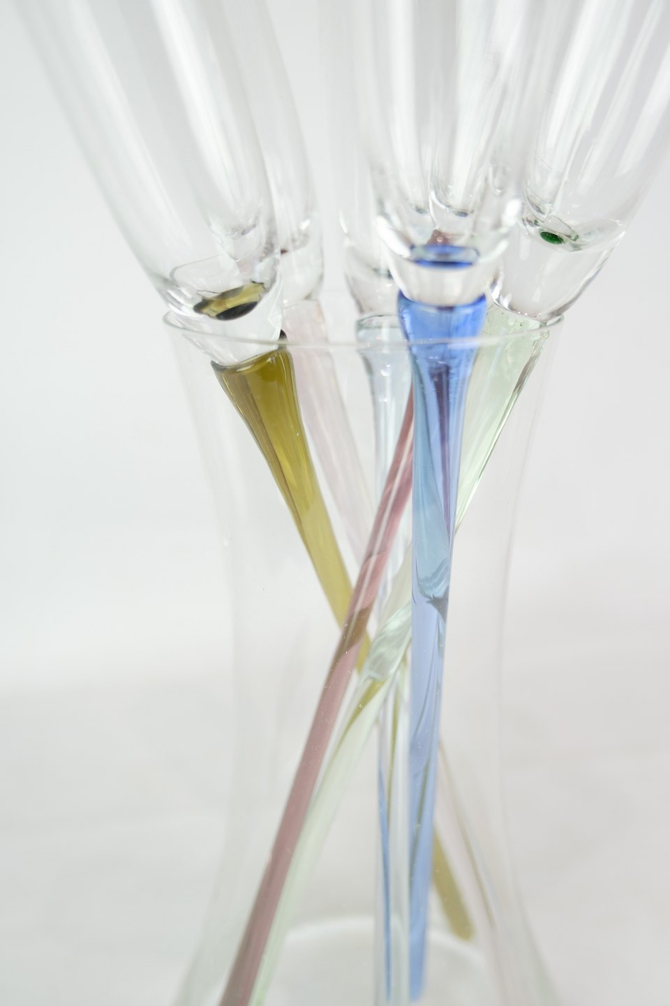 SoldServing glass vase with champagne glass on stem with different colors. Sold as a set.