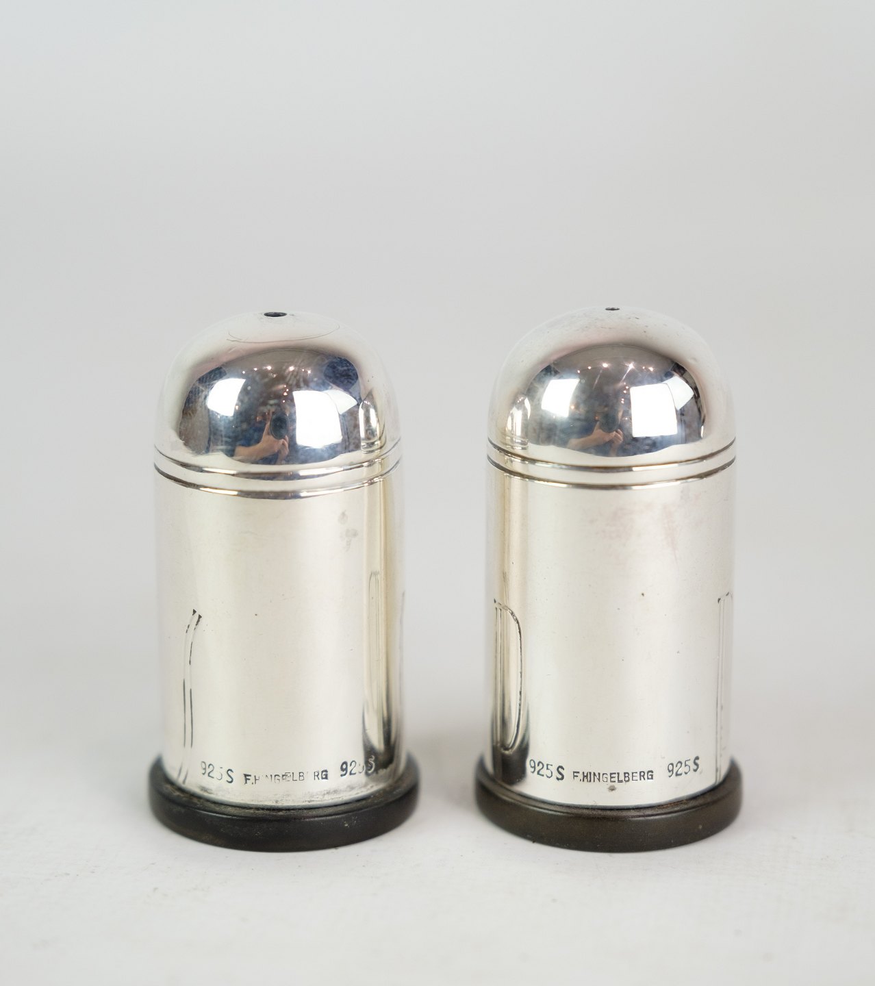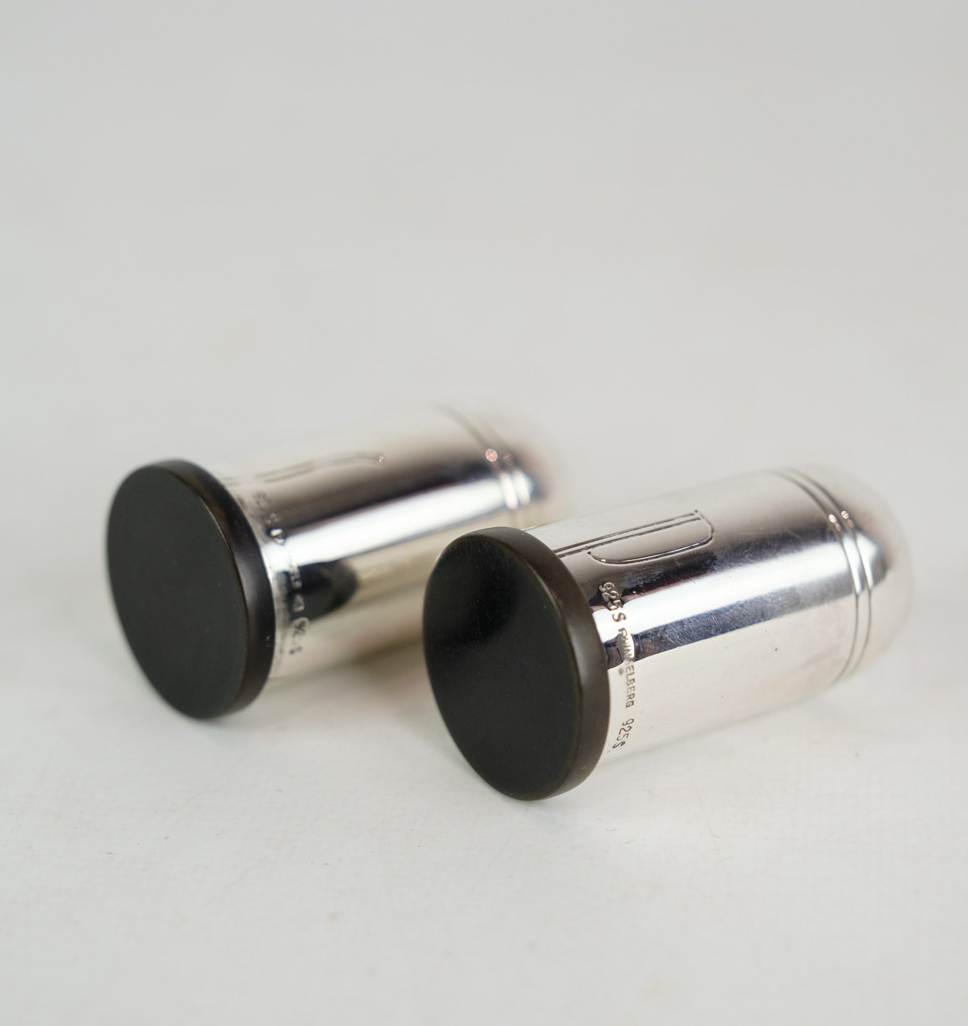 Salt and pepper set in minimalist design, stamped 925 sterling, as well as master stamp. F. Hingelberg. Weight: 41g