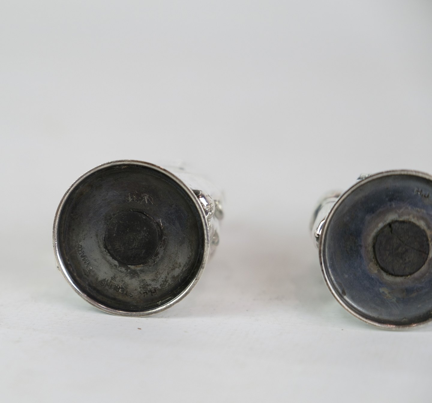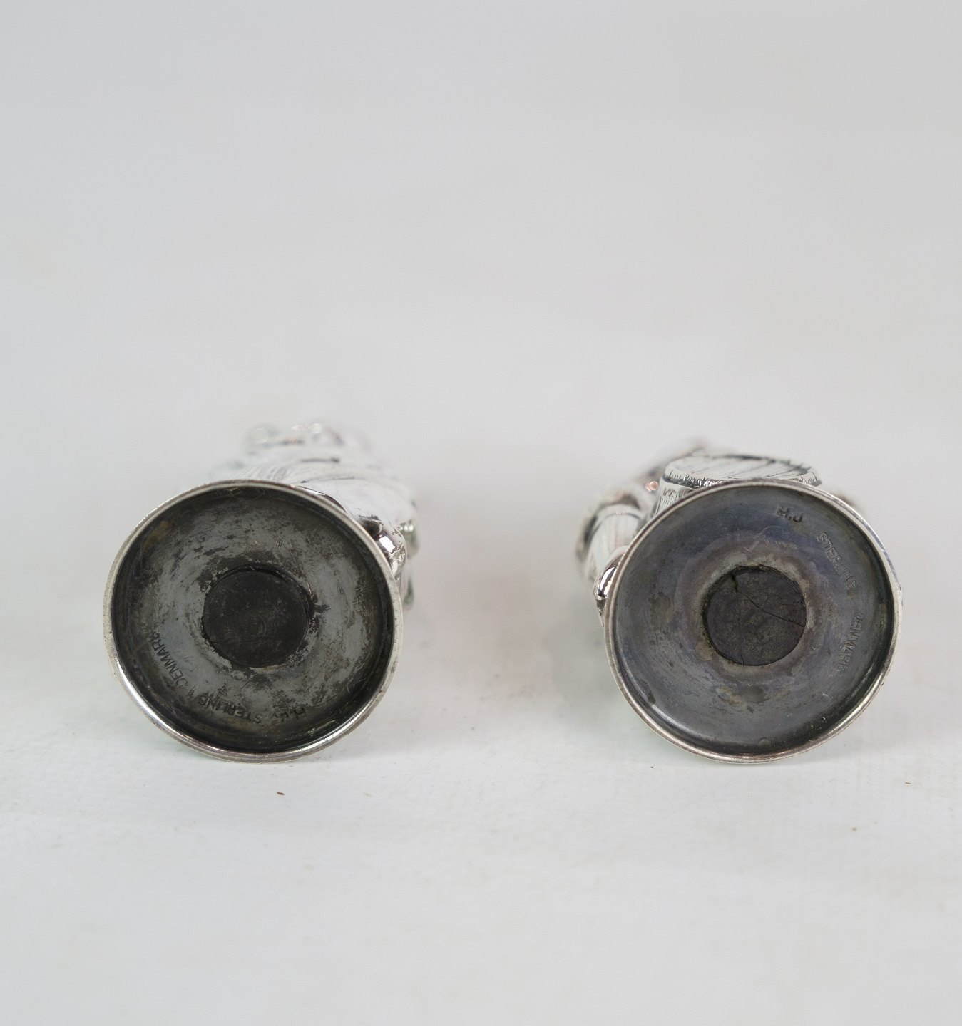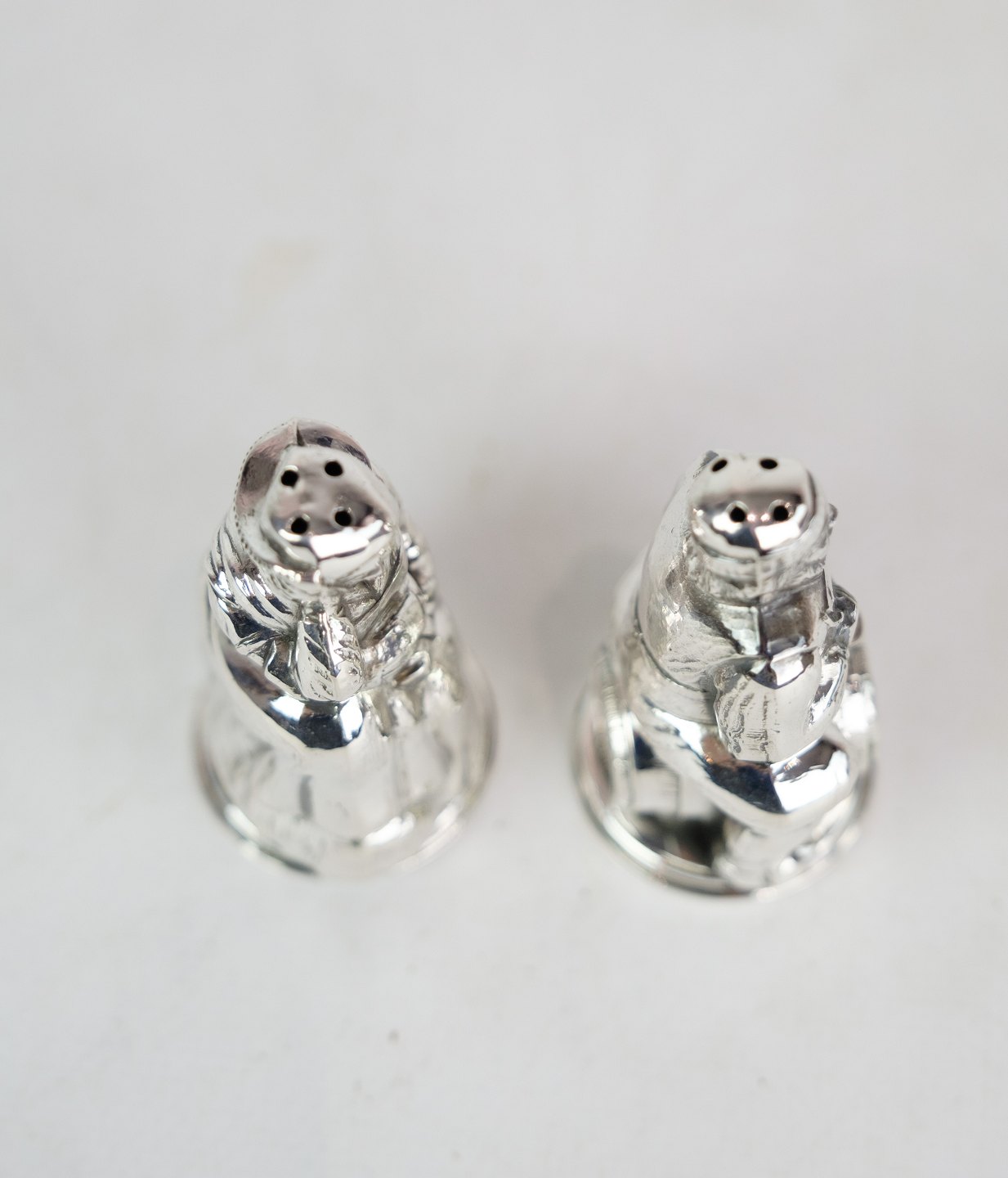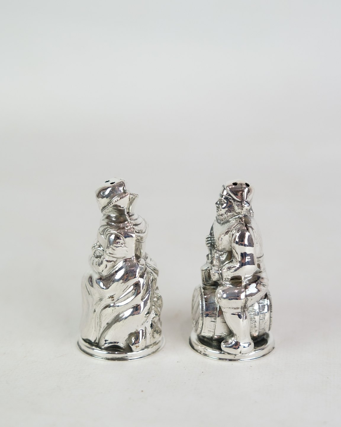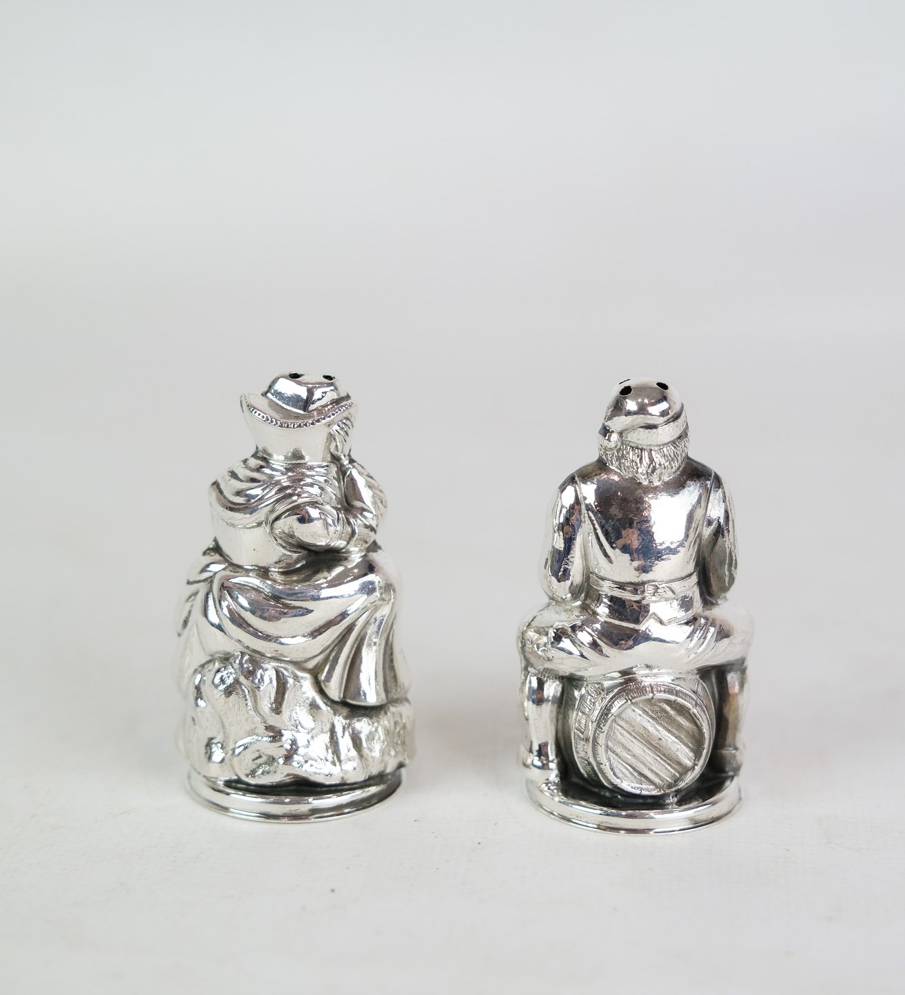 Salt and pepper shaker set in sterling silver, stamped H.J Denmark. The set is designed as a husband and wife with a motif of a man sitting on a beer barrel and the wife carrying a barrel and holding herself on her head. Weight: 52g