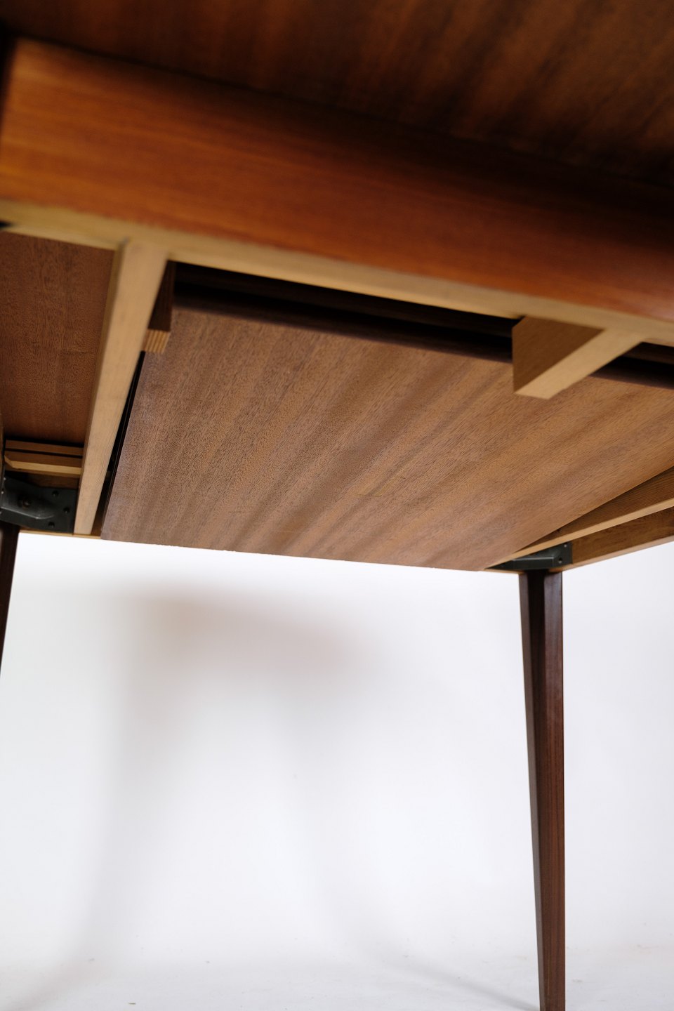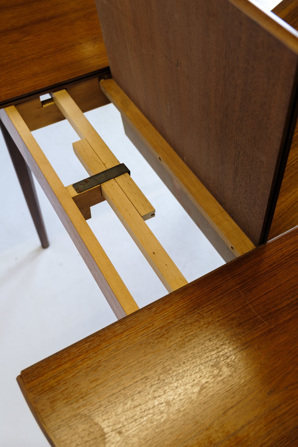 Teak dining table with built-in additional plate and round legs of Danish design from around the 1960s.