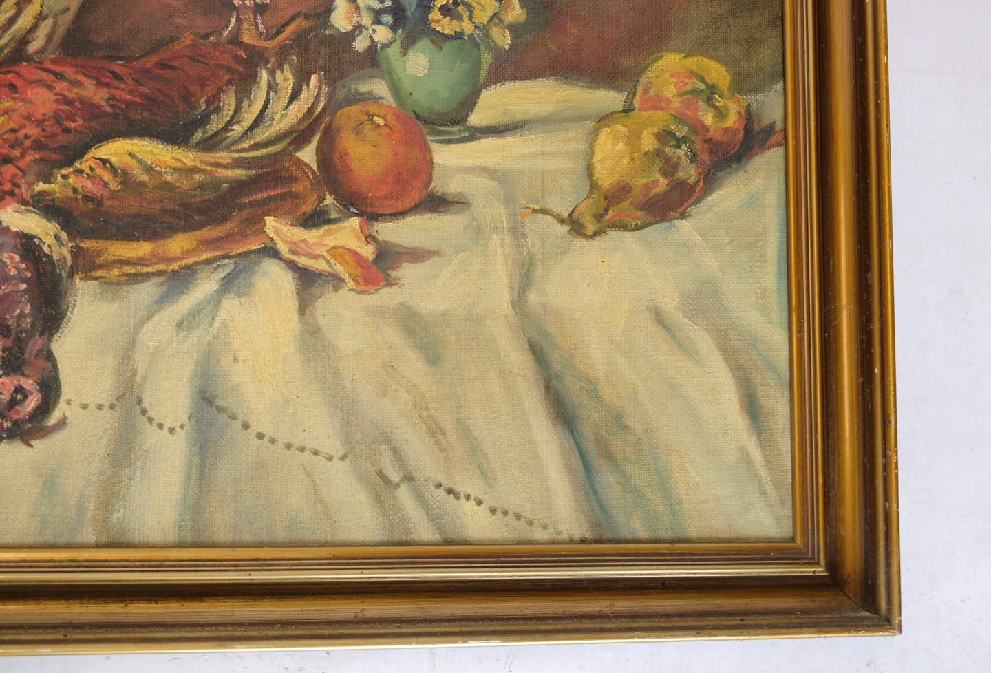 SoldOil painting on canvas with the motif of a table setting with fruits and a pheasant from around the 1930s.