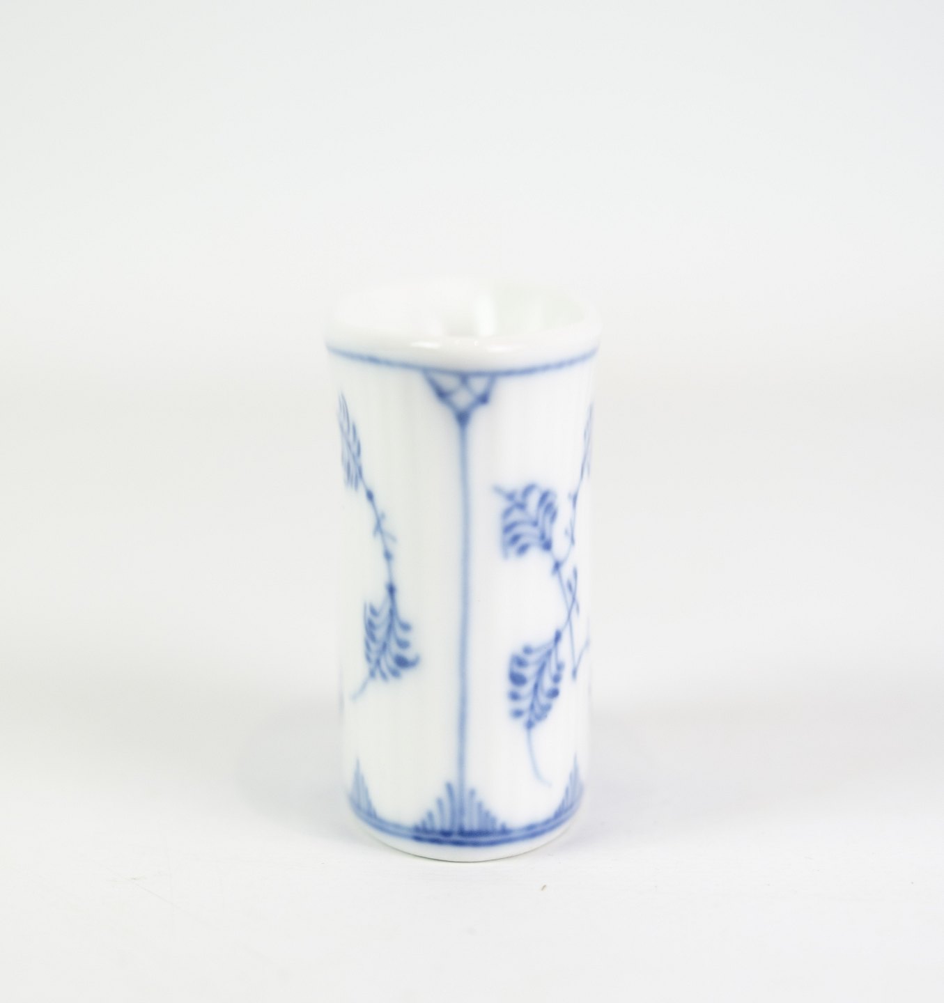 Dette ovalformede bæger/lille vase er en del af den ikoniske Musselmalet Riflet-serie og er kendetegnet ved de karakteristiske rifler, der pryder overfladen. Dekorationsnummeret 1/2183 er en reference til det unikke mønster og design, der er blevet nøje udvalgt til denne vase.