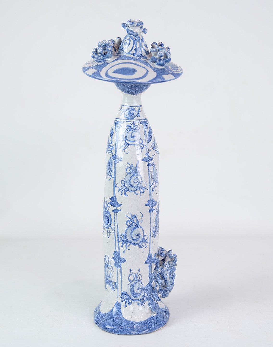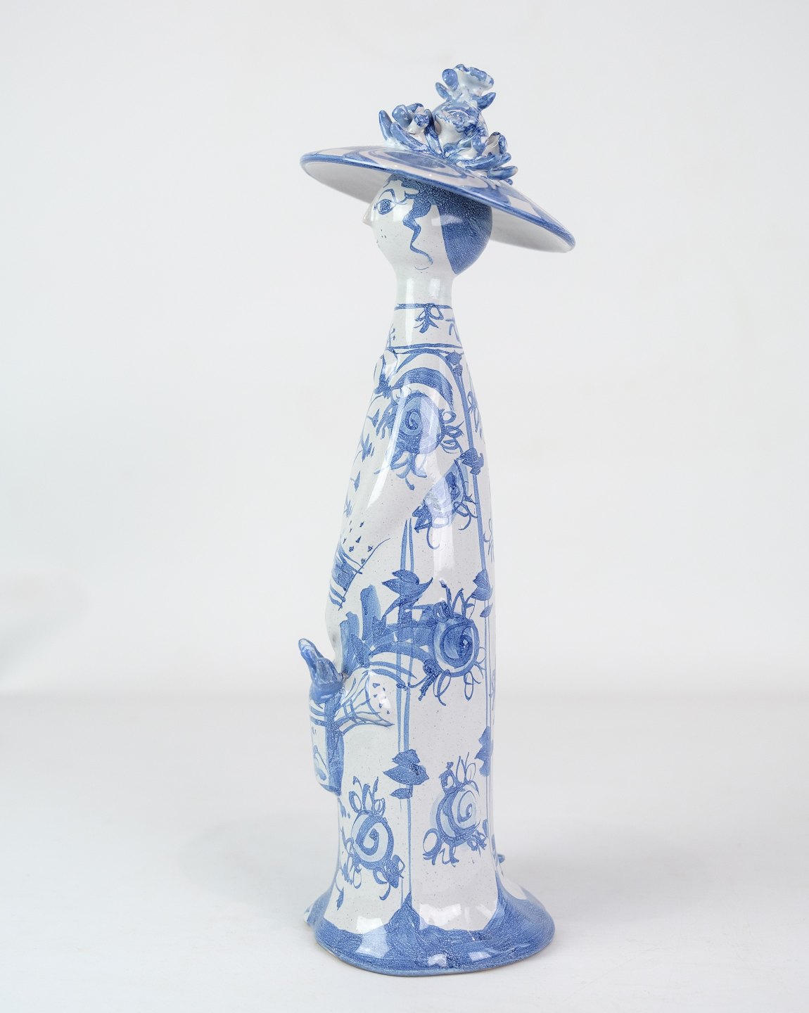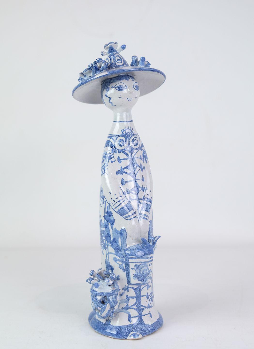 Figuren "Sommer" M21, dekoreret i blå og hvide farver, repræsenterer sandsynligvis sommersæsonen med sin egen unikke og fantasifulde tolkning. Med sine mål på 35 cm i højden og en diameter på 8,5 cm, er denne figur en imponerende og iøjnefaldende dekoration.