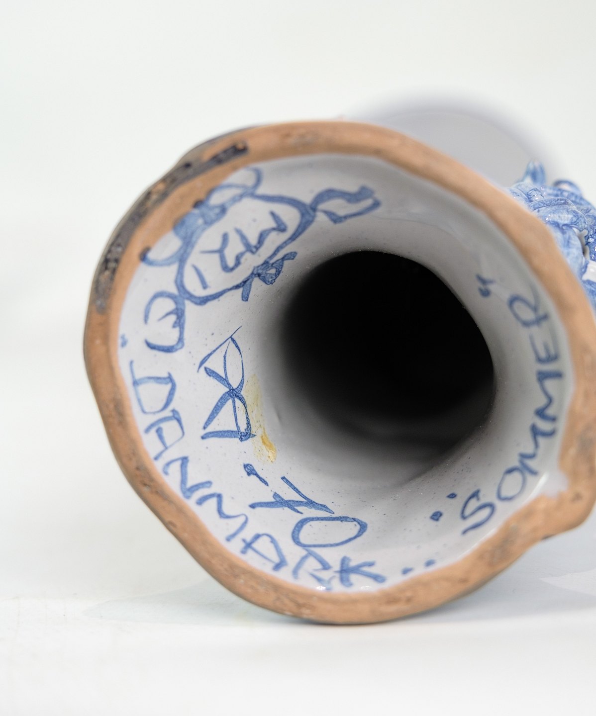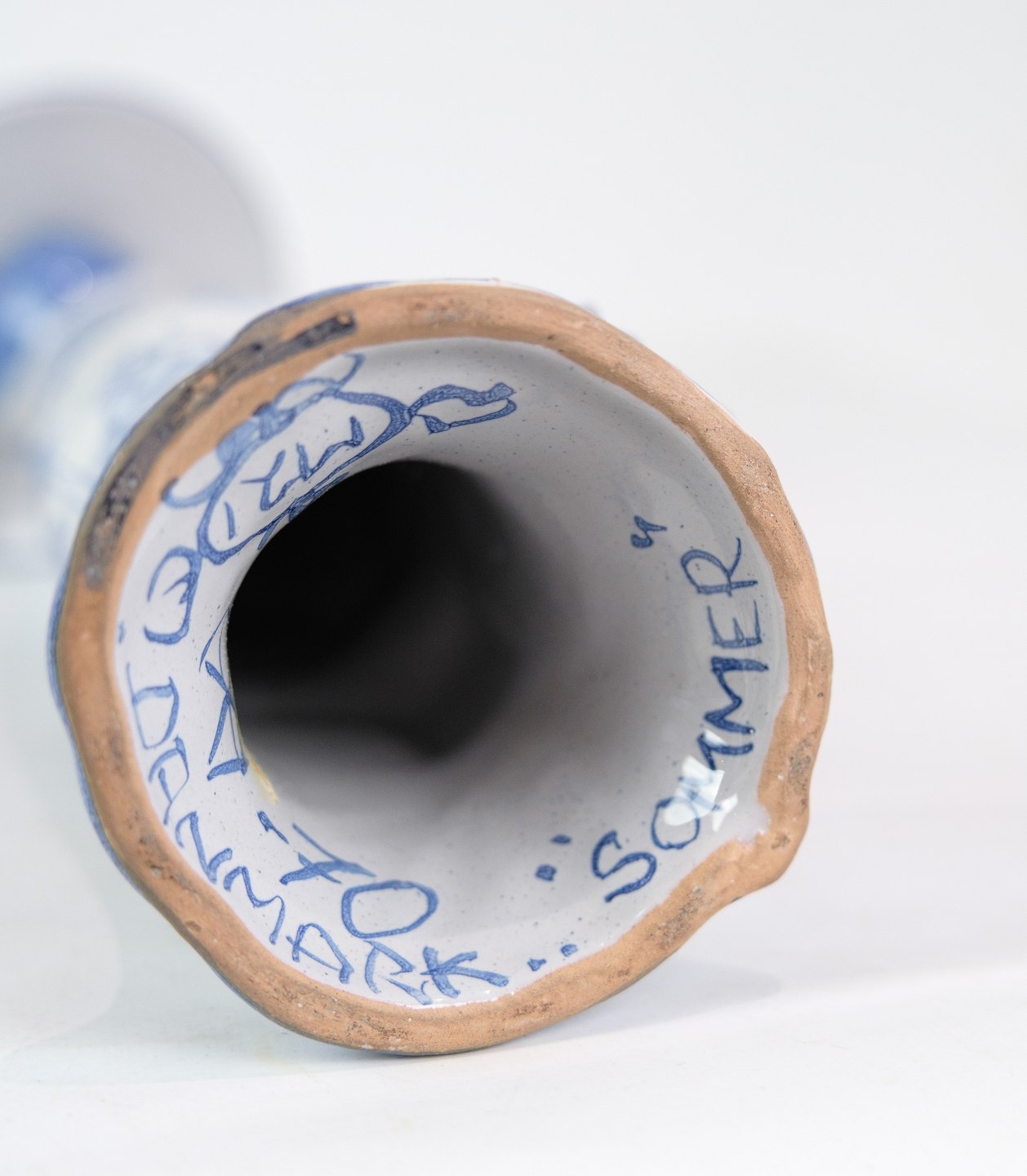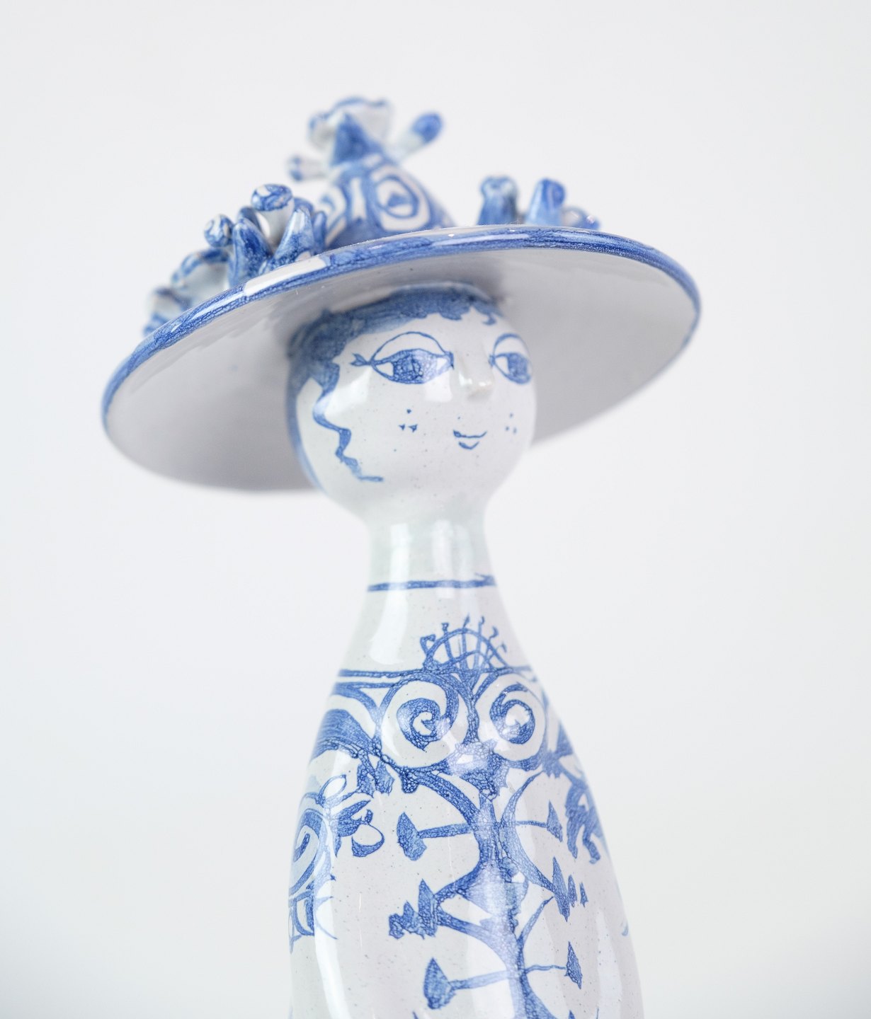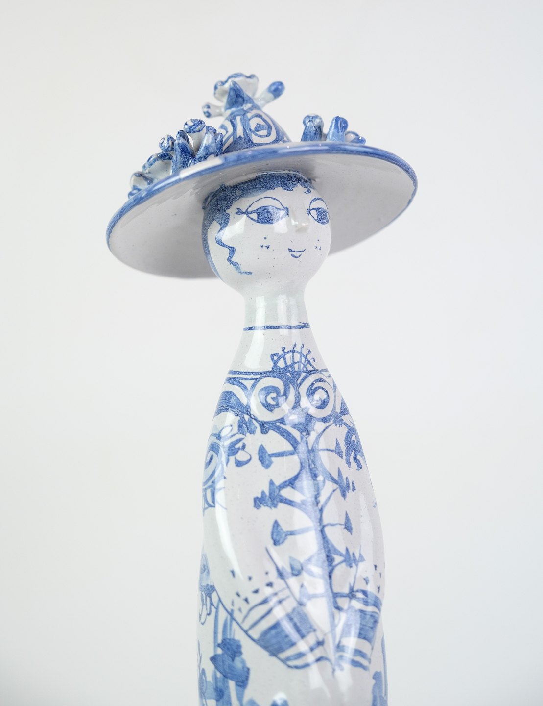 Figuren "Sommer" M21, dekoreret i blå og hvide farver, repræsenterer sandsynligvis sommersæsonen med sin egen unikke og fantasifulde tolkning. Med sine mål på 35 cm i højden og en diameter på 8,5 cm, er denne figur en imponerende og iøjnefaldende dekoration.
