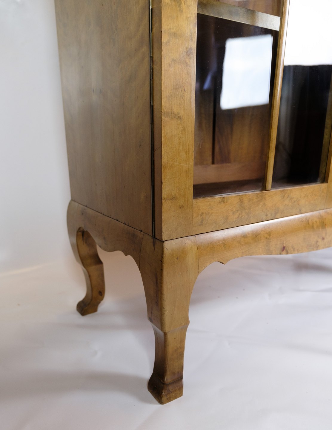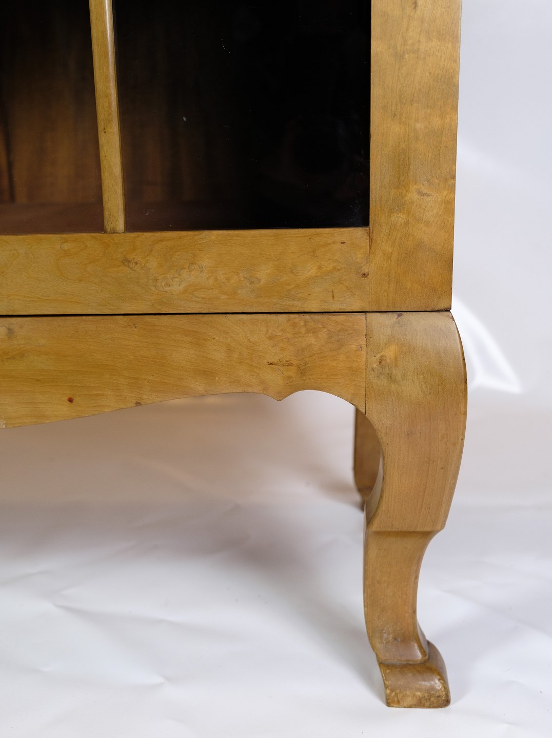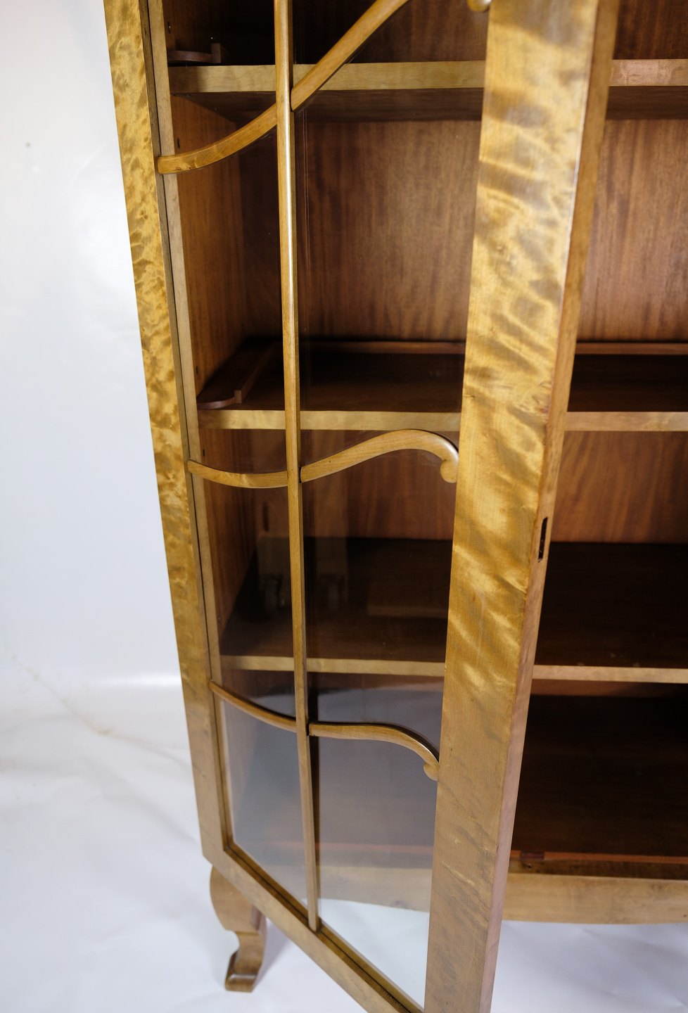 SolgtVitrineskab af birketræ med 3 hylder og glasruder fra omkring år 1920'erne.