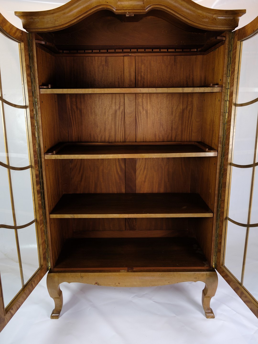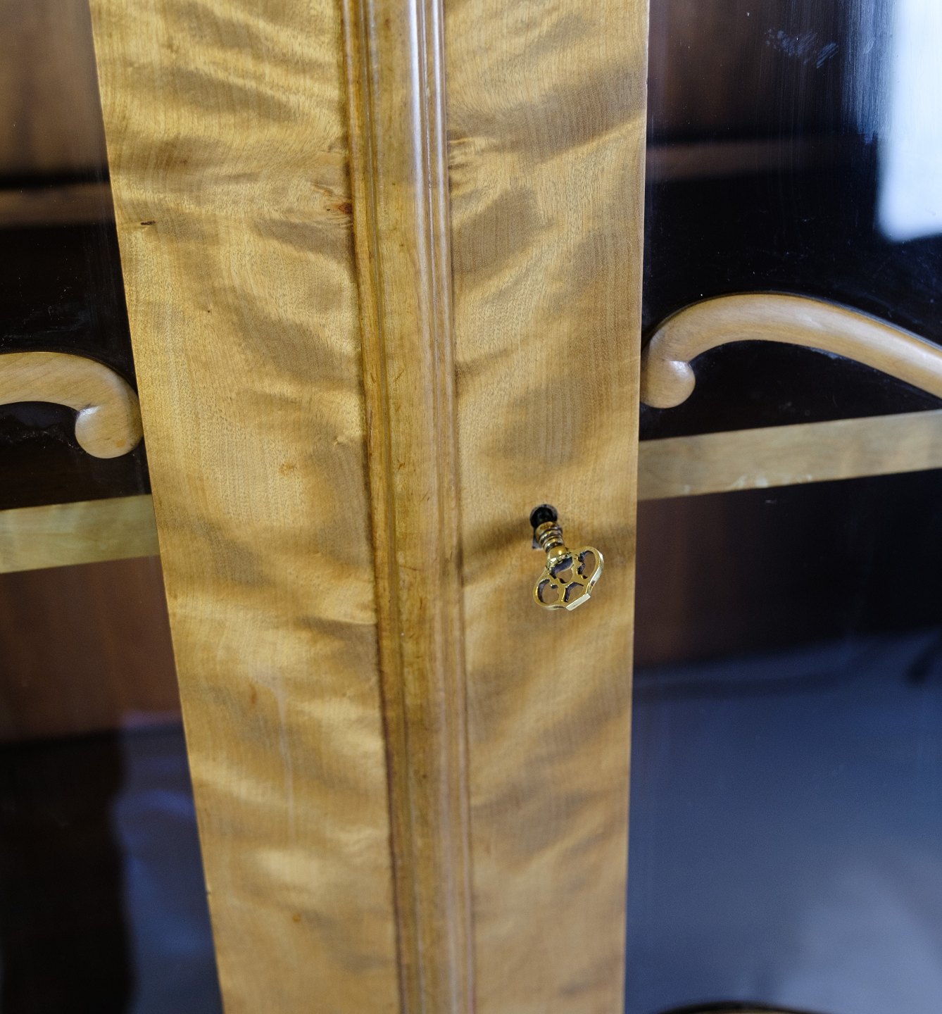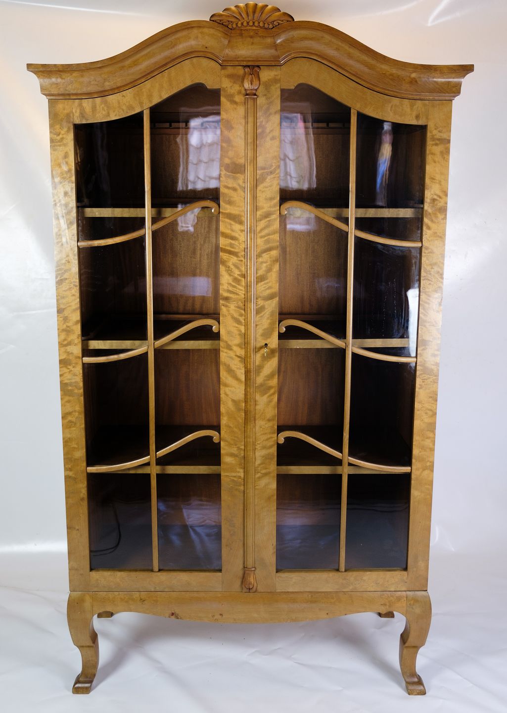 SolgtVitrineskab af birketræ med 3 hylder og glasruder fra omkring år 1920'erne.