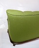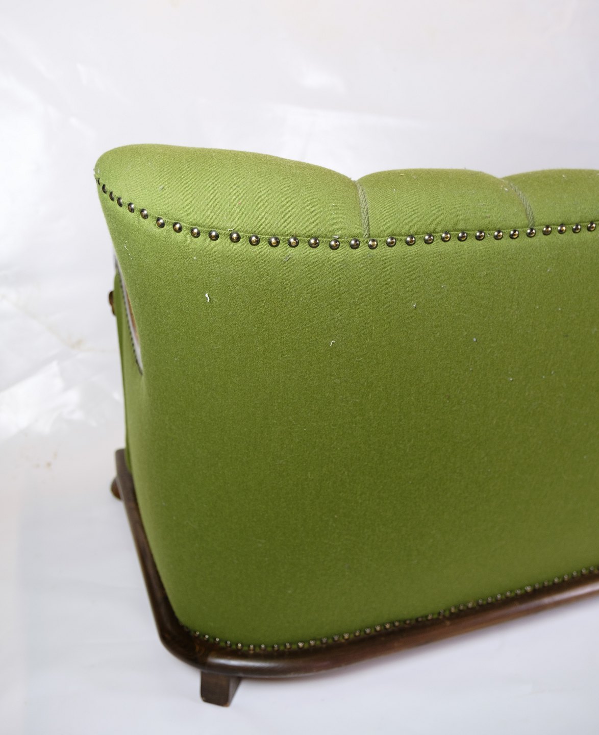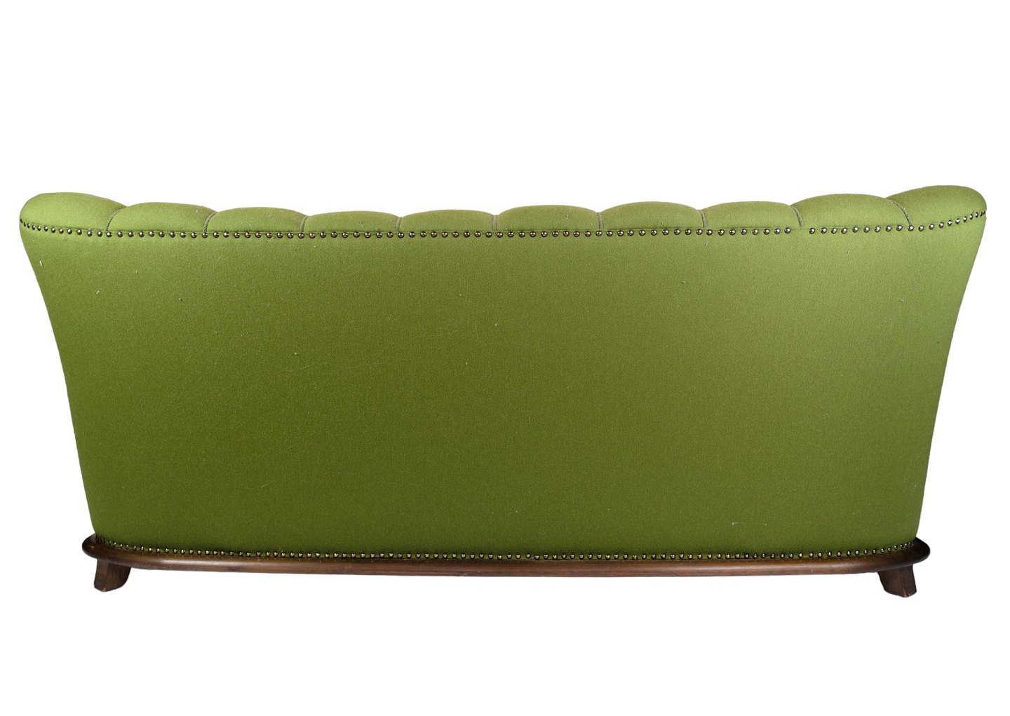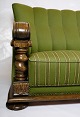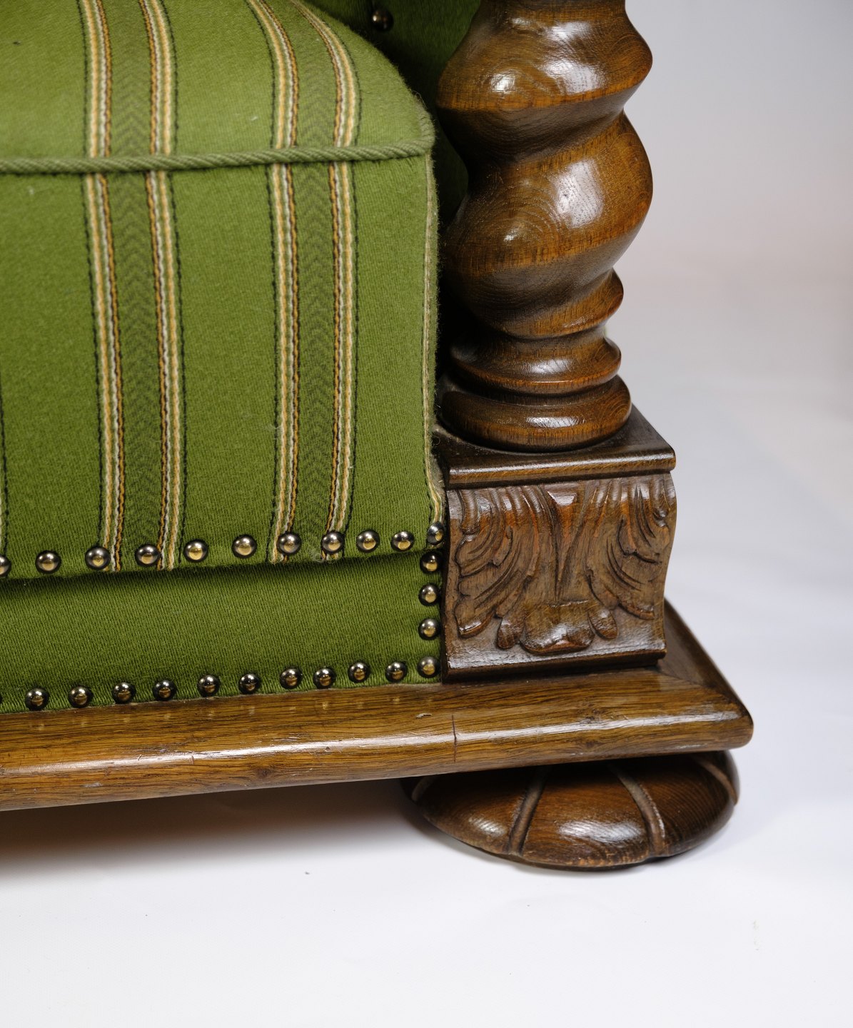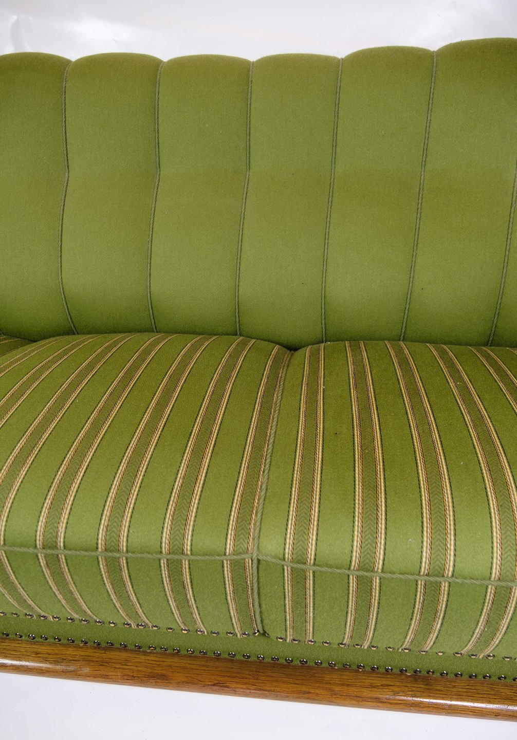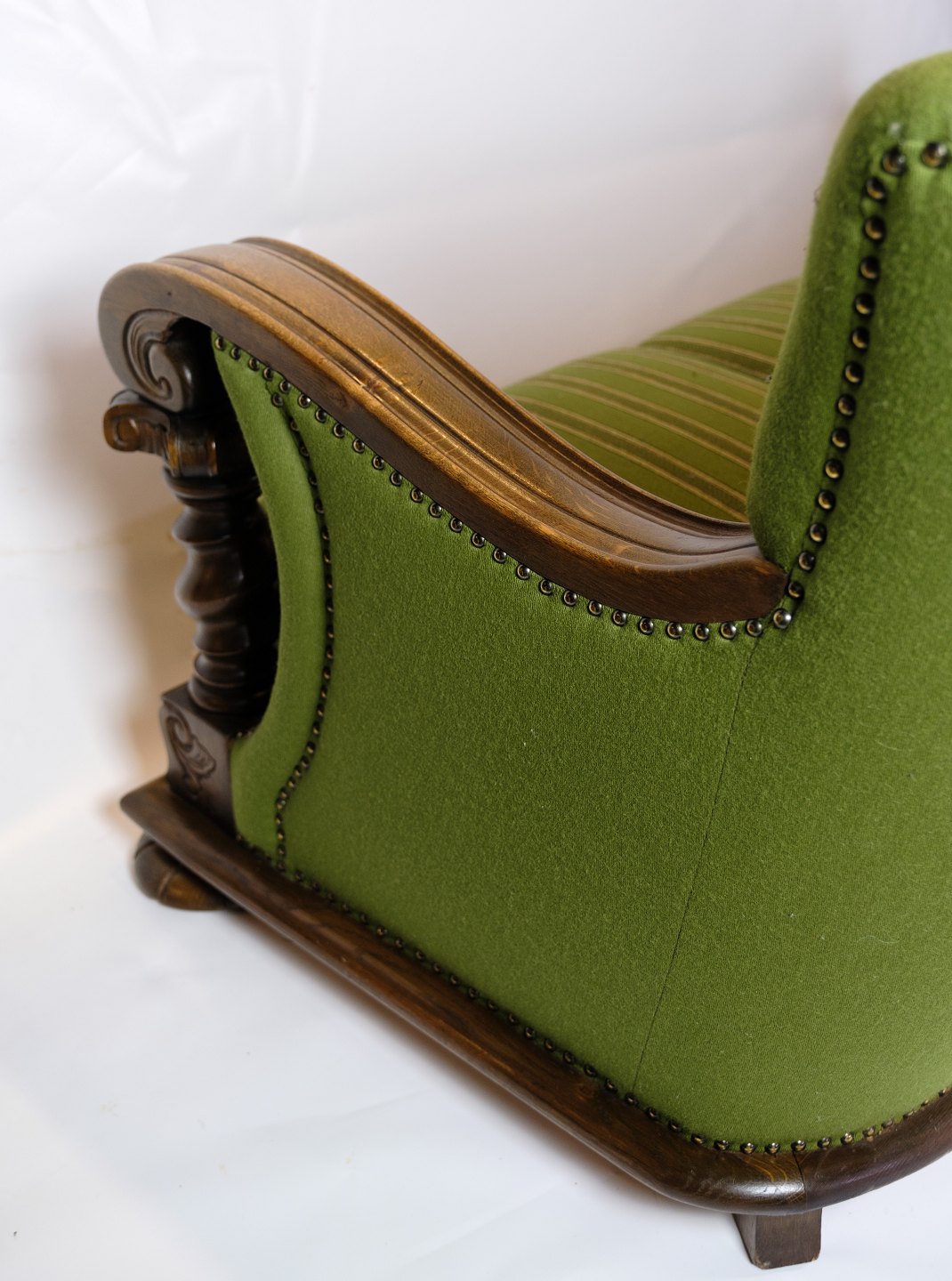 Denne sofa udstråler æraens tidløse elegance med sin grønne polstring, der tilføjer et strejf af luksus og farve til møblet. Håndskårne træudskæringerne pryder sofaens ramme og understreger den kunstneriske og detaljerede tilgang, der var karakteristisk for møbelproduktionen på den tid.