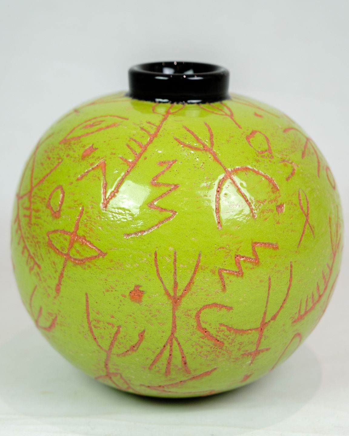 Lene Regius' runde vase med sort top, grøn glasur og orange mønstrede indgraveringer fra omkring 1980'erne repræsenterer en unik periode inden for keramisk design. Vasen kombinerer forskellige farver og mønstre for at skabe et karakteristisk udtryk, typisk for den tid og kunstnerens stil.