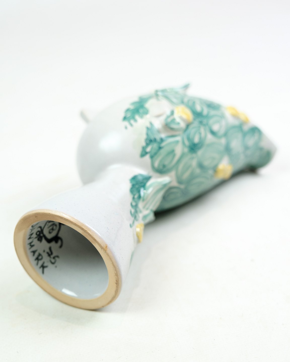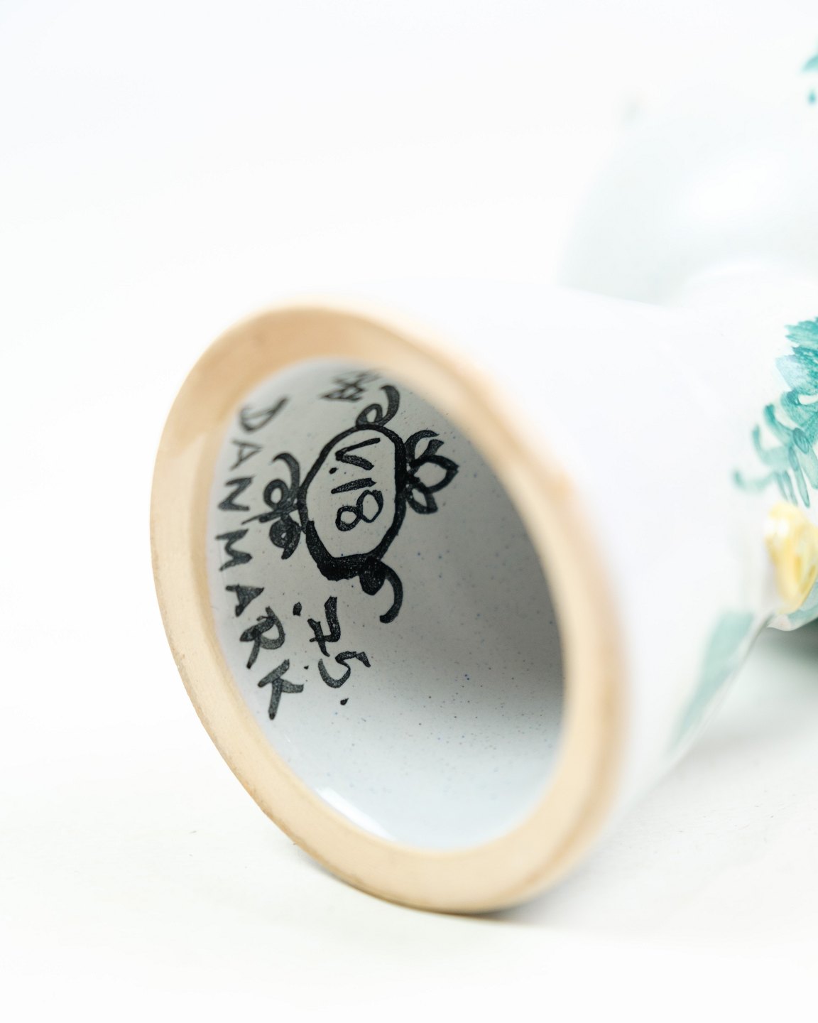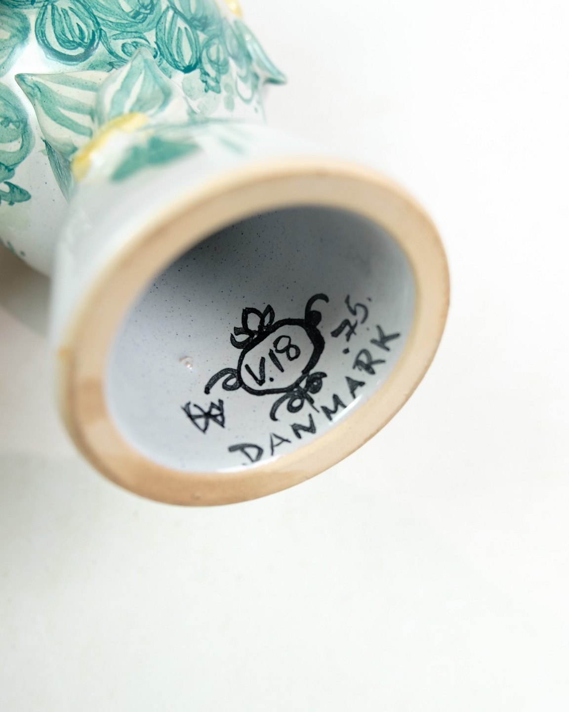SoldCeramic vase designed by Bjørn Wiinblad, with design no. V18 from 1975, produced in Denmark. This vase represents Wiinblad's distinctive style, which often included imaginative and colorful patterns. With a period influence from the 1970s, this vase is not only a functional object, but also a work of art that reflects the designer's unique aesthetic. A collector's item for lovers of Danish design and Bjørn Wiinblad's creative works.