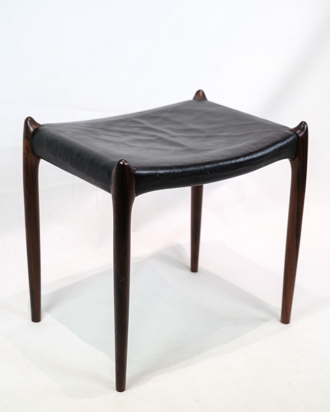 Niels O. Møller's signature style is expressed in the stool's simple and functional design, where each element is carefully coordinated to achieve the perfect balance between aesthetics and functionality. The black leather adds an elegant contrast to the rich rosewood, giving the stool a sophisticated look.