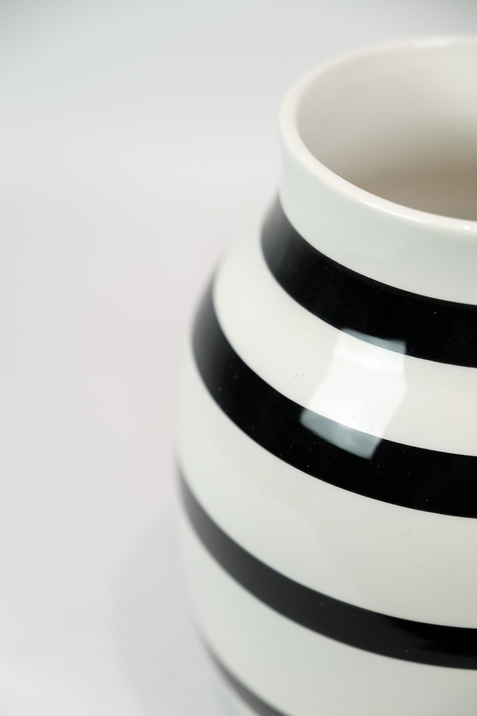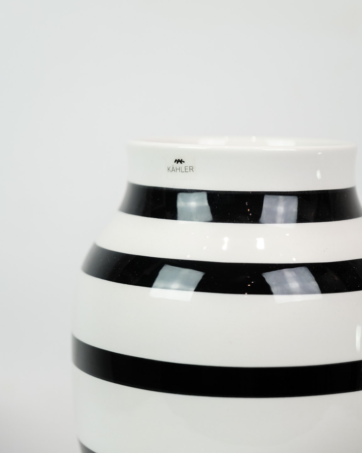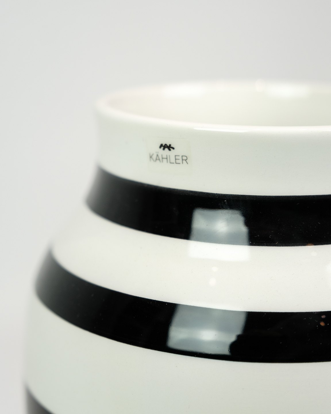 Kähler is an indispensable favorite in countless homes thanks to its classic look and modern design. This beautiful vase, part of a series, is perfect for the Scandinavian home with its simple yet eye-catching expression. Each Kähler vase in the range is hand-painted, meaning no two are exactly alike. The unique charm and personality that comes with the variations in color and width of the stripes make each vase a work of art in itself. Add a touch of elegance and individuality to your home with a Kähler vase that will grace any room with its beauty and uniqueness.