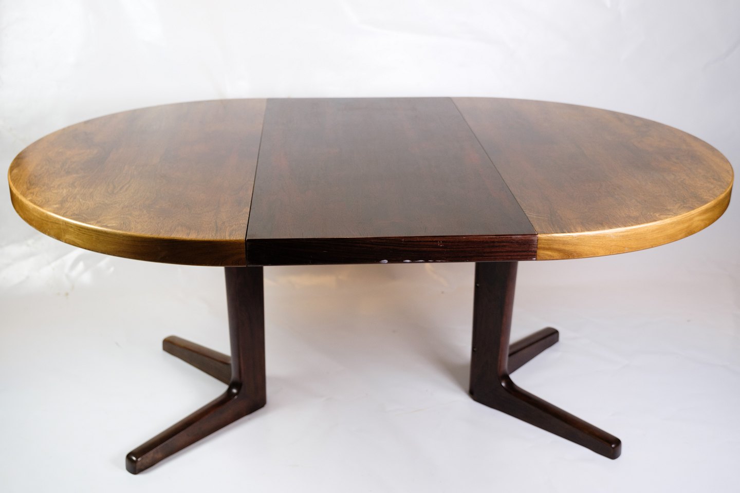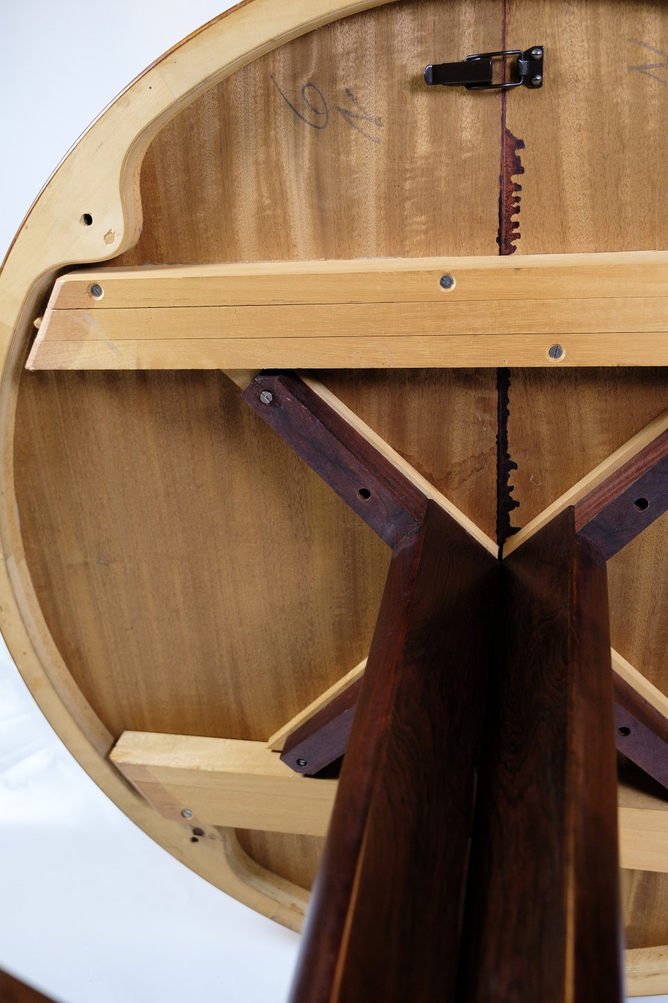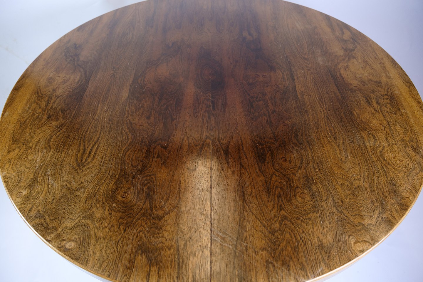 This round dining table in rosewood from 1960, produced by Skovby Møbelfabrik, is a splendid example of Danish furniture art and craftsmanship from the mid-20th century. The rosewood, with its warm and rich color, adds a luxurious feel to any dining room.