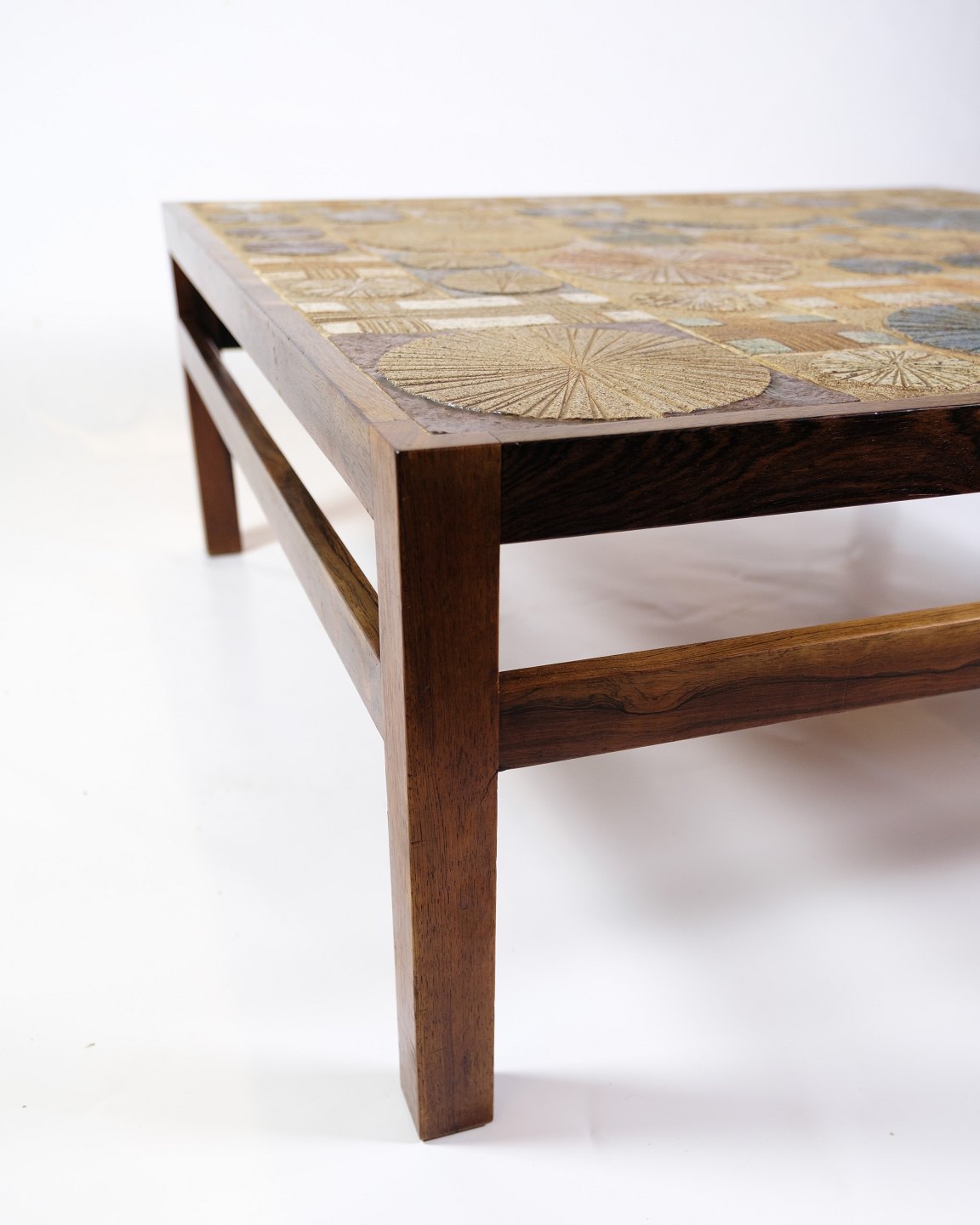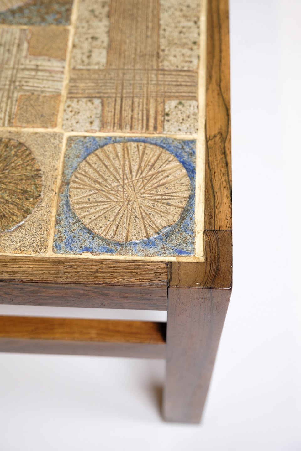 Palisandertømmeret tilføjer varme og naturlig skønhed til bordet, mens keramikken og klinkerne giver det et særligt kunstnerisk præg. Den kontrastfulde kombination af disse materialer skaber et iøjnefaldende visuelt udtryk, der kan tilføre karakter og personlighed til enhver stue.