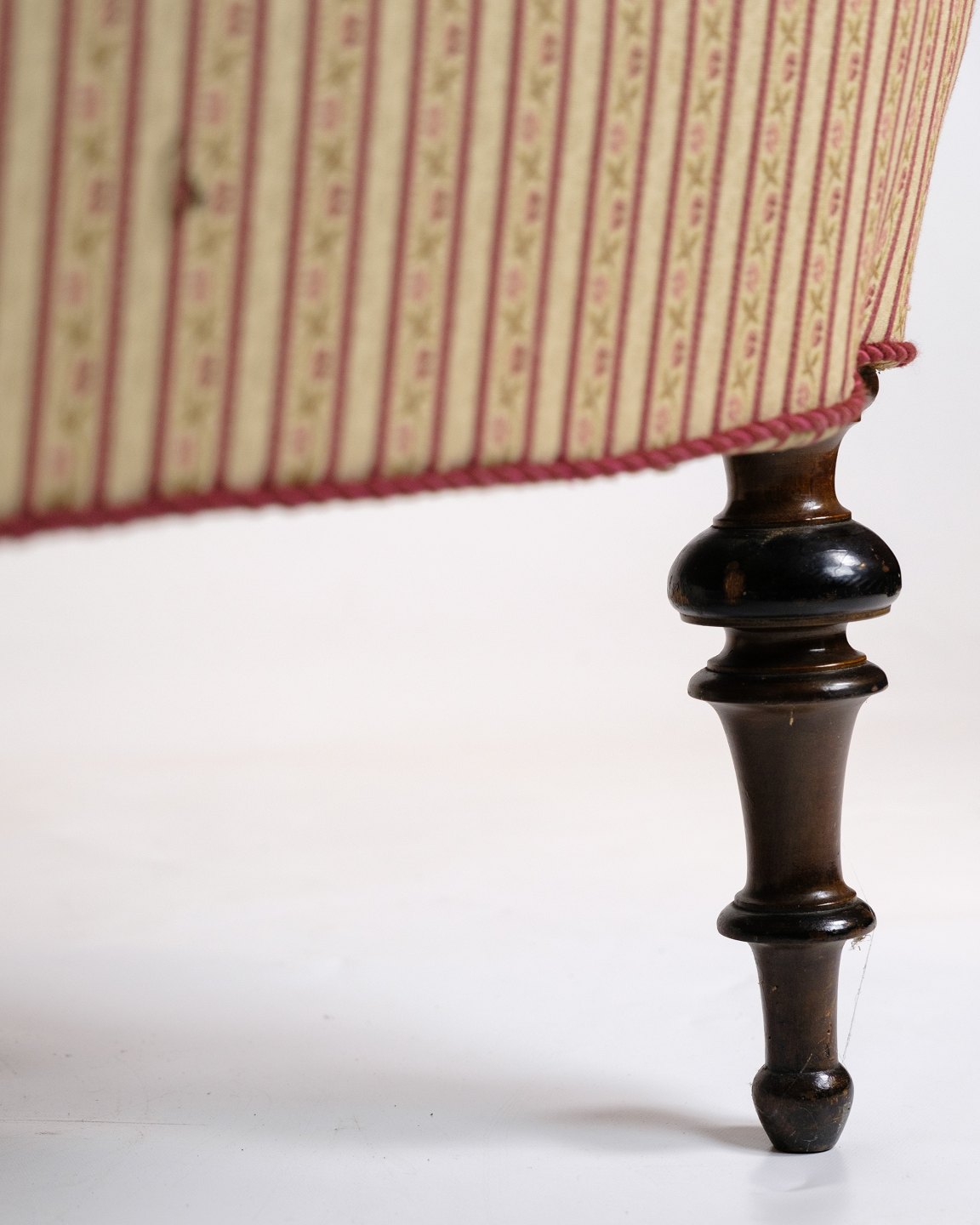 SoldThis antique two-seater sofa from approx. 1890 is a fine example of period craftsmanship and elegance. Made of mahogany wood, the sofa exudes a timeless charm and durability. Upholstered in a beautifully patterned fabric, it adds a touch of elegance and personality to any decor. With its older age, the sofa wears an authentic patina that only adds to its unique appeal. The comfortable seating makes it perfect for relaxing and socializing.