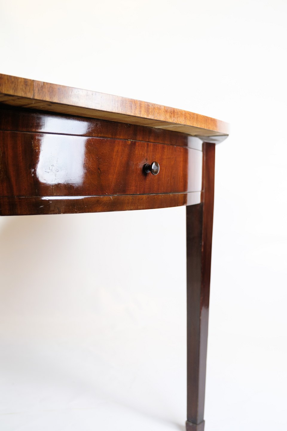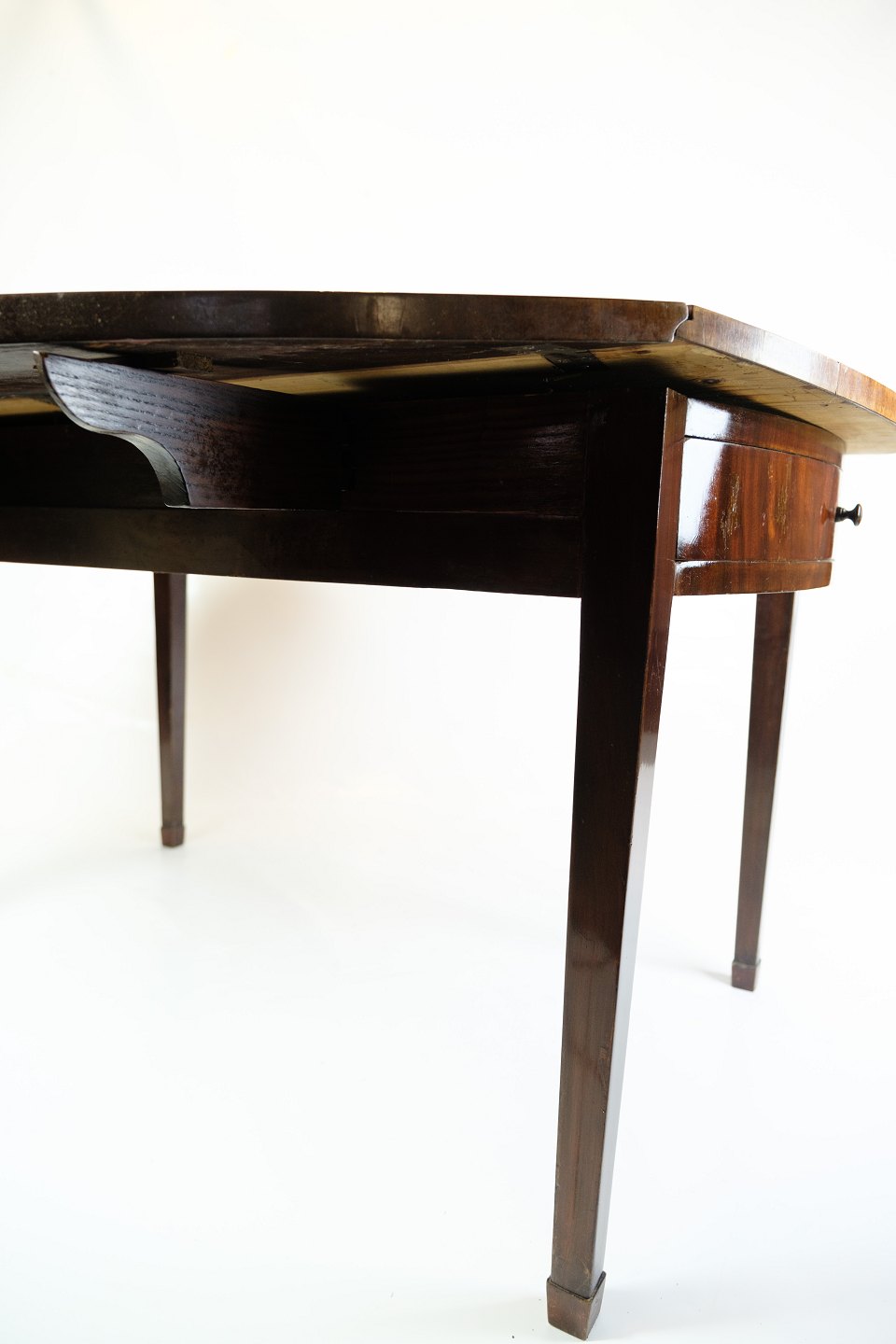 SoldThis antique folding table/dining table from around 1840 is a wonderful example of classic craftsmanship and timeless elegance. Made of polished mahogany wood, the table radiates warmth and beauty with its beautiful wood pattern. The unique design includes a practical drawer that adds functionality to the table. With its older age, the table wears an authentic patina that only adds to its historic appeal.