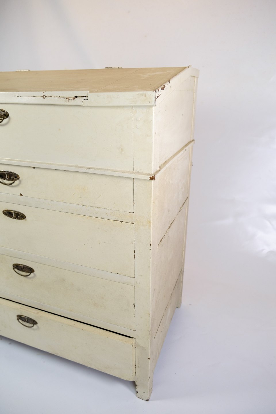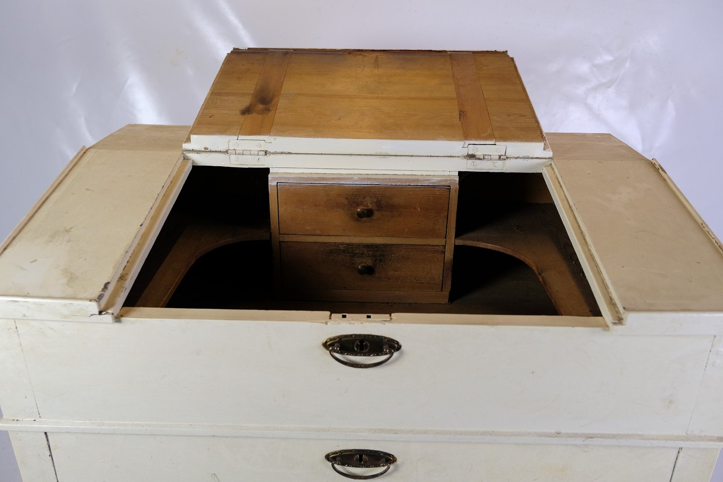 This antique dresser/desk from around 1890 is an impressive piece of furniture history. With its white painted finish, it exudes a timeless elegance and charm. The five spacious drawers offer practical storage space for various items, while the versatile design makes it suitable for both storage and work purposes. The chest's older age contributes to its authentic patina and historic appeal, making it an impressive element in any room.