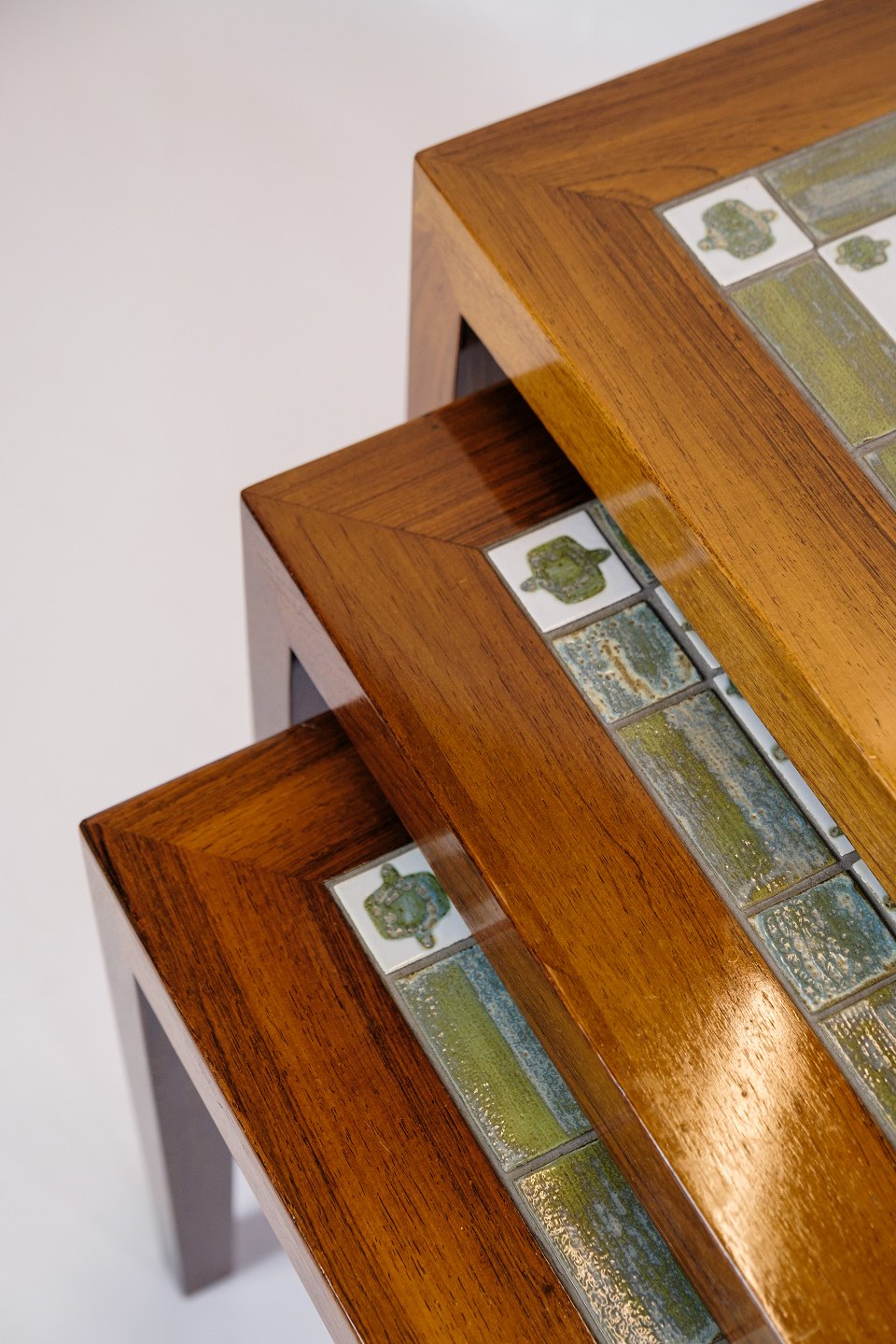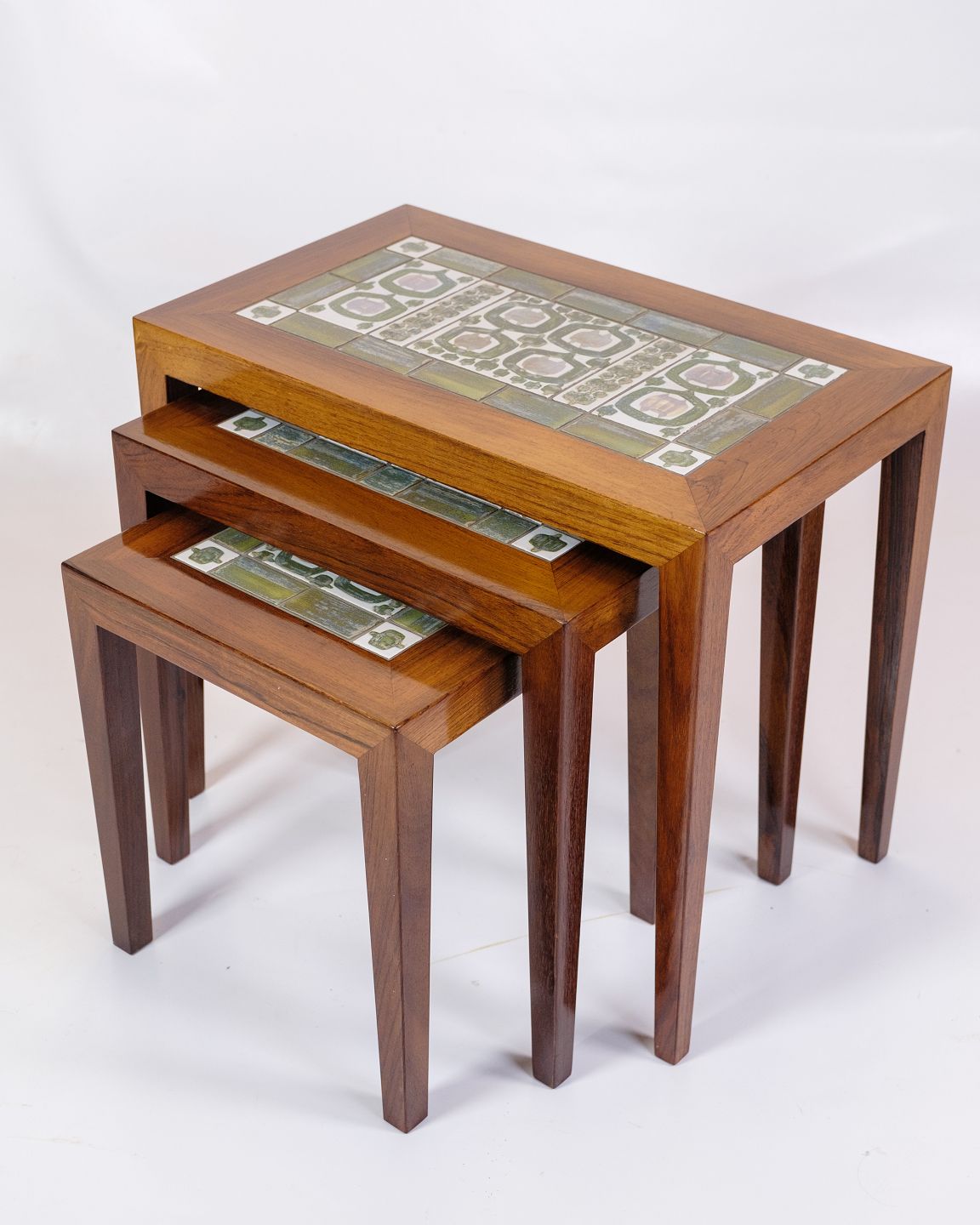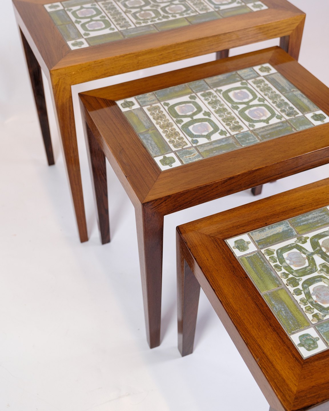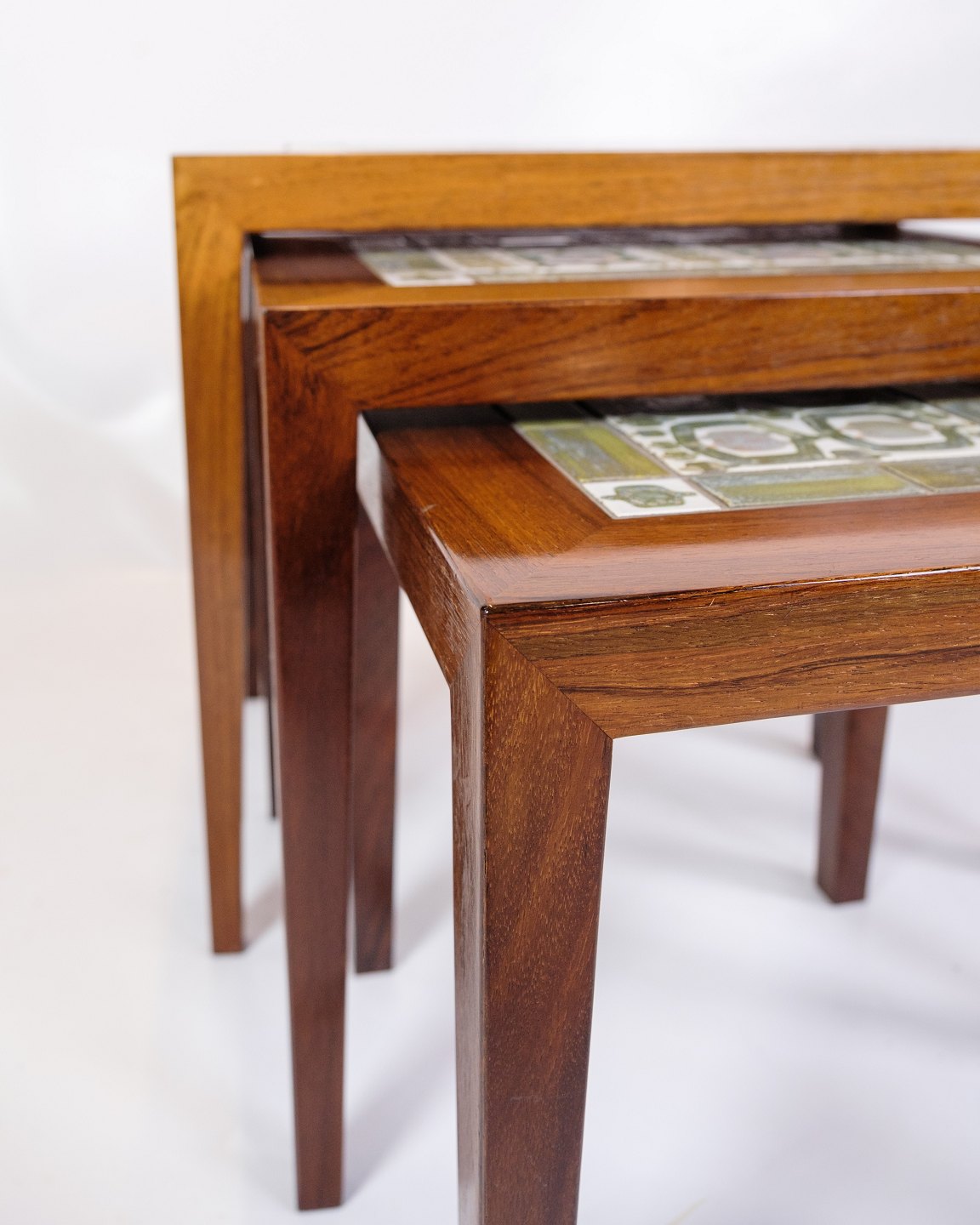 The Royal Copenhagen tiles add an extra dimension of sophistication and artistic value to the tables. The tiles are known for their fine porcelain and detailed, hand-painted decorations. The combination of rosewood and the decorative tiles creates a harmonious balance between functionality and aesthetics.