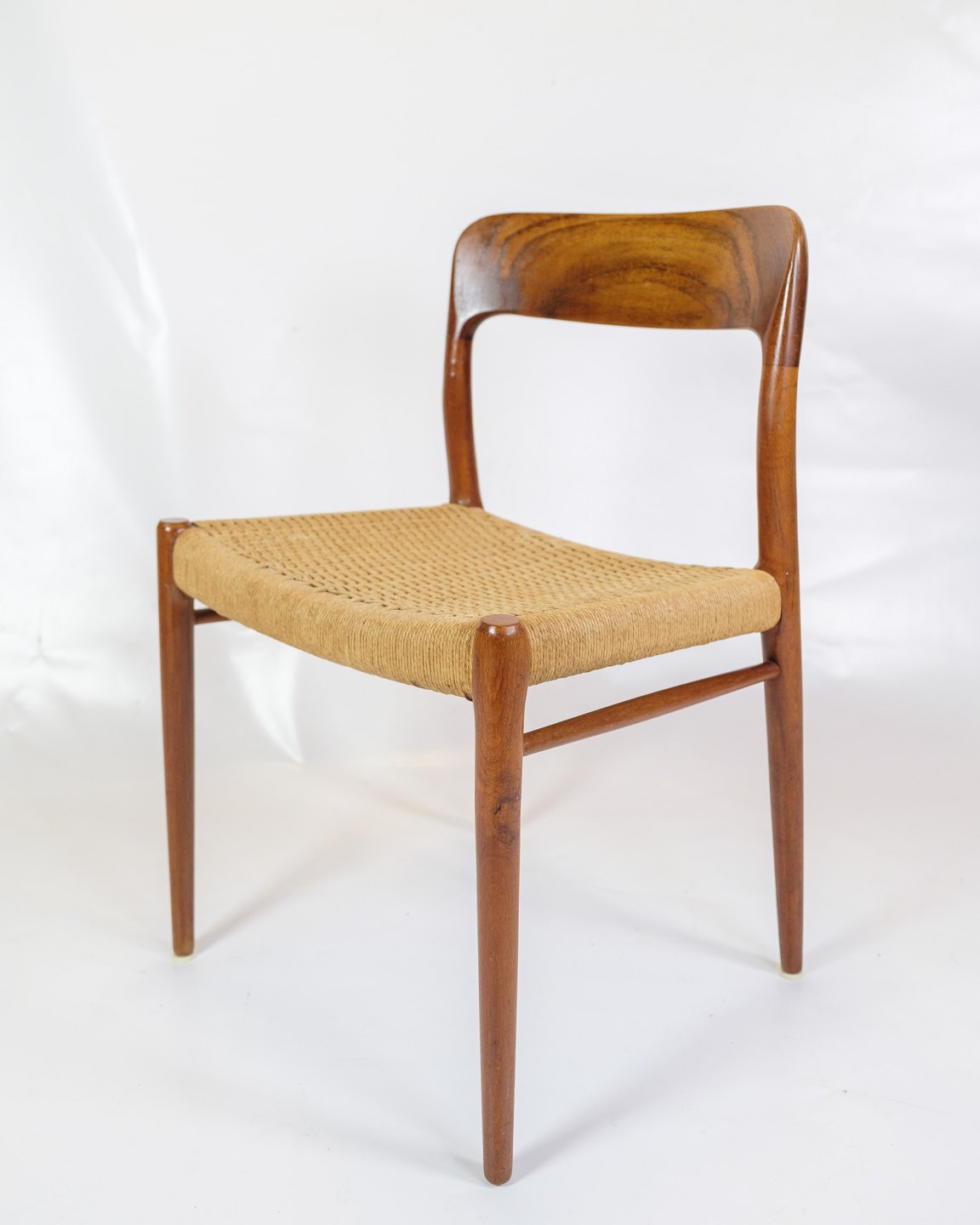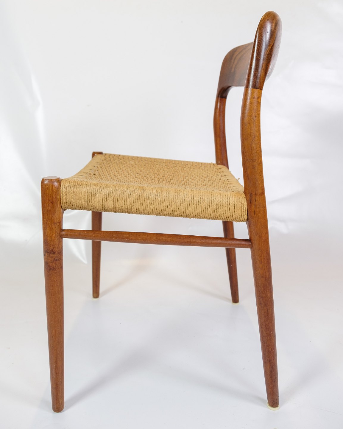 SolgtDette sæt af fem spisestuestole, model 75, designet af Niels Otto Møller i 1960'erne, er et fremragende eksempel på dansk mid-century modern design. Stolene kombinerer teaktræets naturlige skønhed med papirflet, hvilket skaber en elegant og tidløs æstetik.