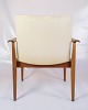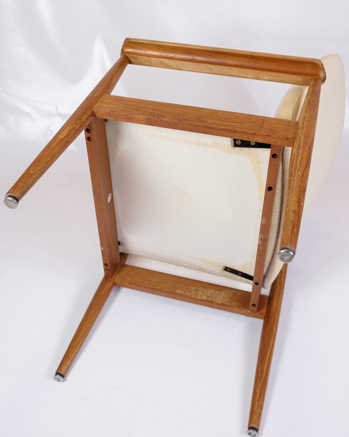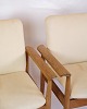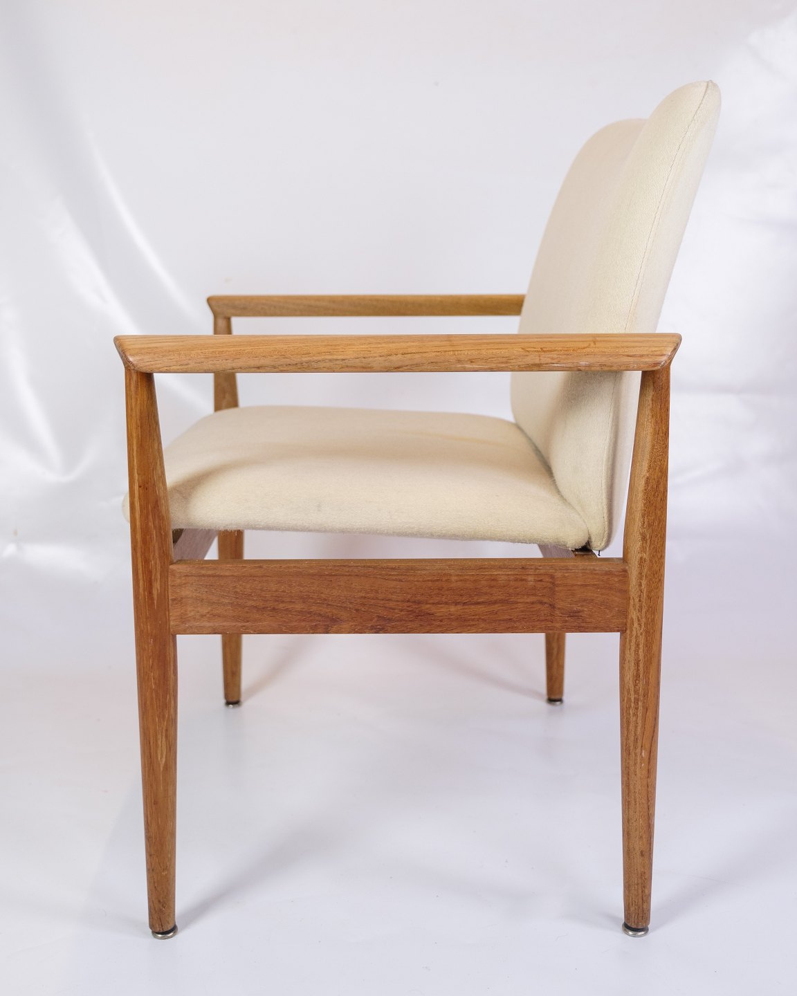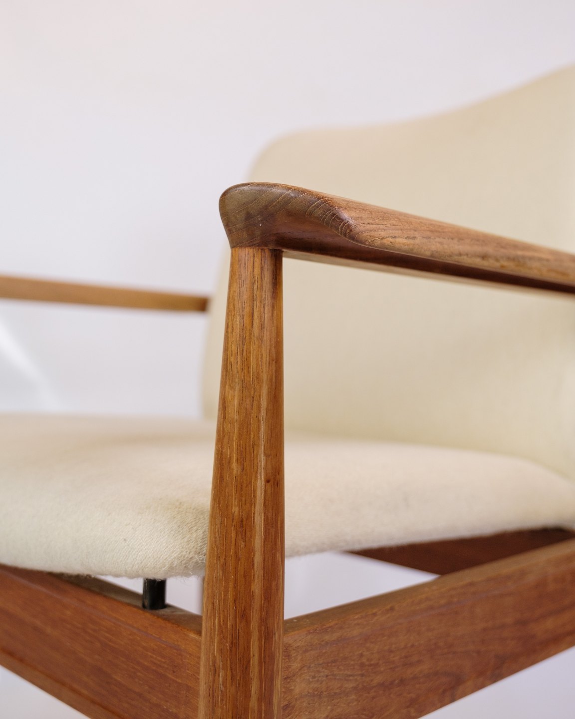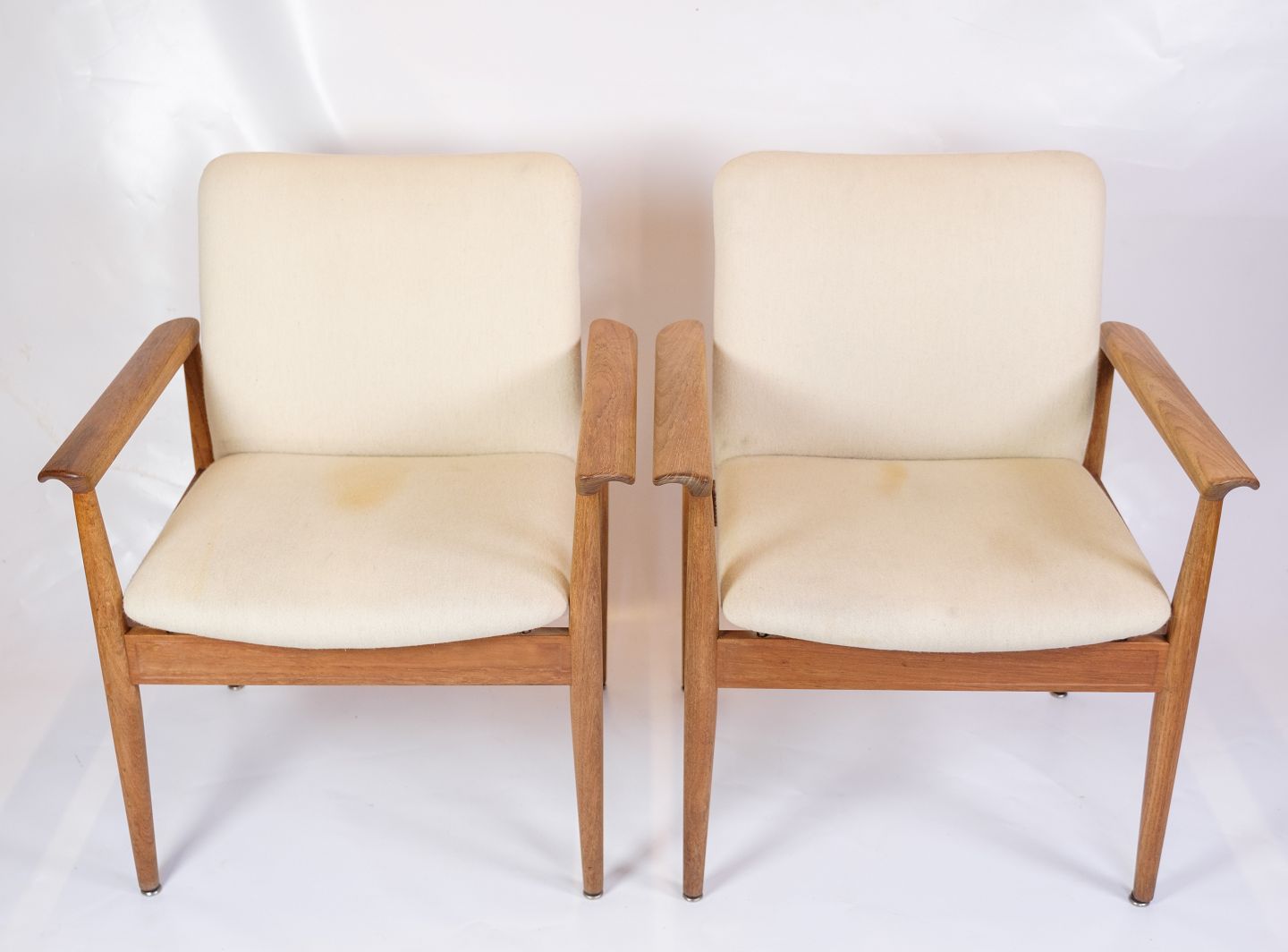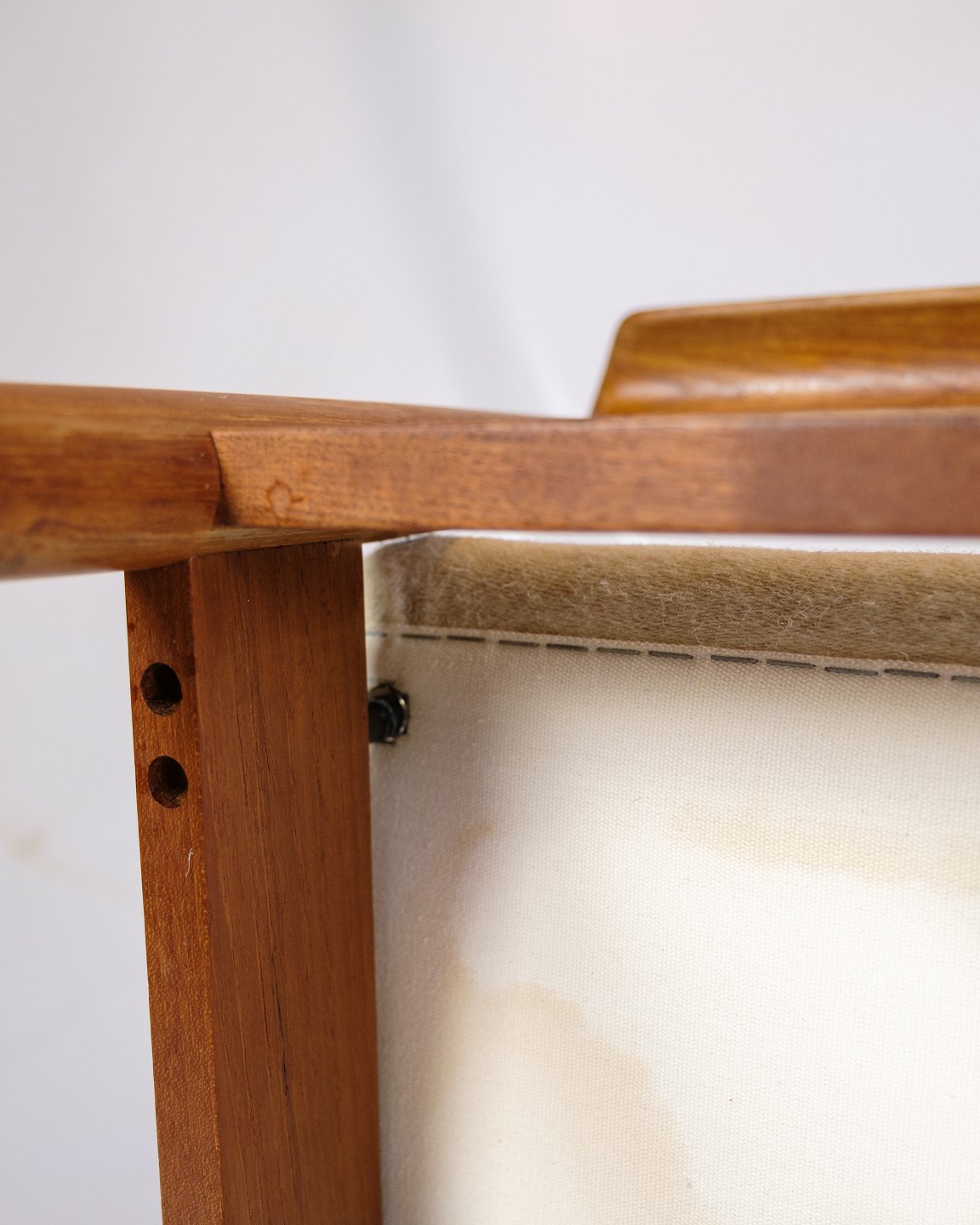 Betrukket i lyst uldstof, tilbyder disse hvilestole både komfort og stil. Det lyse stof skaber en smuk kontrast til teaktræet, hvilket giver stolene et frisk og moderne udseende, der stadig føles klassisk og tidløst. Uldstoffet er valgt for sin holdbarhed og blødhed, hvilket sikrer, at stolene forbliver behagelige og attraktive over tid.