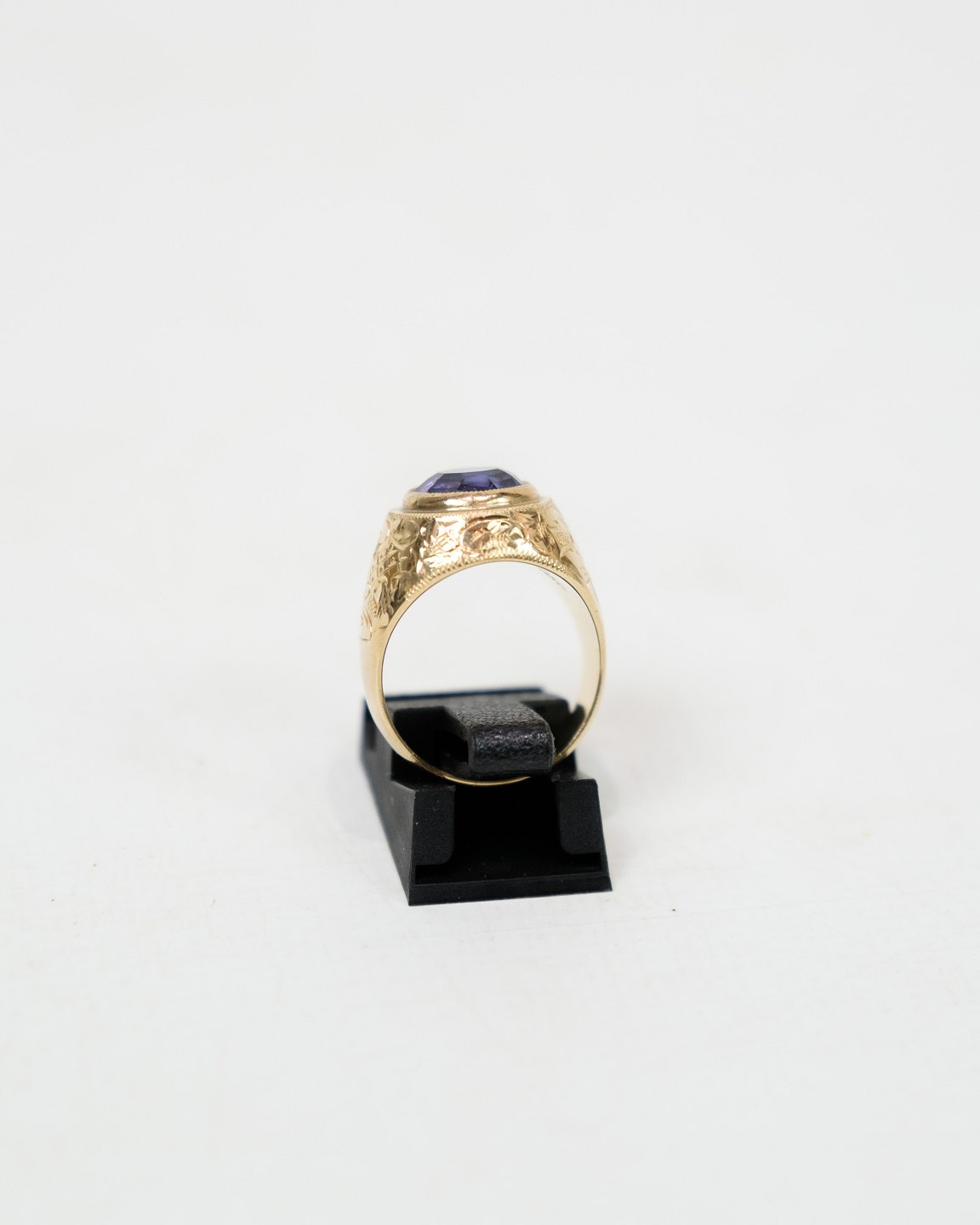 This ring is made of 14 carat gold and decorated with a beautiful amethyst. The ring is stamped with CHRISTMAS. Amethyst is known for its beautiful and rich purple hues and is a popular gemstone.