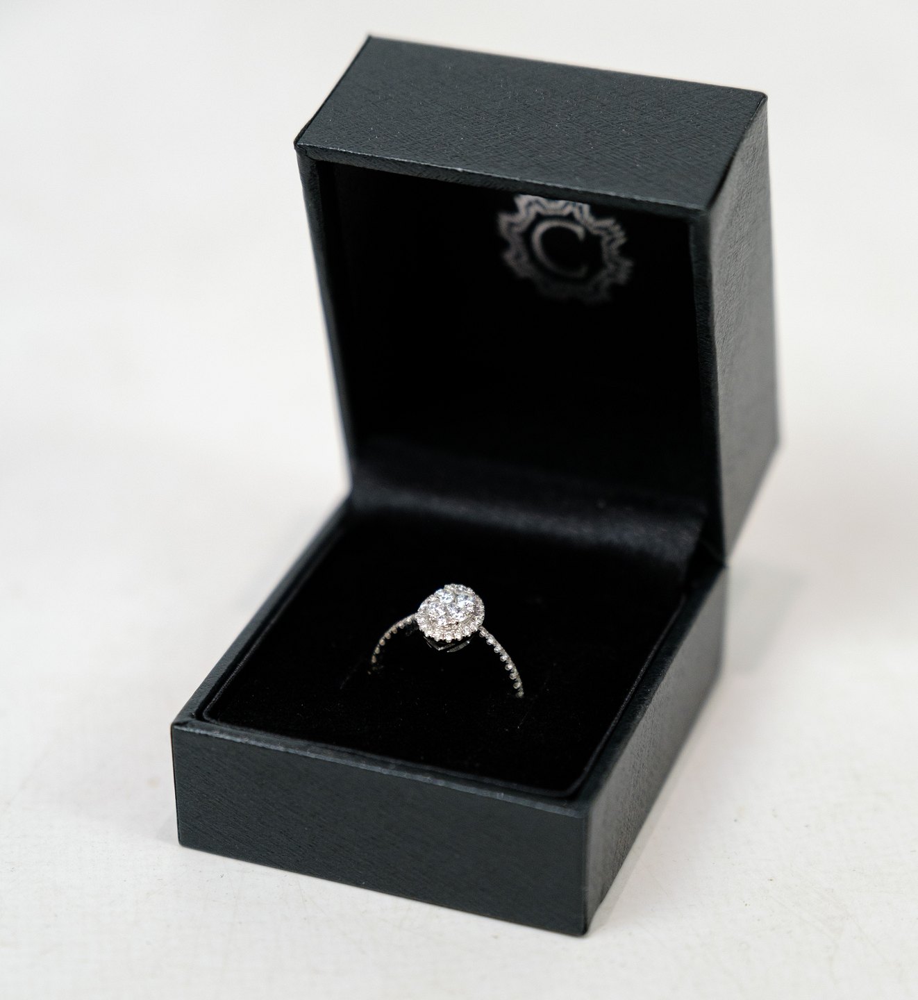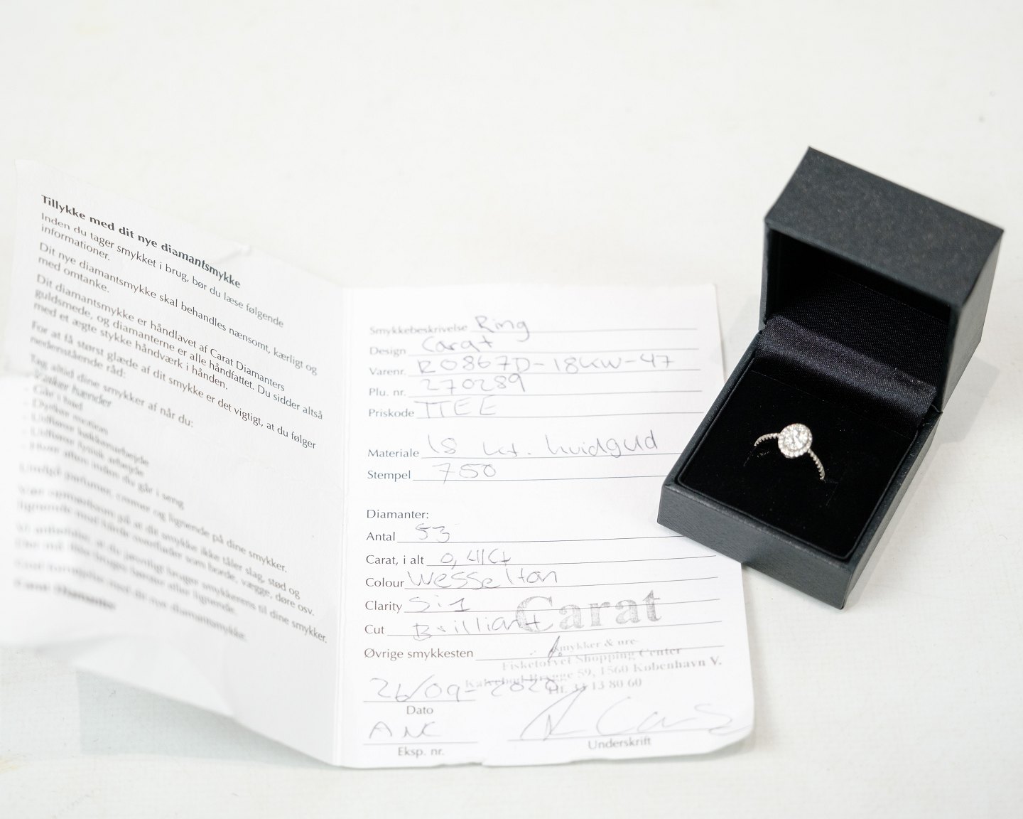 SoldA beautiful diamond ring, handmade by Carat Diamanter's skilled goldsmiths. The ring is made of 18 carat white gold, decorated with 53 diamonds, all of which are hand-set. The ring comes with both an original box and a jewelry certificate, which confirms its authenticity and quality.