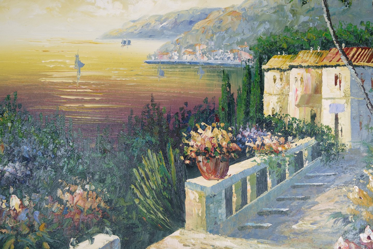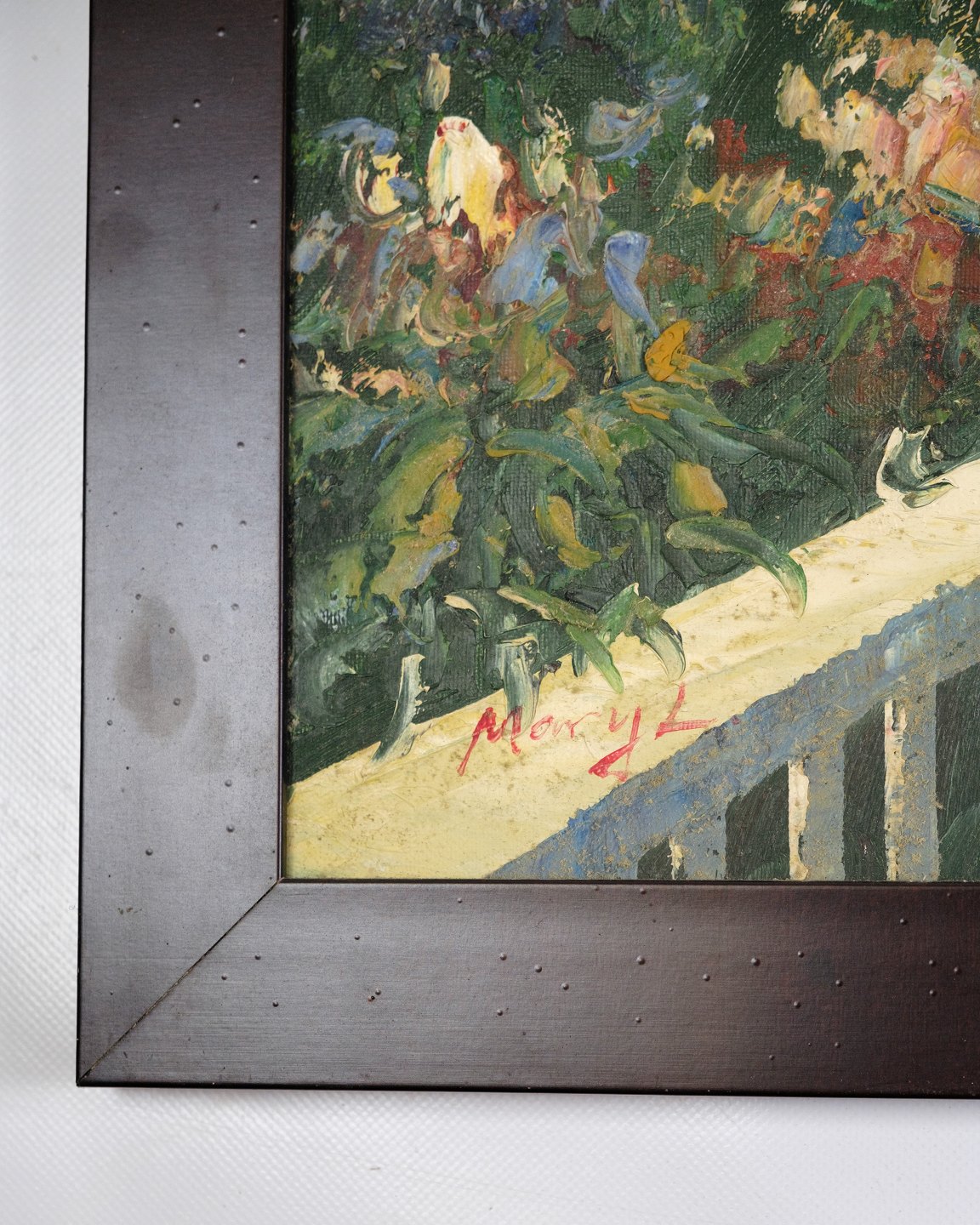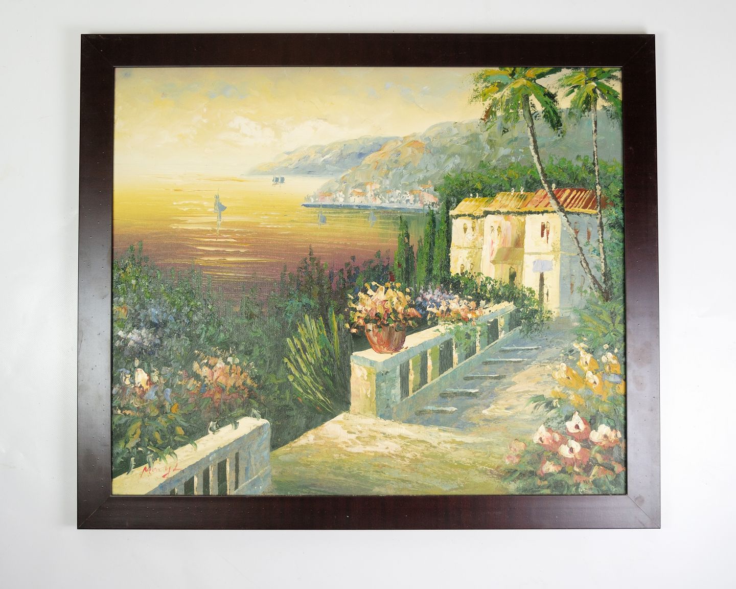 Oil painting framed in a black wooden frame with motif of a coastal town with warm colors. Signed by Mary L.