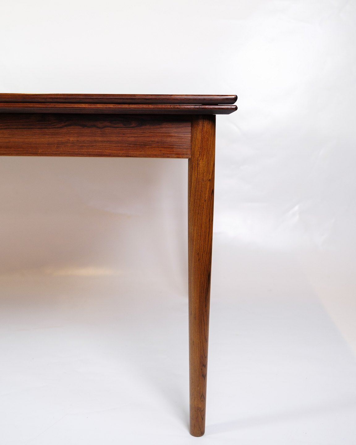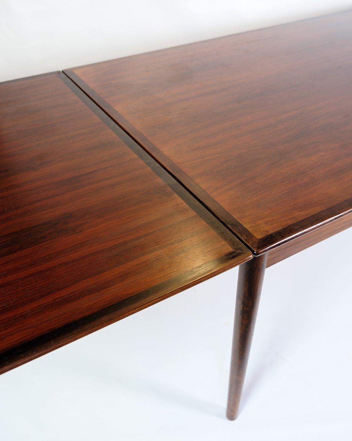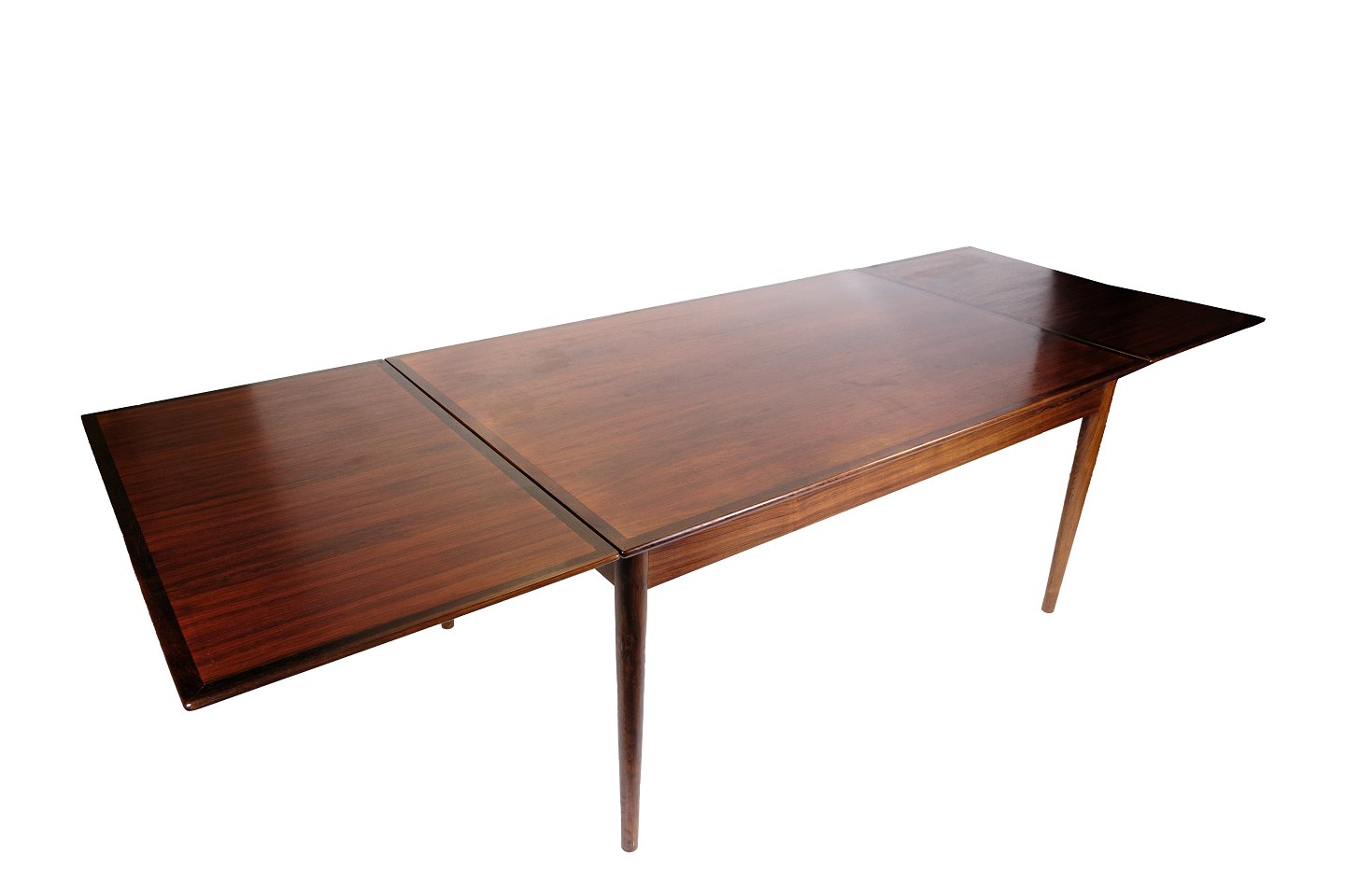 SolgtStort spisebord fra 1960'erne, udført i palisander med to udtræksplader. Bordet fremstår i meget pæn stand, og de praktiske udtræksplader giver mulighed for at udvide bordpladsen ved behov. Det smukke palisandertræ tilføjer en elegant og tidløs æstetik, der passer ind i mange typer af indretninger.