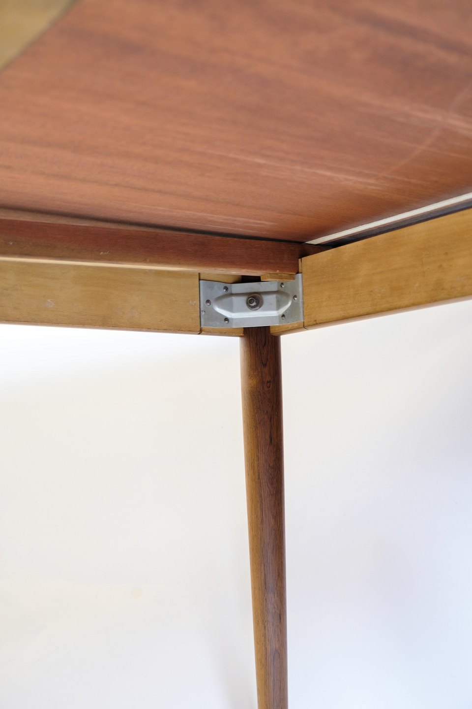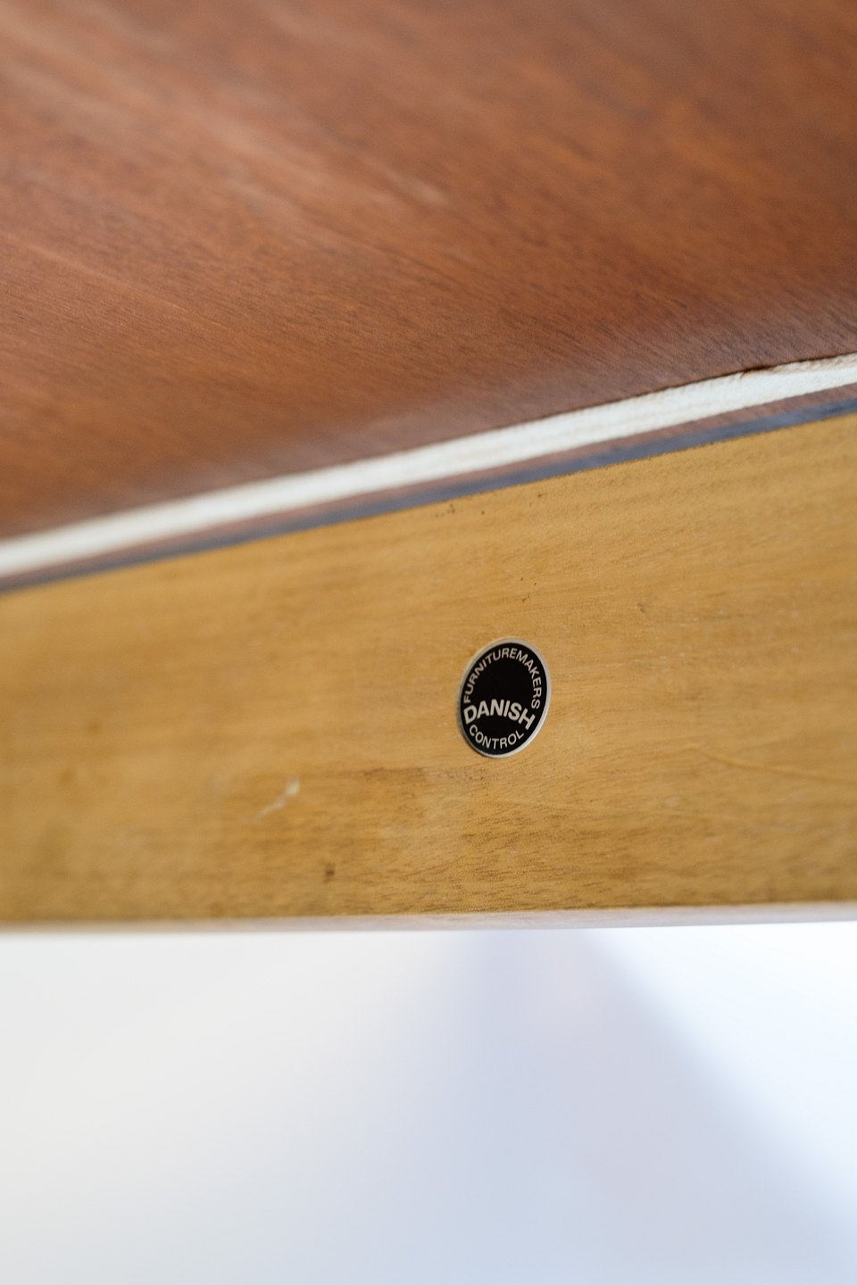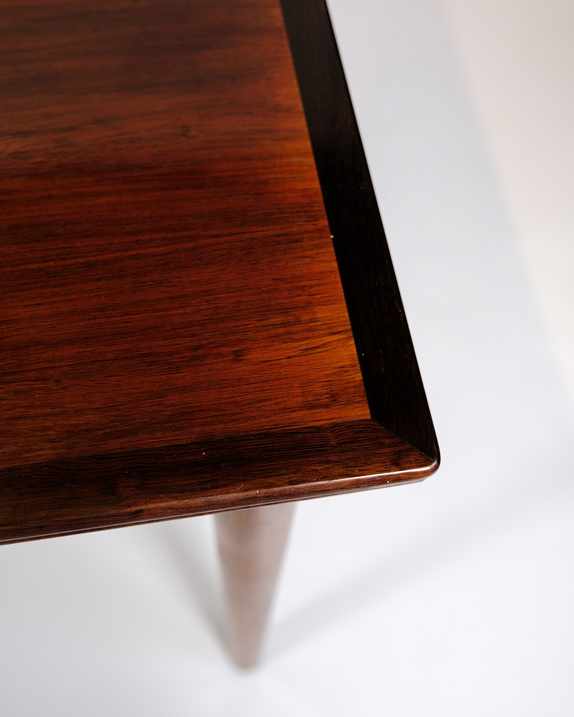 SolgtStort spisebord fra 1960'erne, udført i palisander med to udtræksplader. Bordet fremstår i meget pæn stand, og de praktiske udtræksplader giver mulighed for at udvide bordpladsen ved behov. Det smukke palisandertræ tilføjer en elegant og tidløs æstetik, der passer ind i mange typer af indretninger.